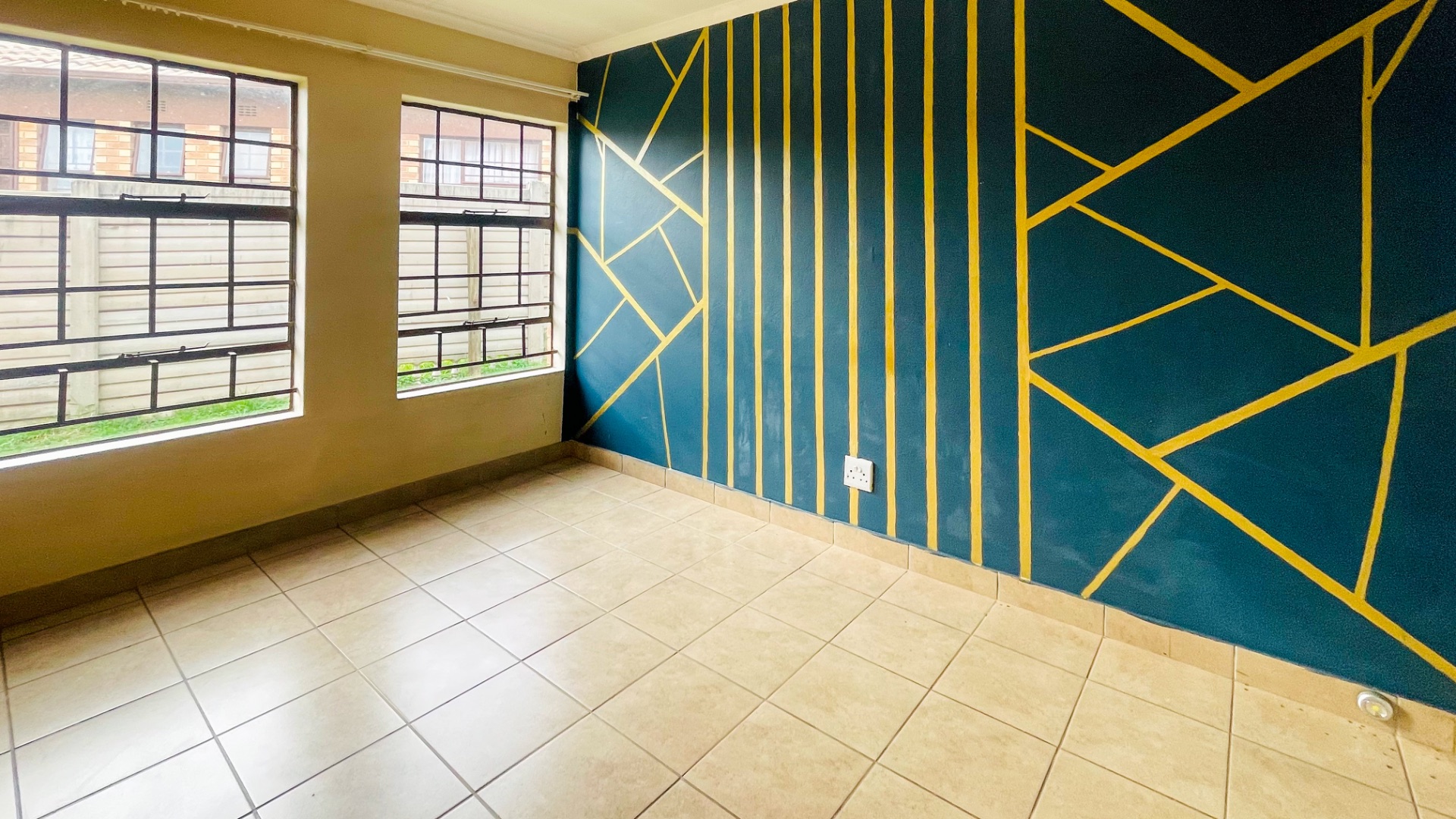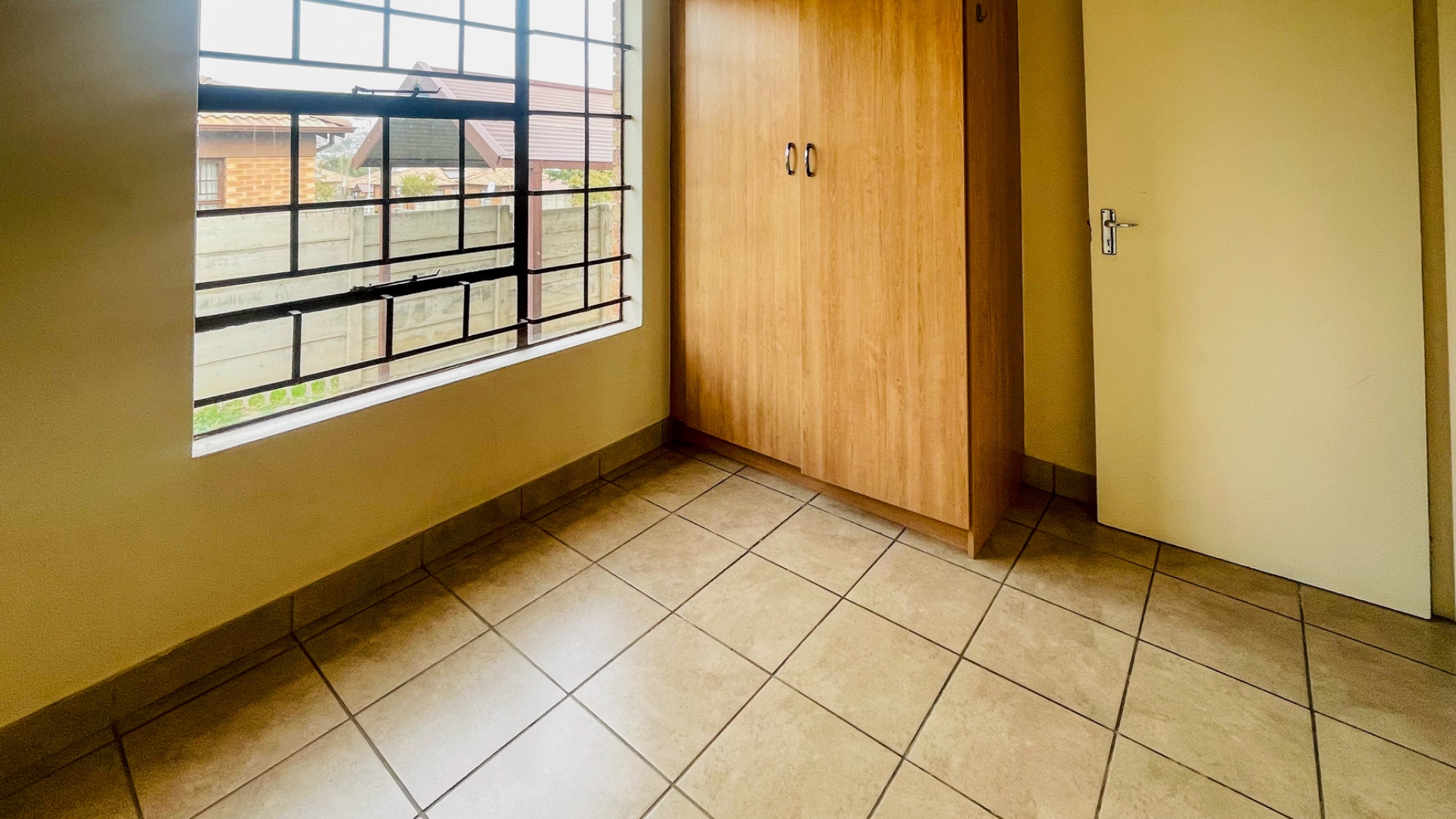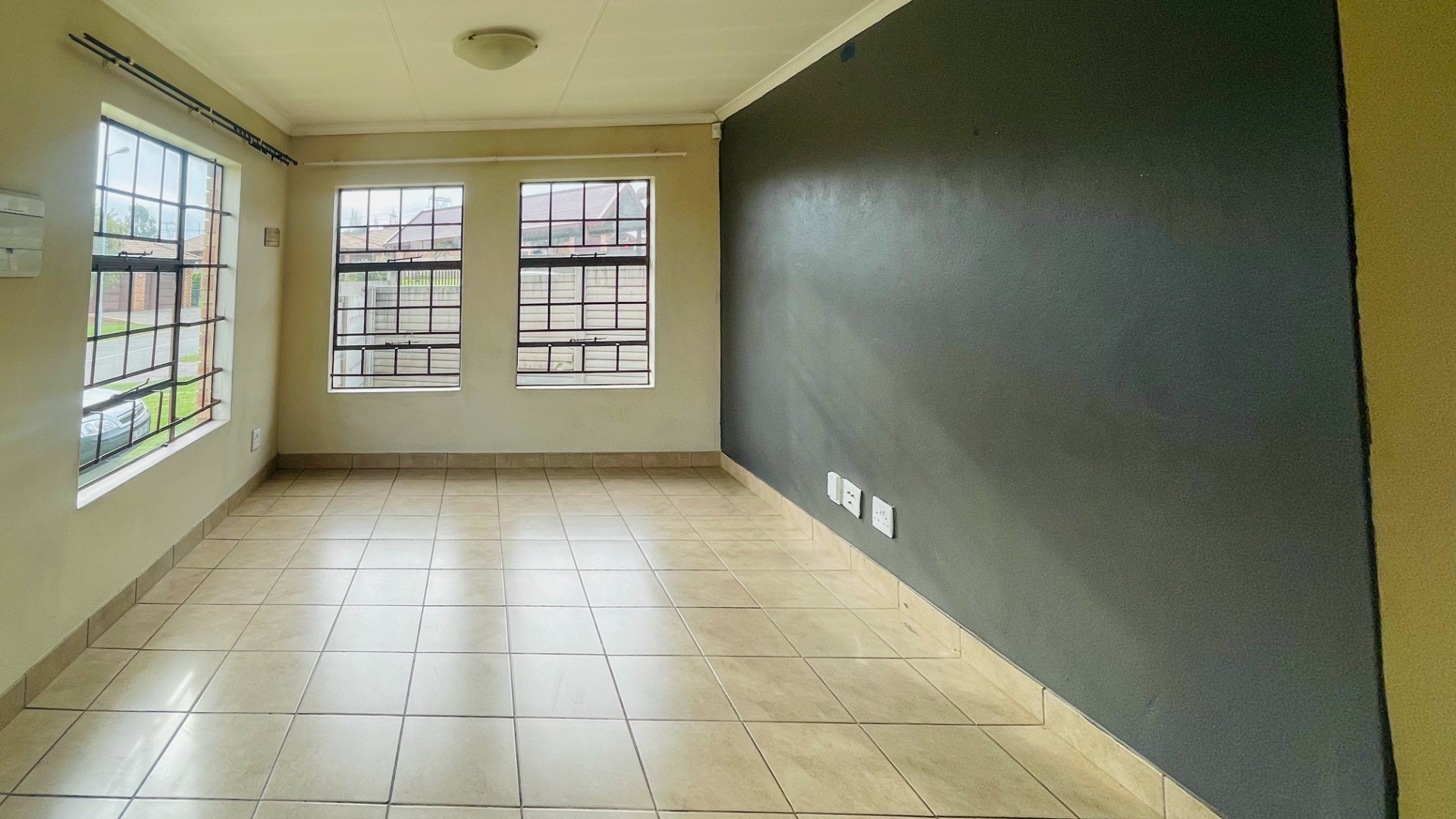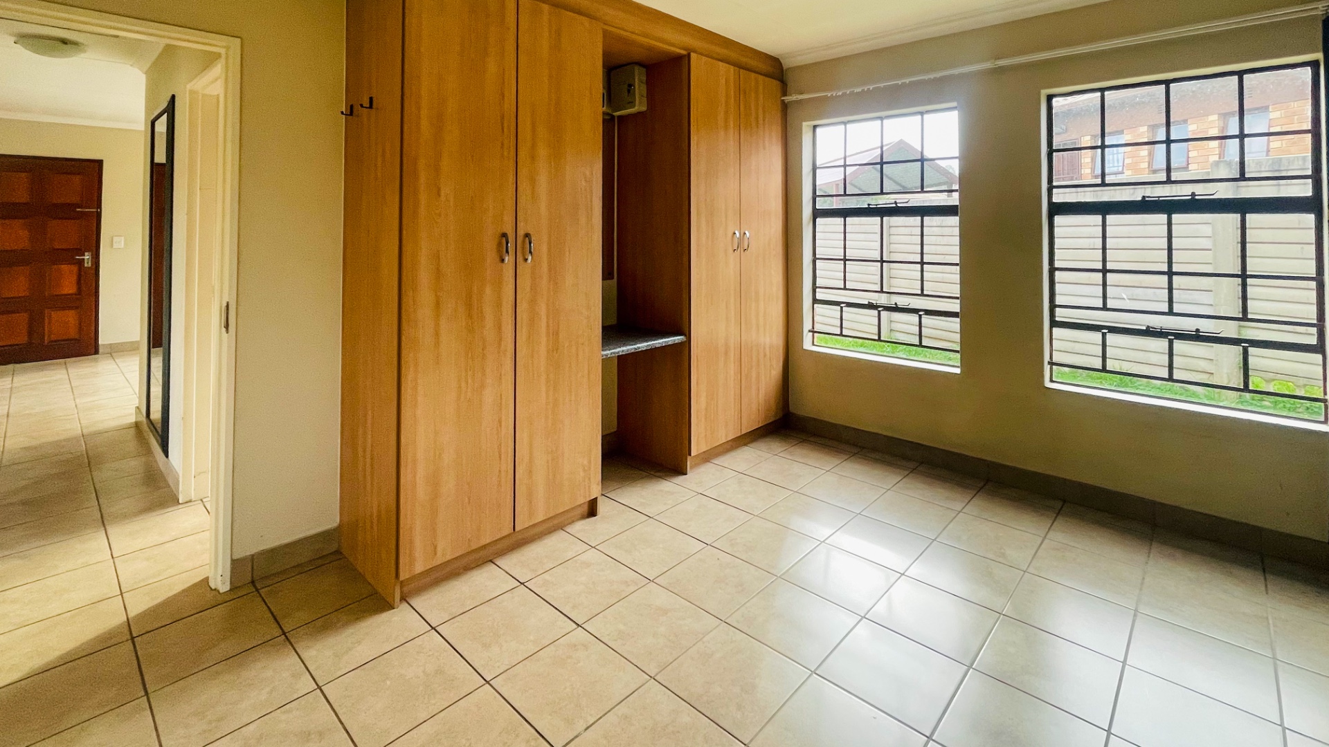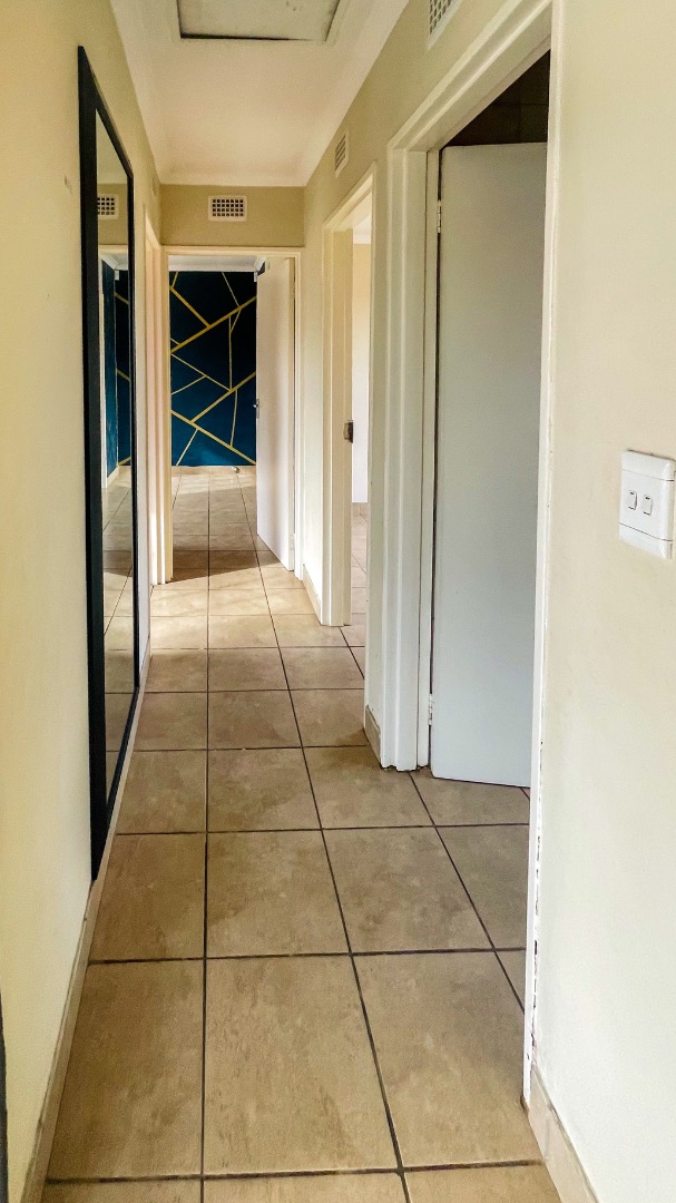 The home comprises three well-proportioned bedrooms, each featuring tiled flooring and ample natural light, with some rooms benefiting from modern accent walls. Security bars on the windows provide an additional layer of protection. The property includes two bathrooms, one of which is an en-suite, ensuring privacy and convenience for residents.