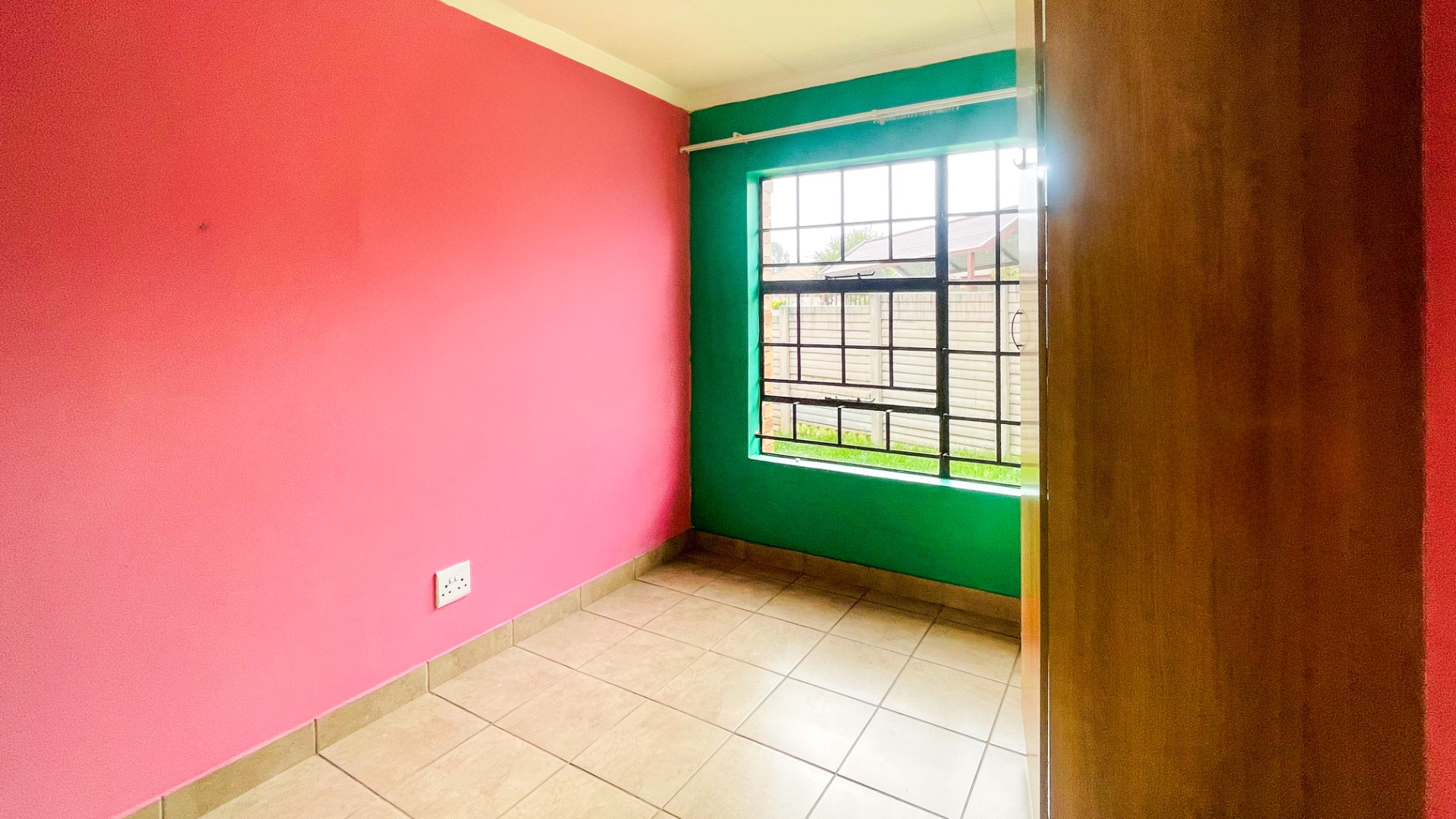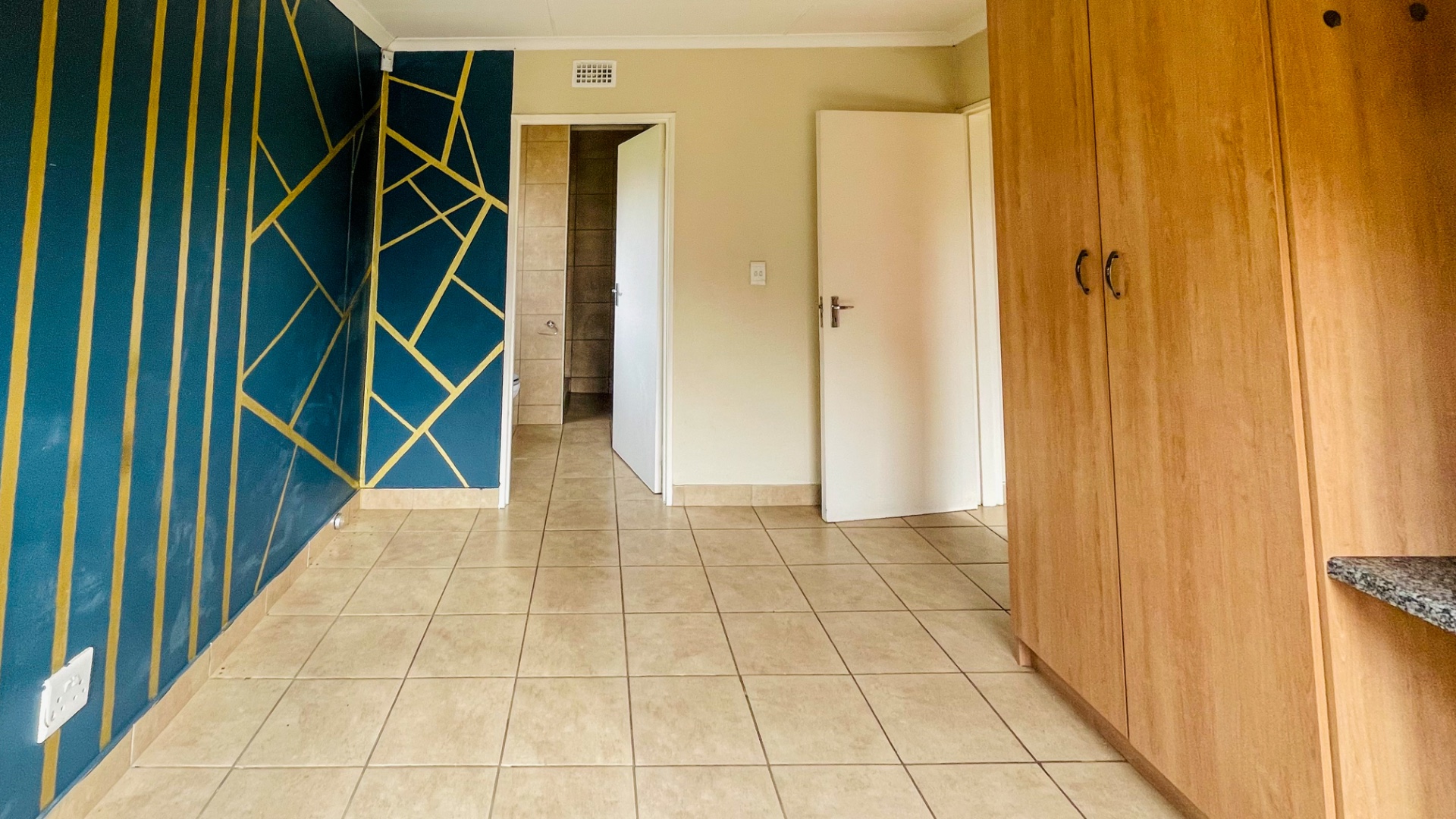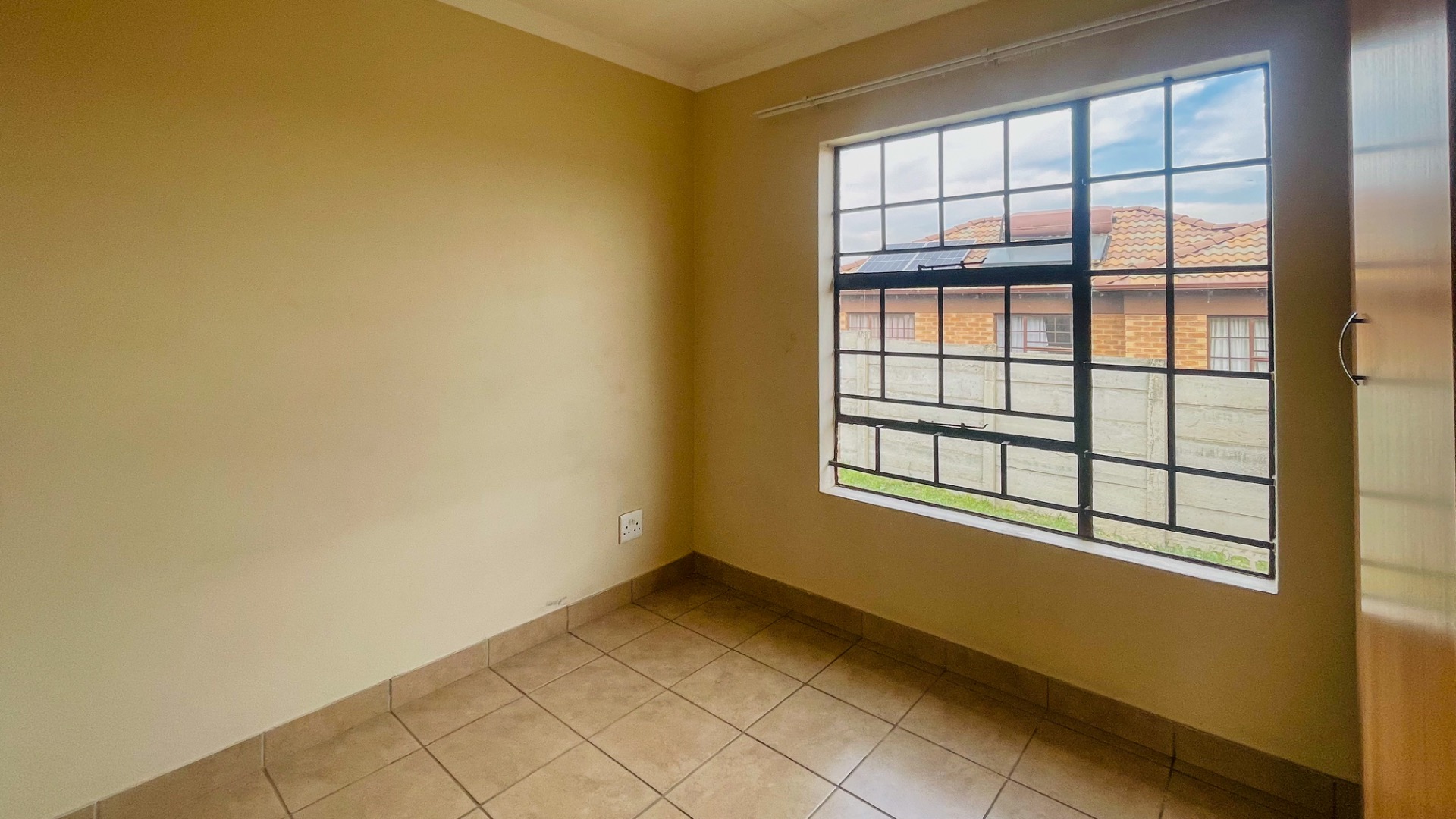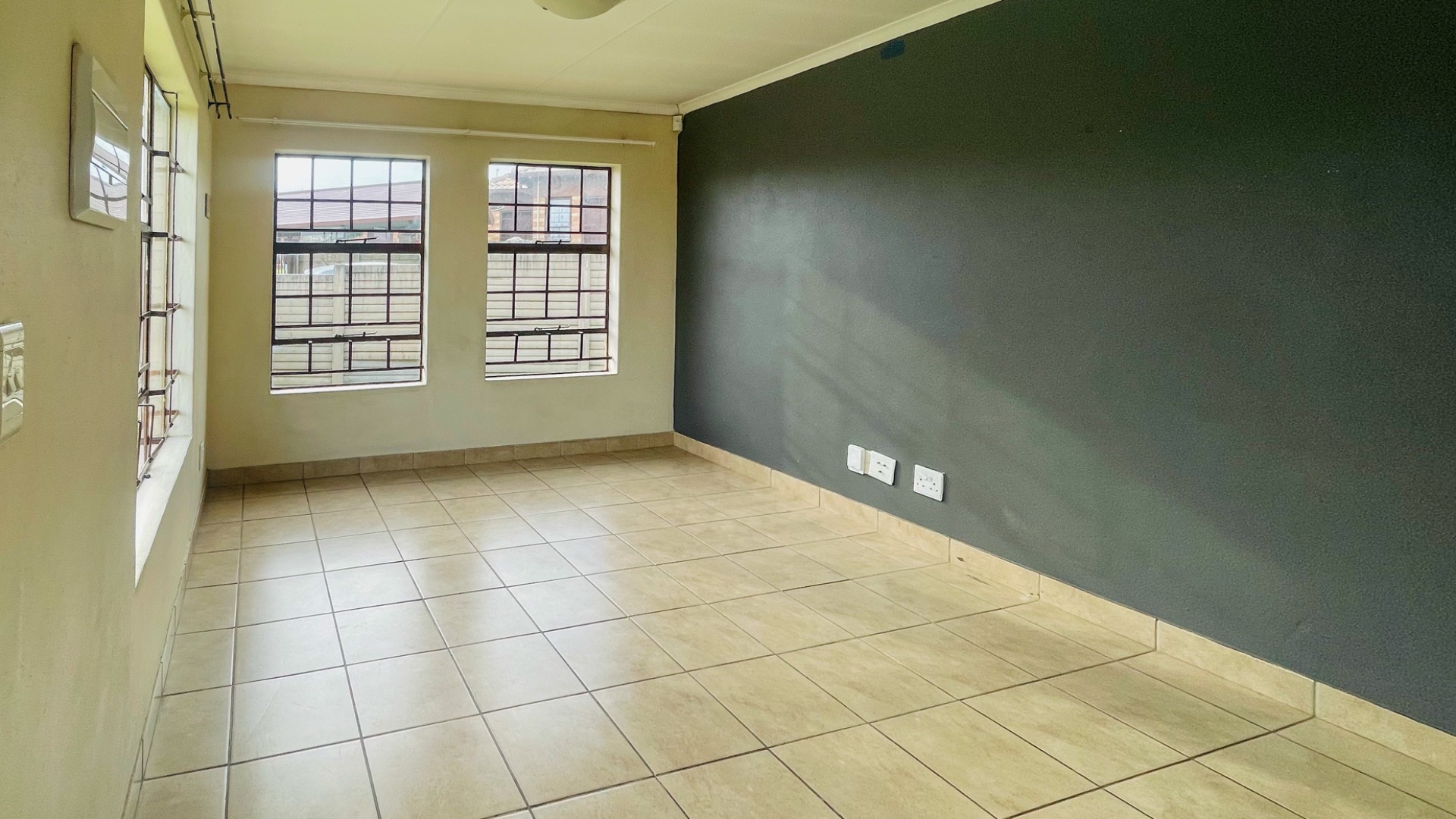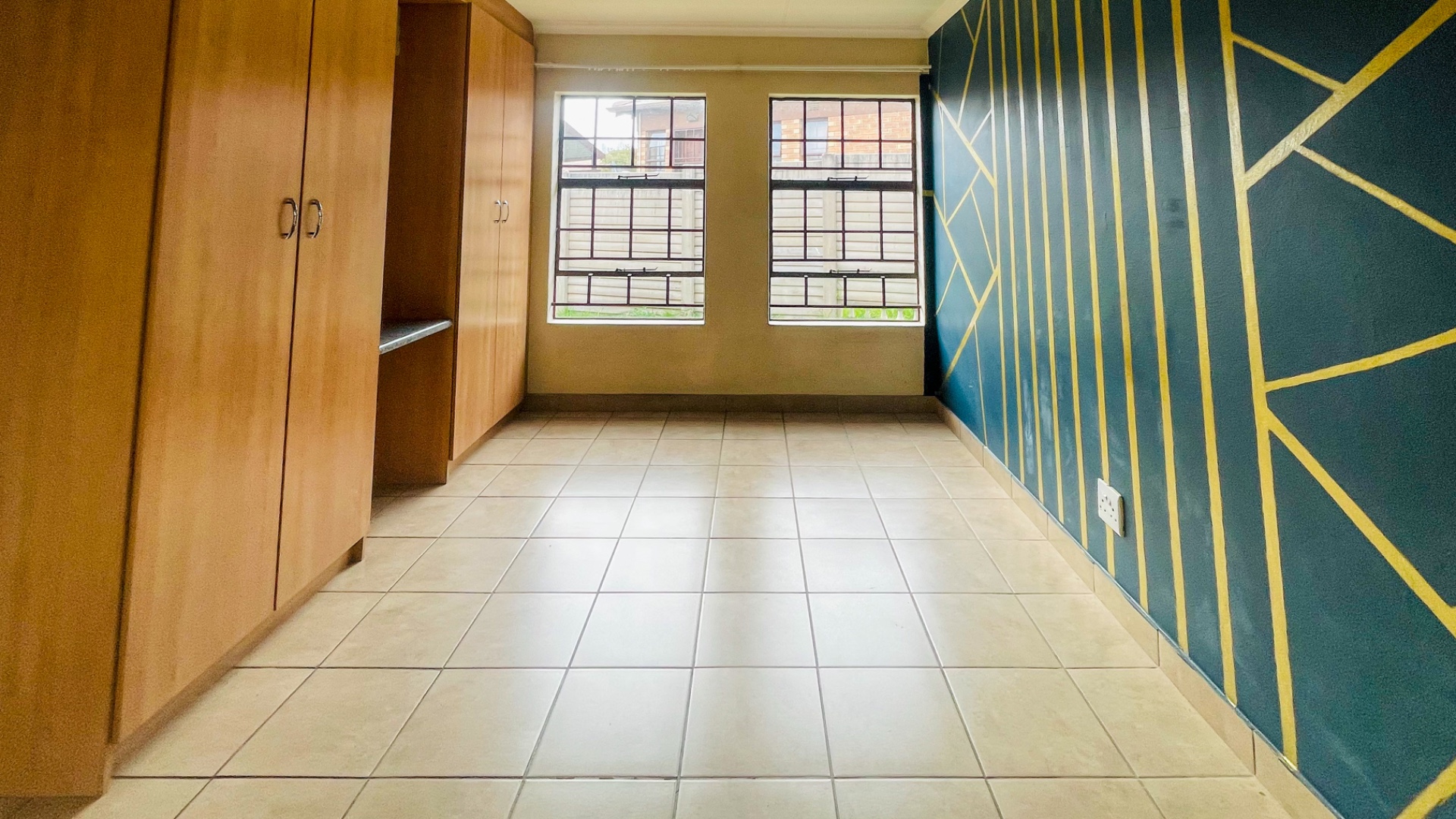 The home comprises three well-proportioned bedrooms, each featuring tiled flooring and ample natural light, with some rooms benefiting from modern accent walls. Security bars on the windows provide an additional layer of protection. The property includes two bathrooms, one of which is an en-suite, ensuring privacy and convenience for residents.