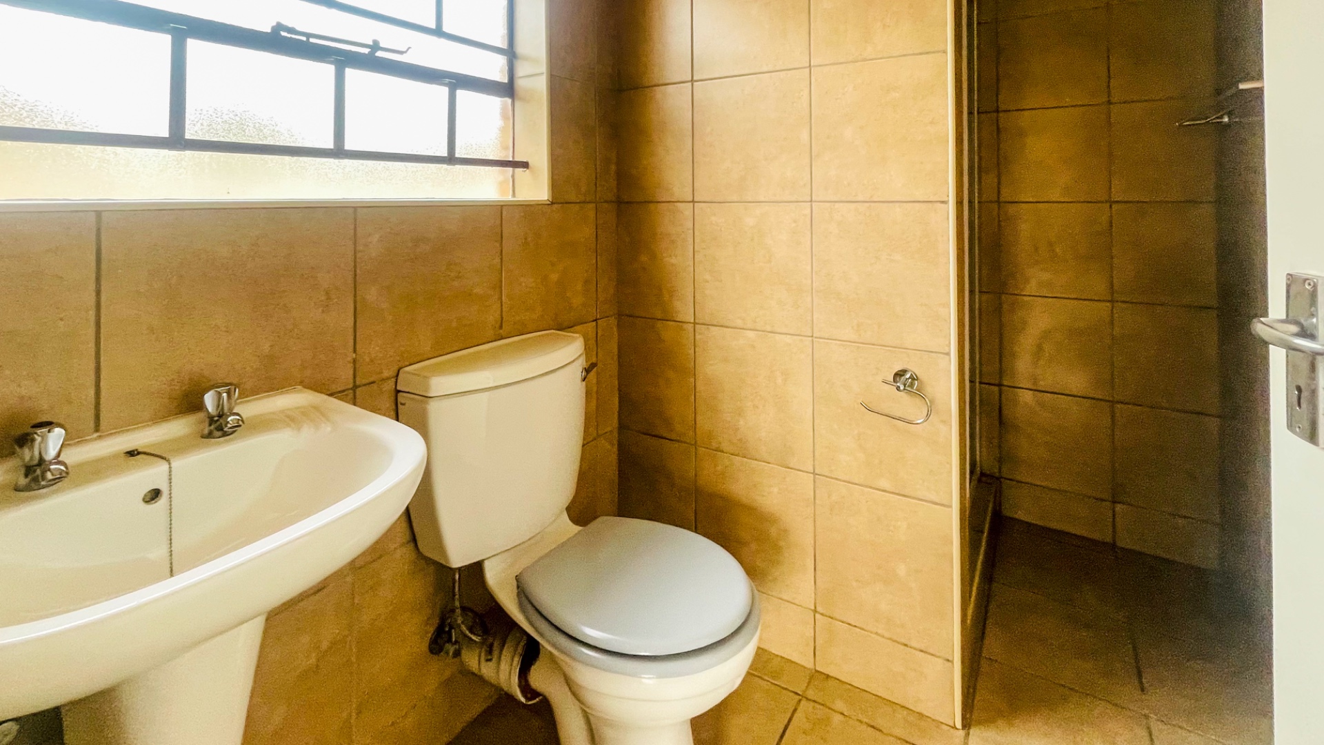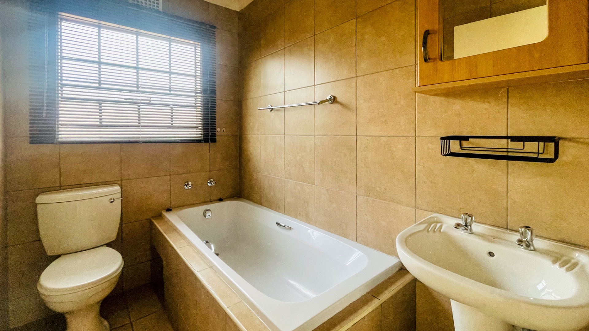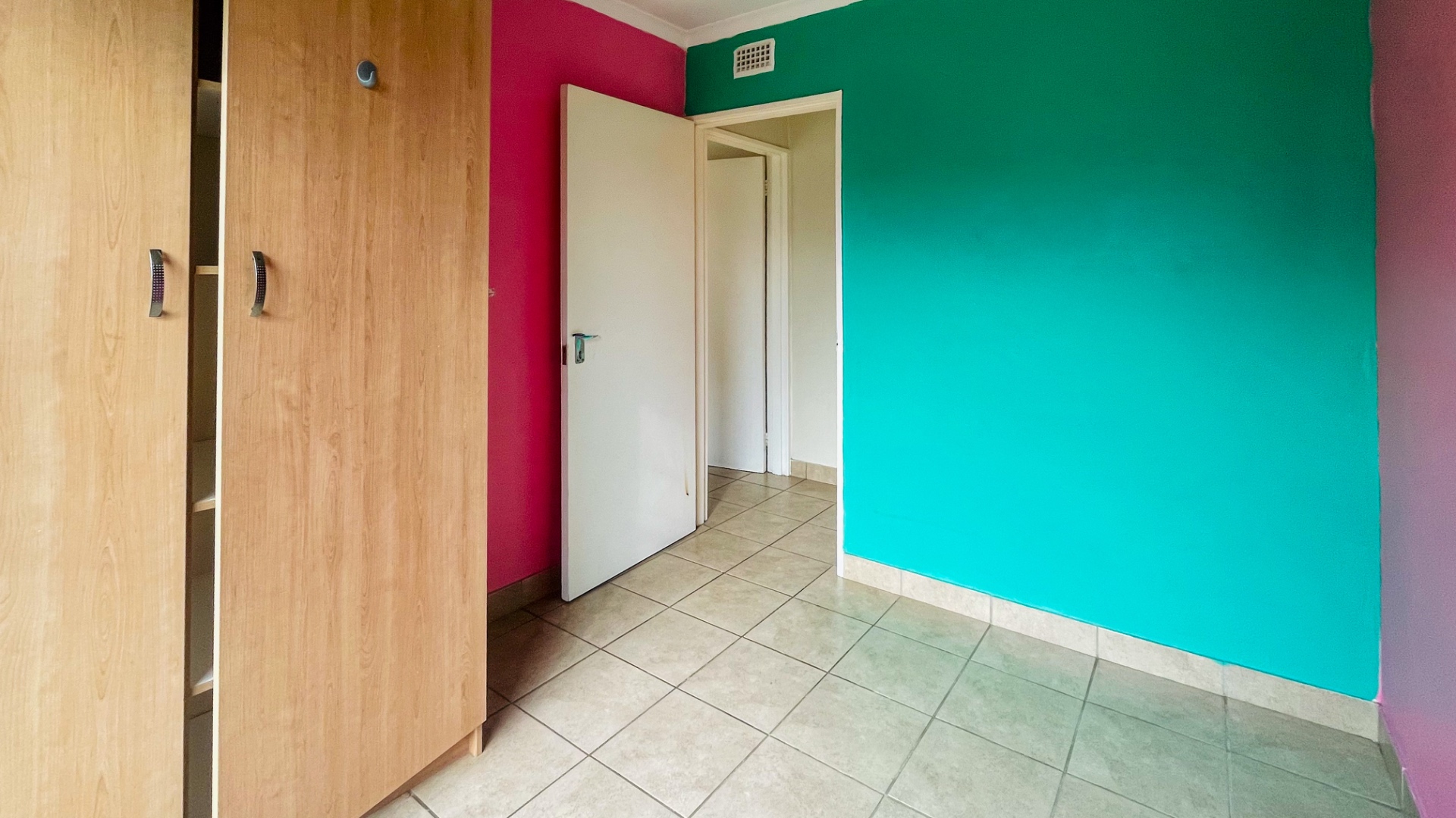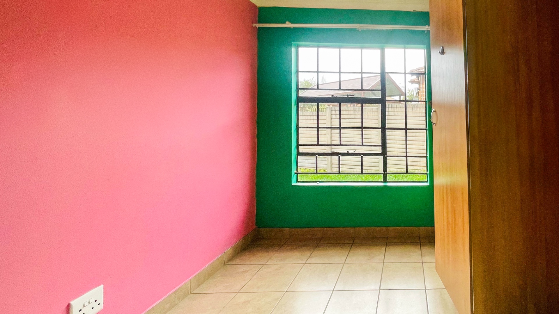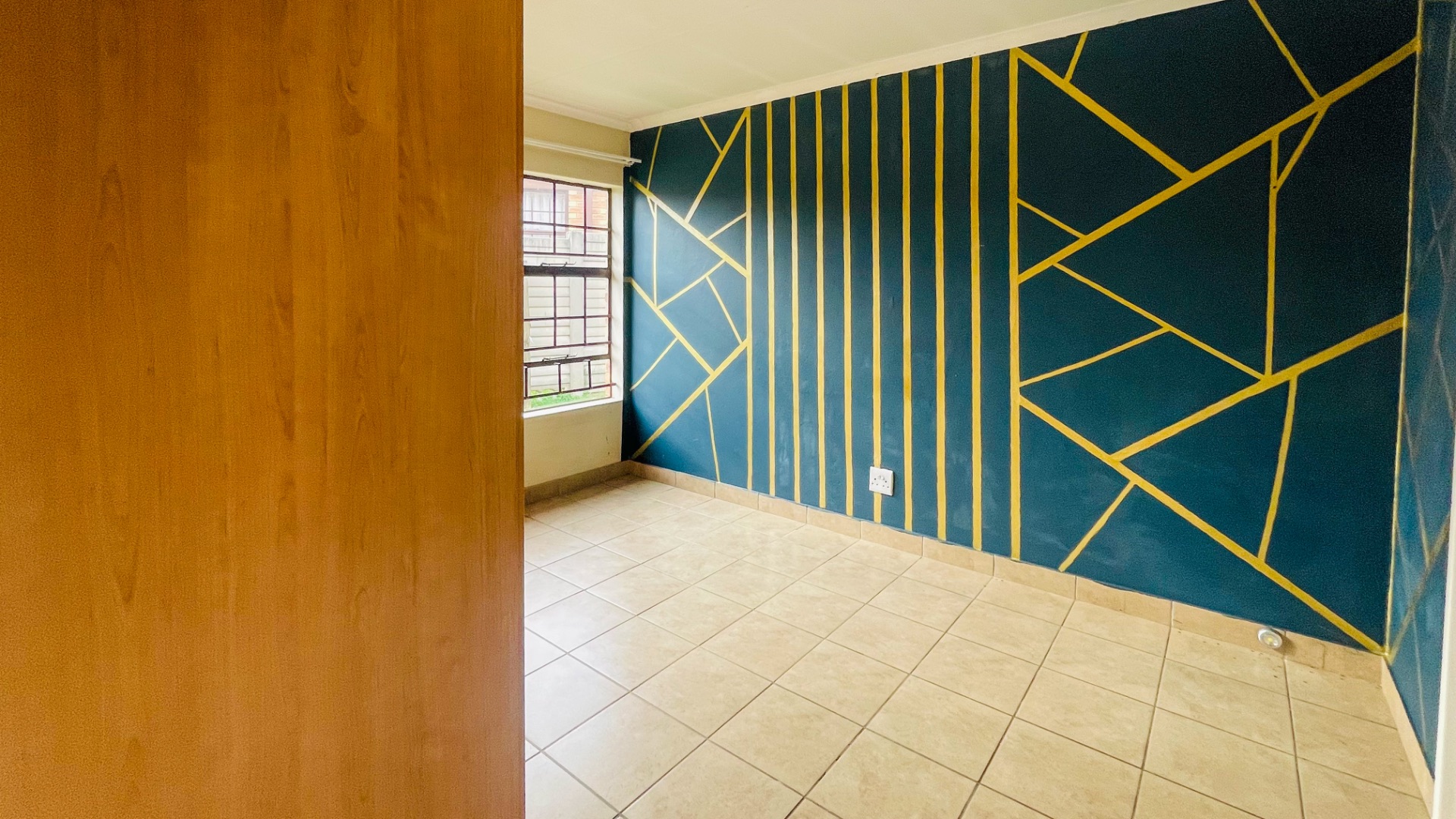 The home comprises three well-proportioned bedrooms, each featuring tiled flooring and ample natural light, with some rooms benefiting from modern accent walls. Security bars on the windows provide an additional layer of protection. The property includes two bathrooms, one of which is an en-suite, ensuring privacy and convenience for residents.