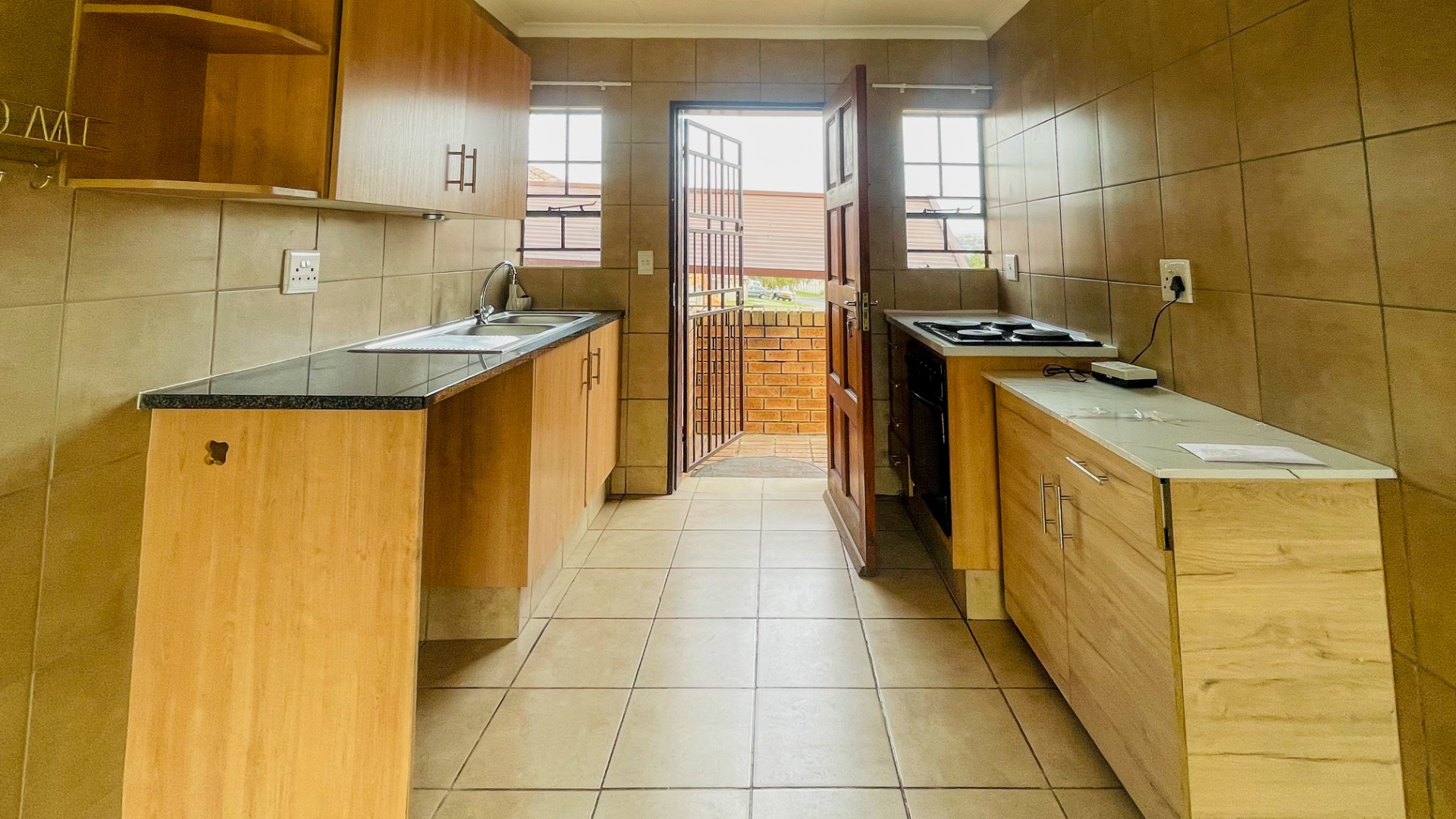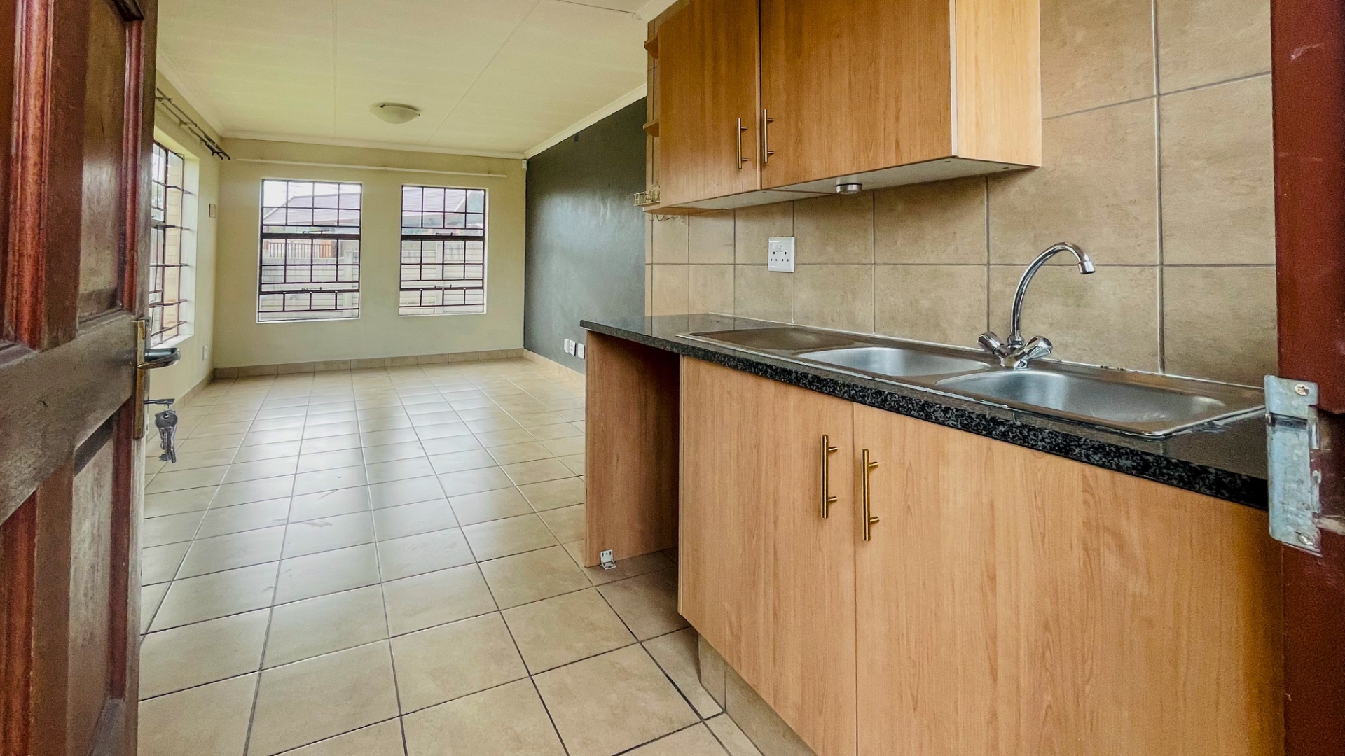 Upon entry, the interior reveals an intelligently designed open-plan layout, seamlessly integrating living spaces with the kitchen. The entire residence benefits from durable tiled flooring and abundant natural light, creating an inviting atmosphere. The contemporary kitchen is appointed with stylish wood-look cabinetry, dark granite-style countertops, and a double stainless steel sink, offering both aesthetic appeal and practical functionality for culinary pursuits.