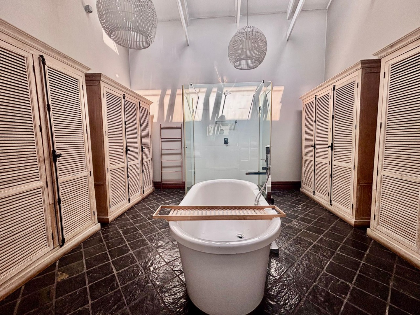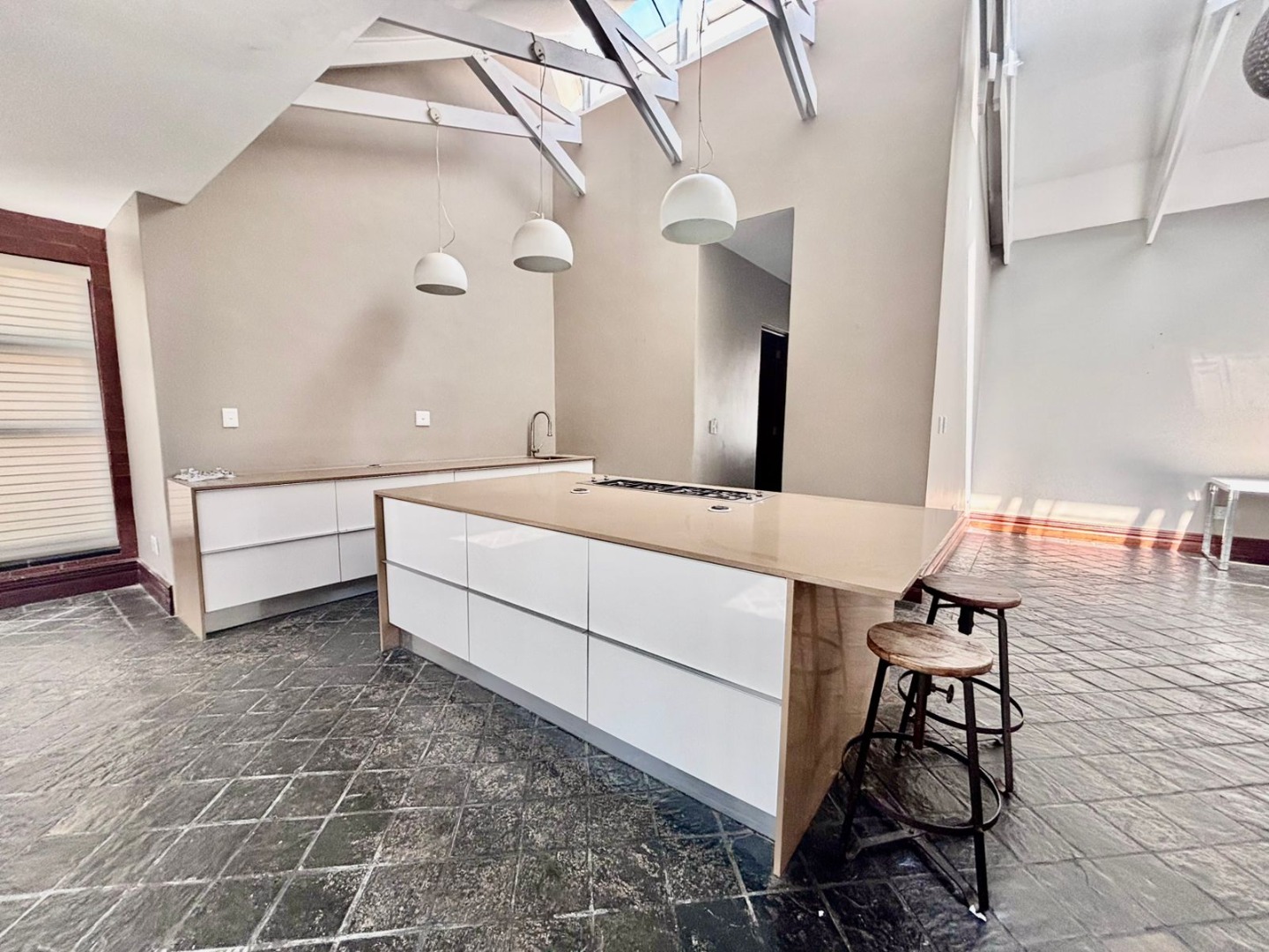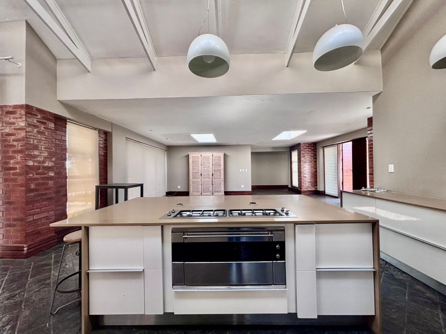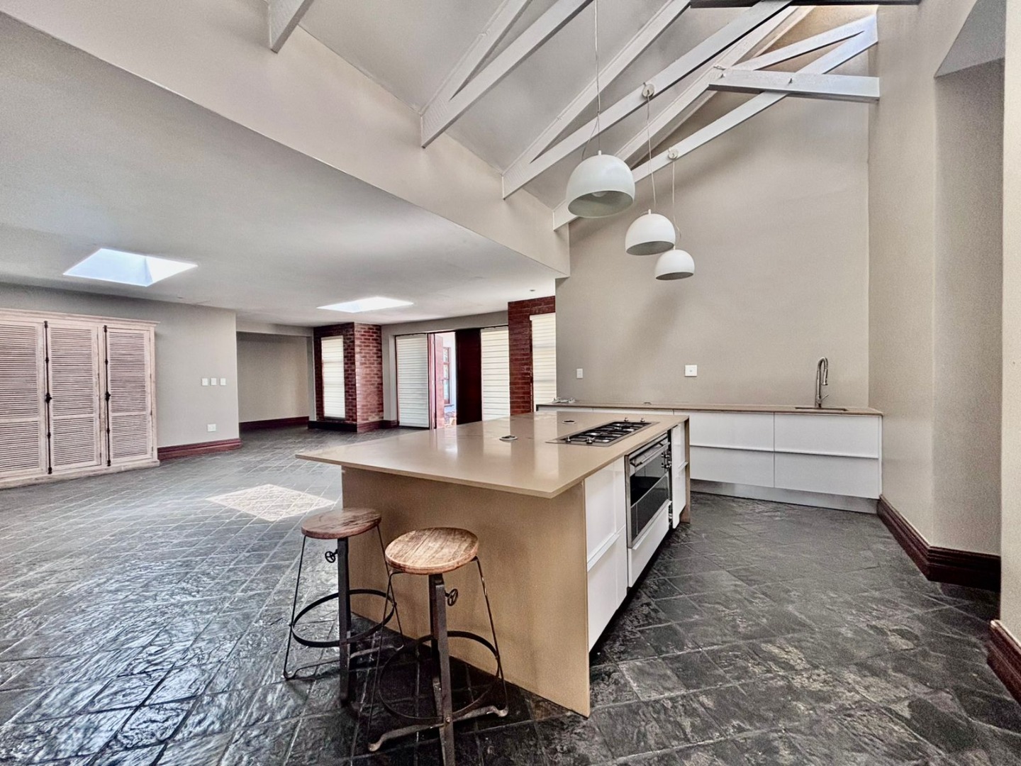 The state-of-the-art kitchen is a chef’s dream – finished with luxurious Caesarstone countertops, custom cabinetry, and generous workspace. A scullery, laundry room, and pantry are tucked away for convenience, ensuring the main kitchen remains uncluttered.