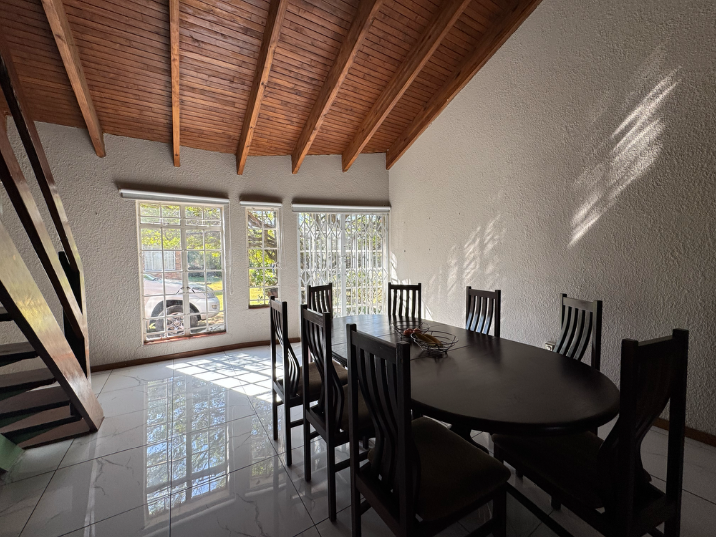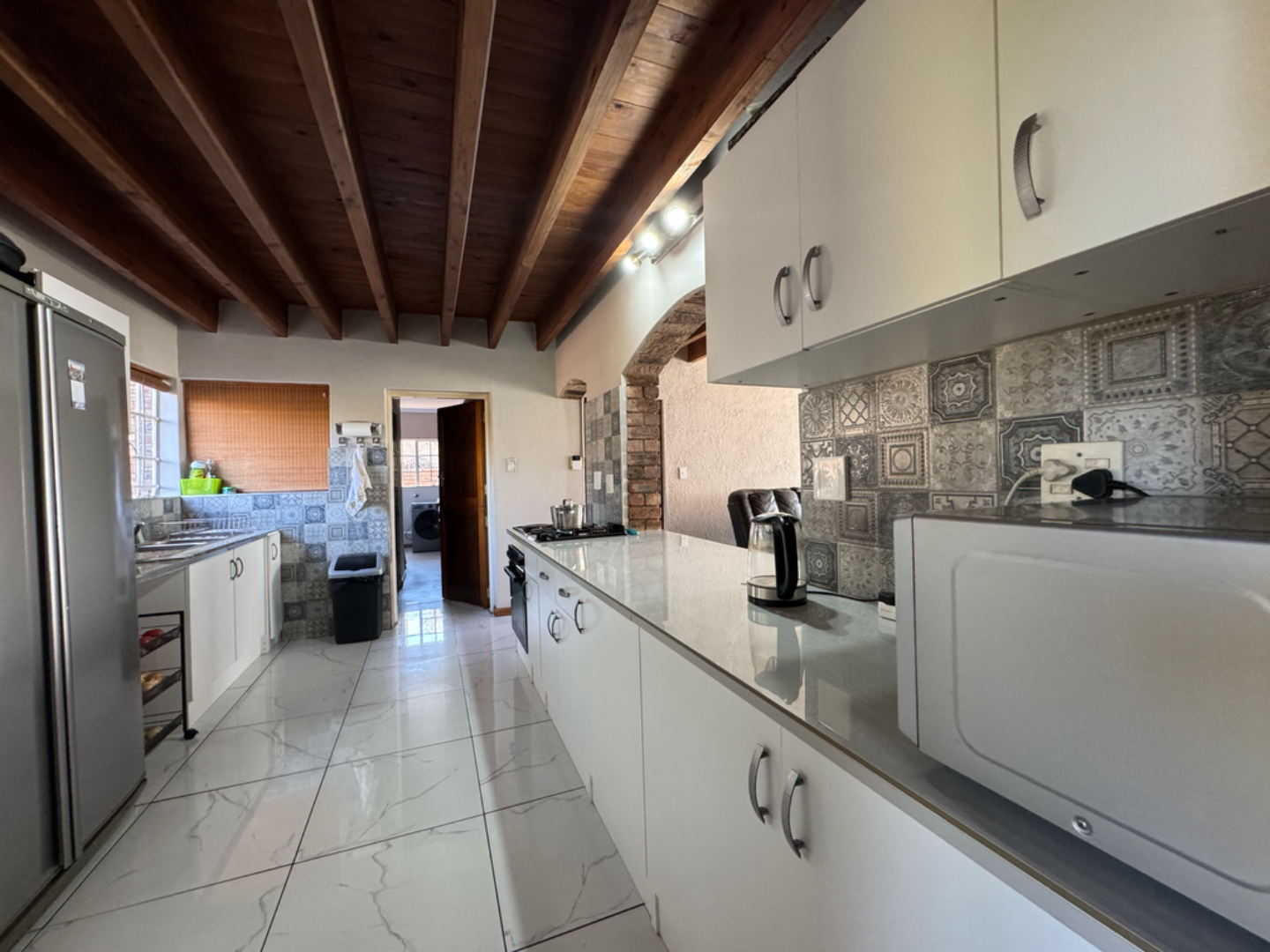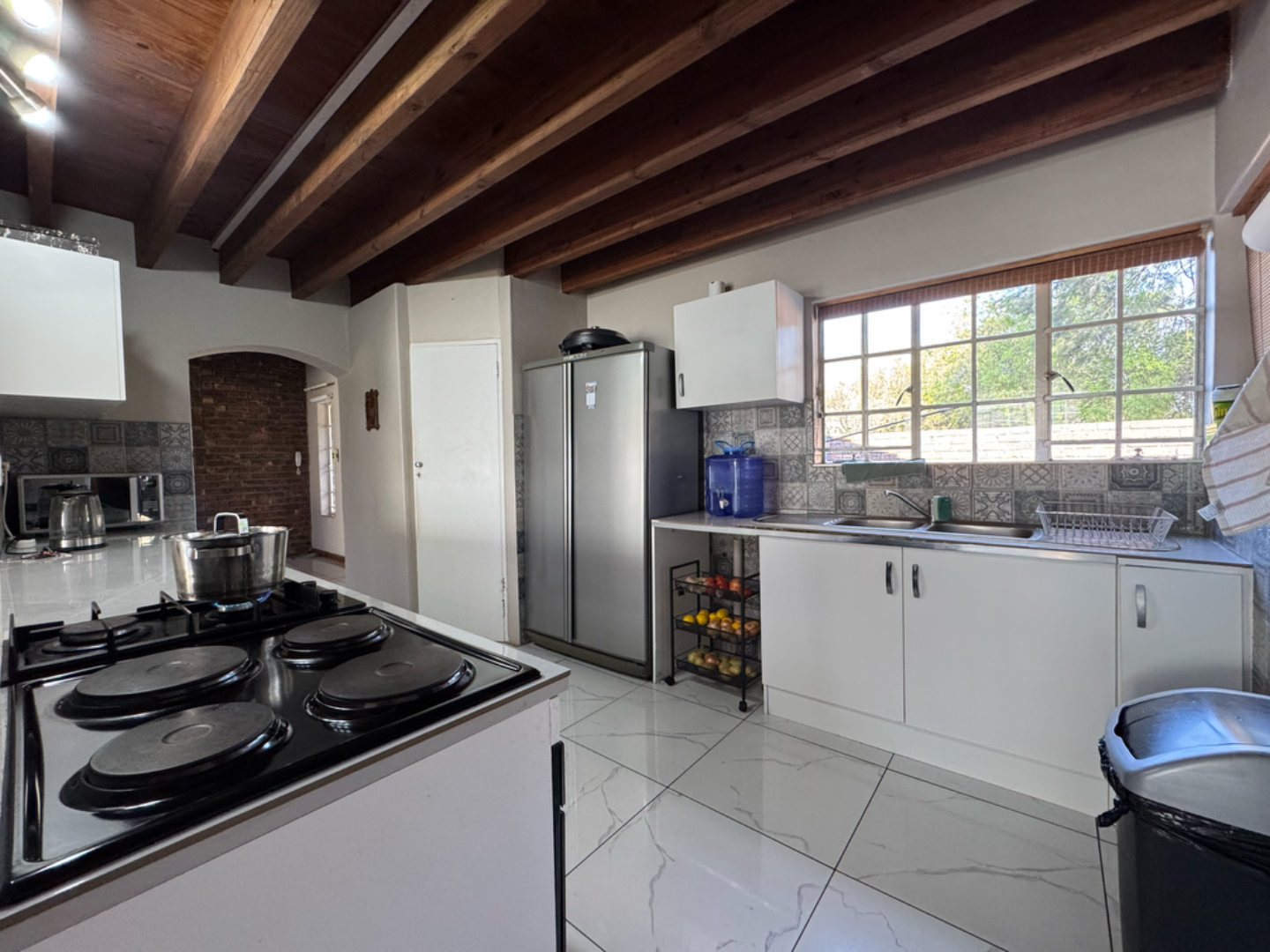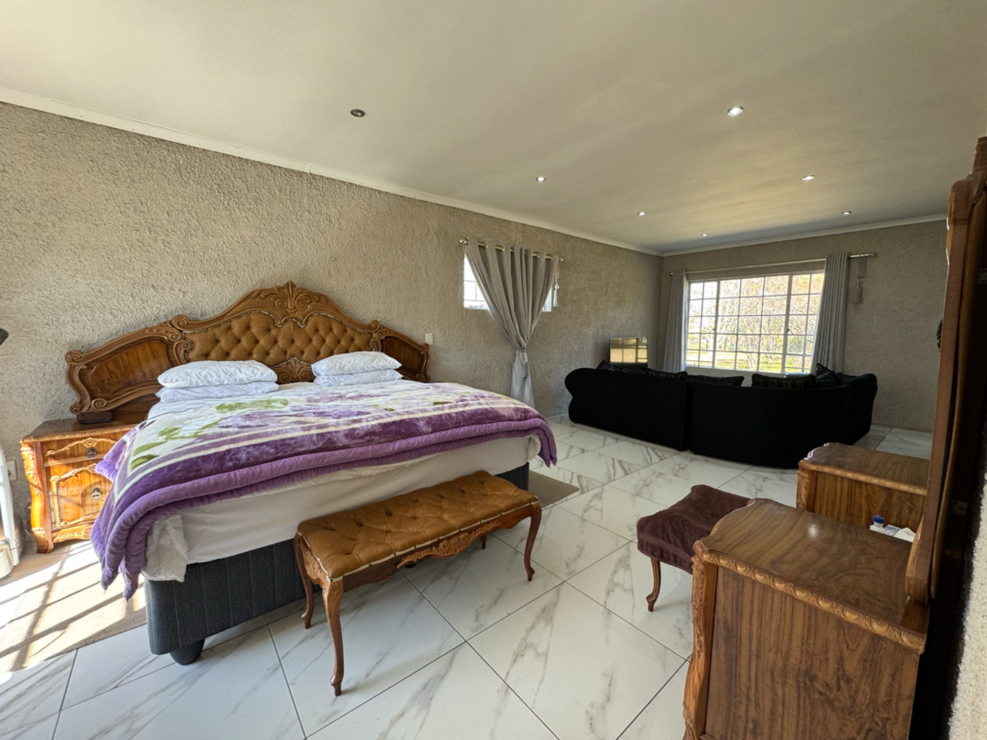 This expansive property offers dual-living potential with 2 spacious homes, ideal for the extended family, rental income or even a home-business set-up. Main House features: 5 spacious bedrooms + loft. Massive lounge & dining room - ideal for entertaining. Neat kitchen with gas and electric stove, eye level oven, scullery and spacious laundry. Main bedroom retreat: en-suite, private pajama lounge and study. Big windows flood the home with natural light. 2 full bathrooms + guest toilet. Fully tiled throughout. Outside room + toilet. Double carport. Functional alarm system for peace of mind. Eco friendly extra's - 16 panel solar system with 8kVA inverter and 2 batteries. Second Home: 3 bedrooms. Kitchen with ample cupboard space. 2 Bedrooms (main en-suite) Double Carport. Outside potential galore: Huge open space perfect for agriculture use, crops or animals. 2 Greenhouse frames (30m x 10m each) - poly sheeting needs replacing. 2 strong boreholes (1 in active use) Septic tank system. DEVELOPMENT HIGHLIGHT: With ample land and layout, this property holds huge potential for housing development.