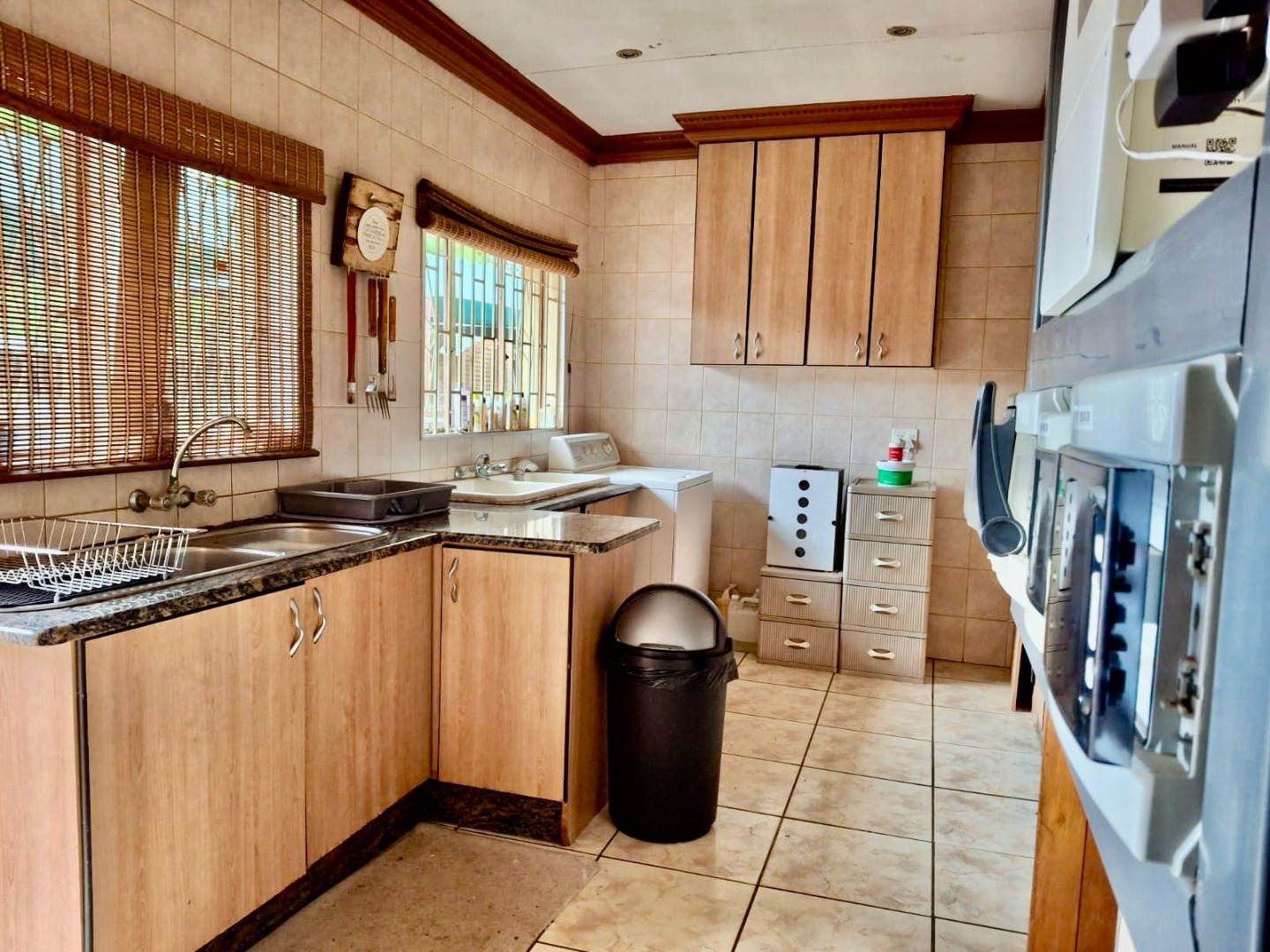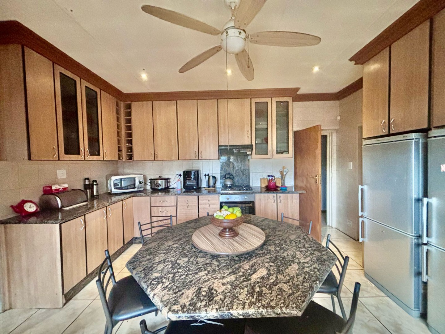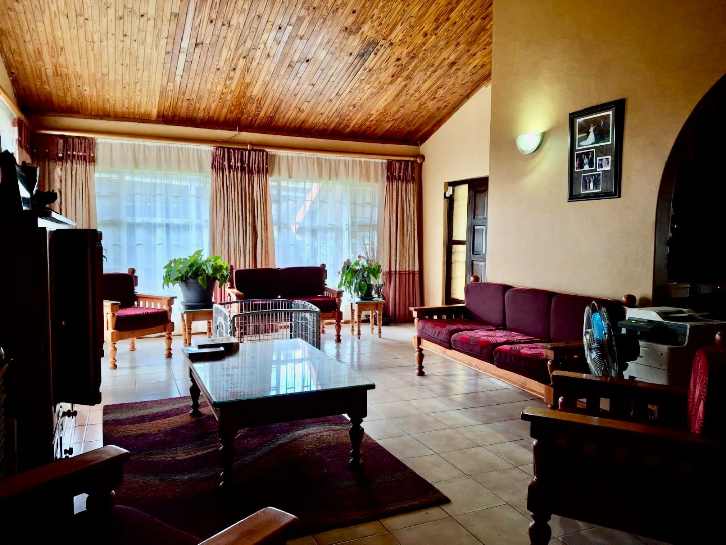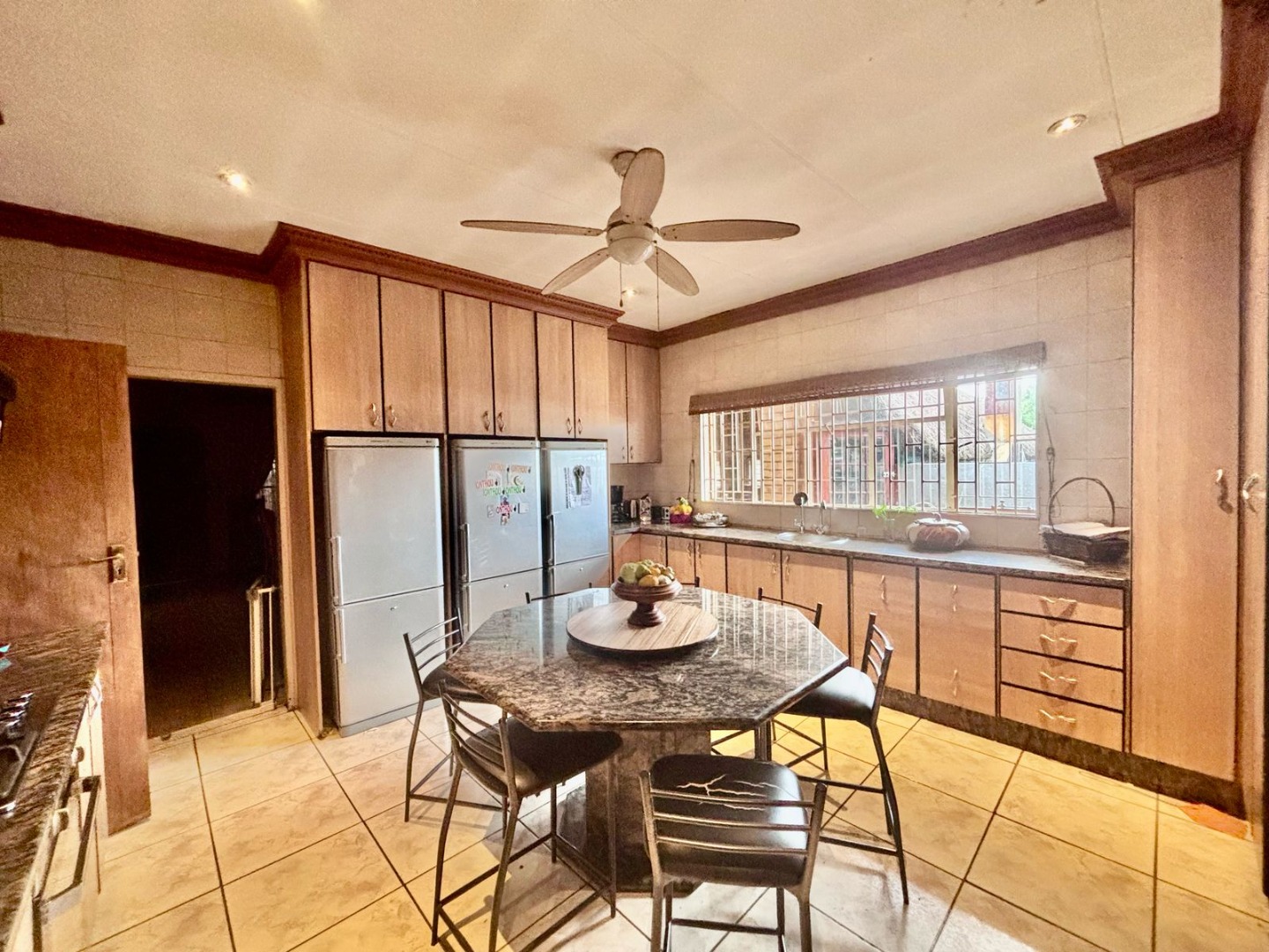 This impressive 8-bedroom, 6-bathroom residence in Andeon, Pretoria, offers a unique blend of country living and suburban convenience. The property immediately captivates with its well-maintained exterior, featuring a classic terracotta tiled roof, a light-coloured facade complemented by brick accents, and a welcoming paved driveway. Mature trees provide natural shade, enhancing the serene atmosphere, while a charming separate thatched-roof structure adds character and versatility to the expansive 20000 sqm erf. Step inside to discover a generously proportioned interior designed for comfortable family living and entertaining. The home boasts three distinct lounges and three dining rooms, providing ample space for various activities and gatherings. An inviting family TV room and an open-plan layout contribute to a seamless flow. The heart of the home features three well-appointed kitchens, each offering extensive light wood cabinetry, practical granite-look countertops, and large central islands with seating. These culinary spaces are equipped with integrated ovens and hobs, ample storage, and dedicated areas for multiple full-sized refrigerators, complemented by a scullery and pantry for ultimate convenience. Accommodation includes eight spacious bedrooms and six bathrooms, with two ensuites ensuring privacy and comfort. A dedicated study provides an ideal space for work or quiet contemplation. The property further benefits from a flatlet, offering potential for extended family or rental income, along with staff quarters, a dedicated laundry room, and ample storage solutions. For leisure and entertainment, enjoy the convenience of a braai room and a lapa, perfect for outdoor gatherings. Additional practical features include a wendy house and a garden. The outdoor areas are designed for enjoyment, featuring a well-maintained garden and offering scenic views. With two garages and an impressive 24 parking spaces, accommodating vehicles is never an issue. Security is paramount, with a perimeter fence, CCTV surveillance, and burglar bars on windows and gates providing peace of mind. Embracing modern sustainability, the property is equipped with solar panels, a battery inverter, and water tanks, ensuring energy efficiency and water resilience. A borehole further enhances self-sufficiency. Key Features: * 8 Bedrooms, 6 Bathrooms (2 Ensuites, 1 Guest Toilet) * 3 Kitchens, 3 Lounges, 3 Dining Rooms * Expansive 20000 sqm Erf * 2 Garages, 24 Parking Spaces * Solar Panels, Battery Inverter, Water Tanks, Borehole * Flatlet, Staff Quarters, Study, Laundry, Storage * Braai Room, Lapa, Wendy House, Garden * CCTV, Burglar Bars, Fence, Scenic View * Ideal for Country Living in a Suburban Setting