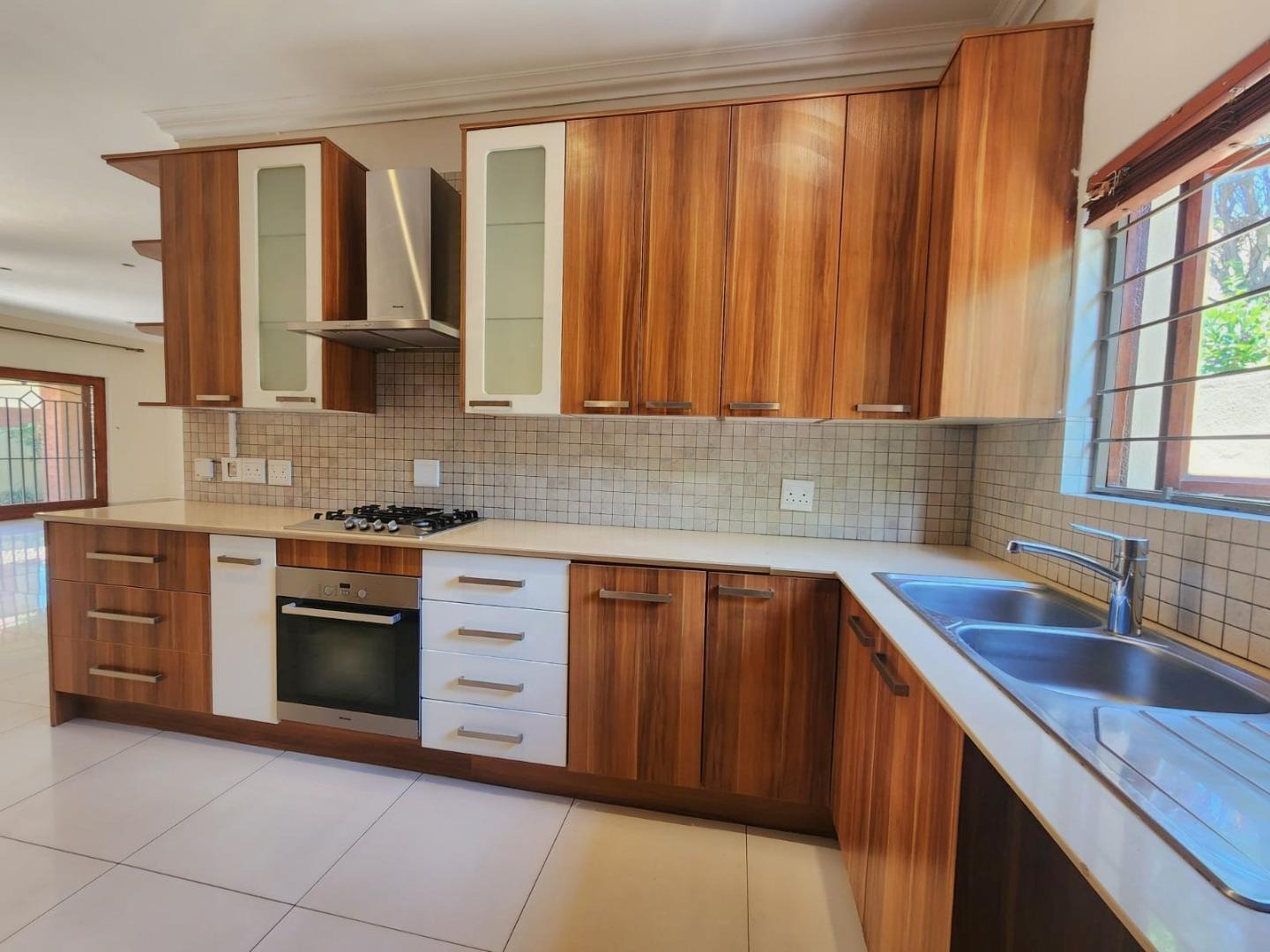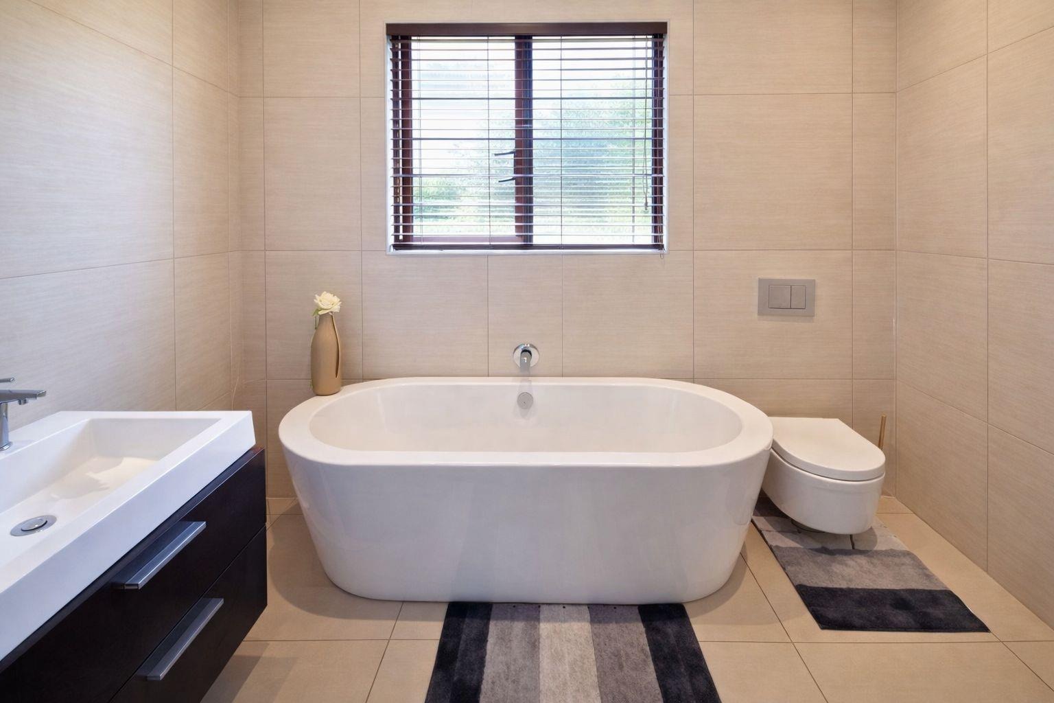 The main bedroom offers a comfortable retreat with matching wooden built-in cupboards and a well-appointed modern en-suite bathroom with both a bath and shower. Three additional tiled bedrooms, also fitted with the same wooden built-in cupboards, are serviced by a full second bathroom with both a bath and shower.