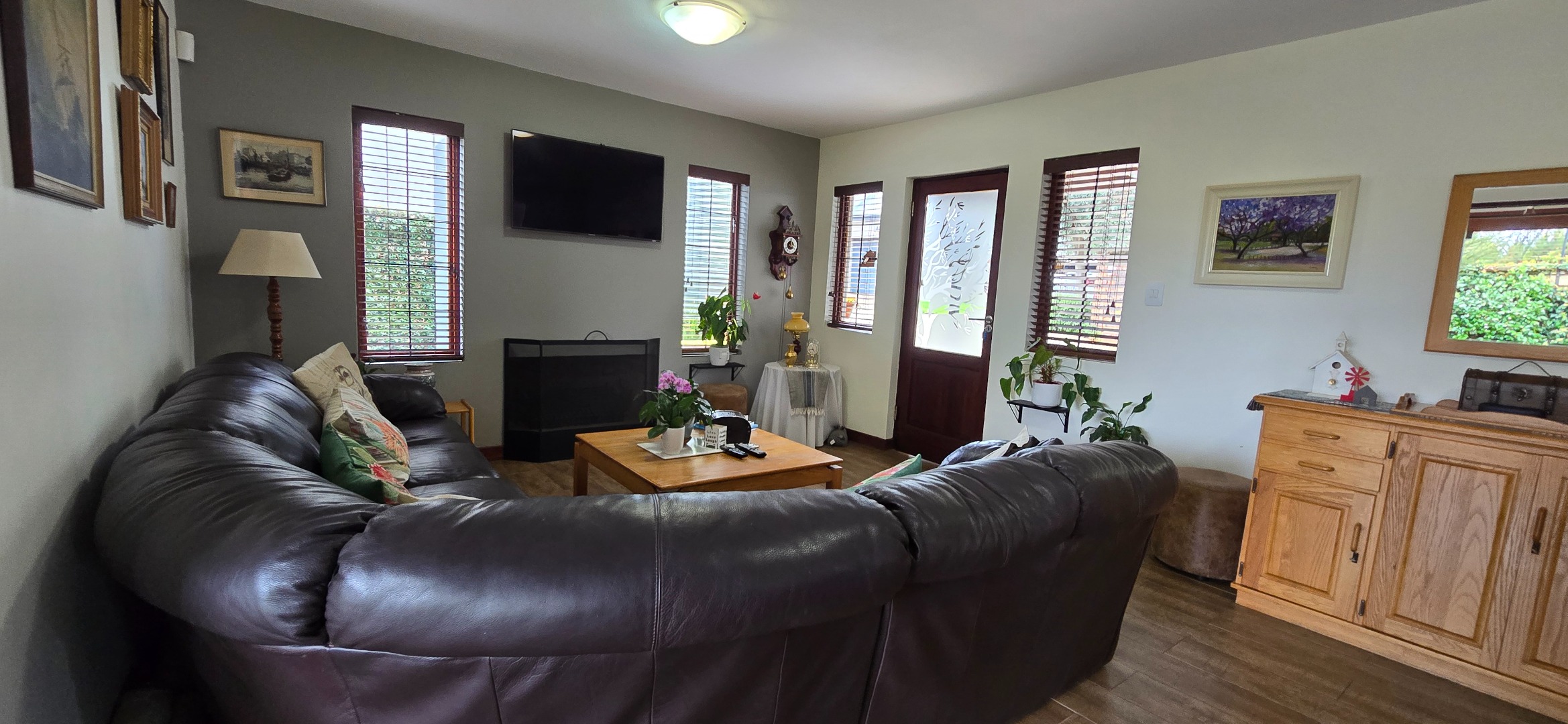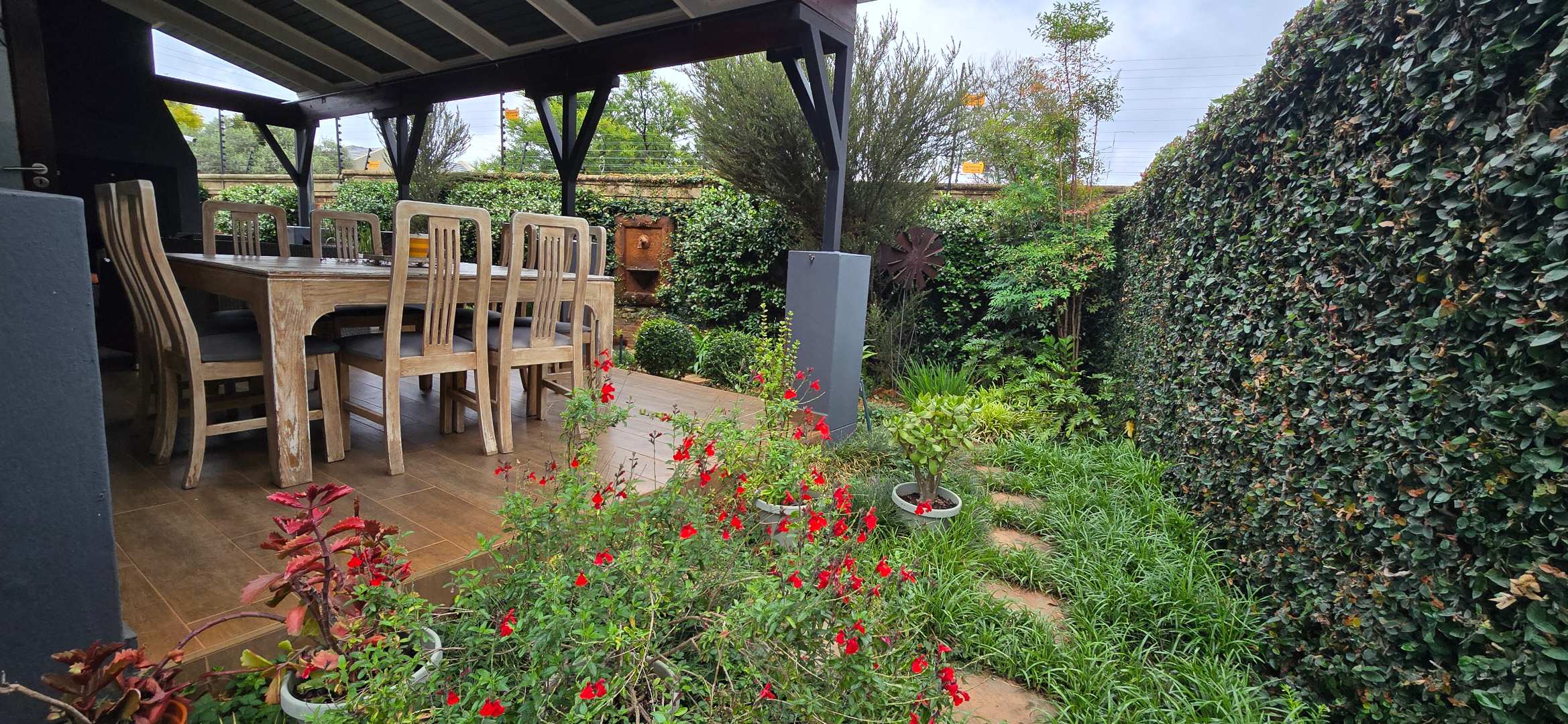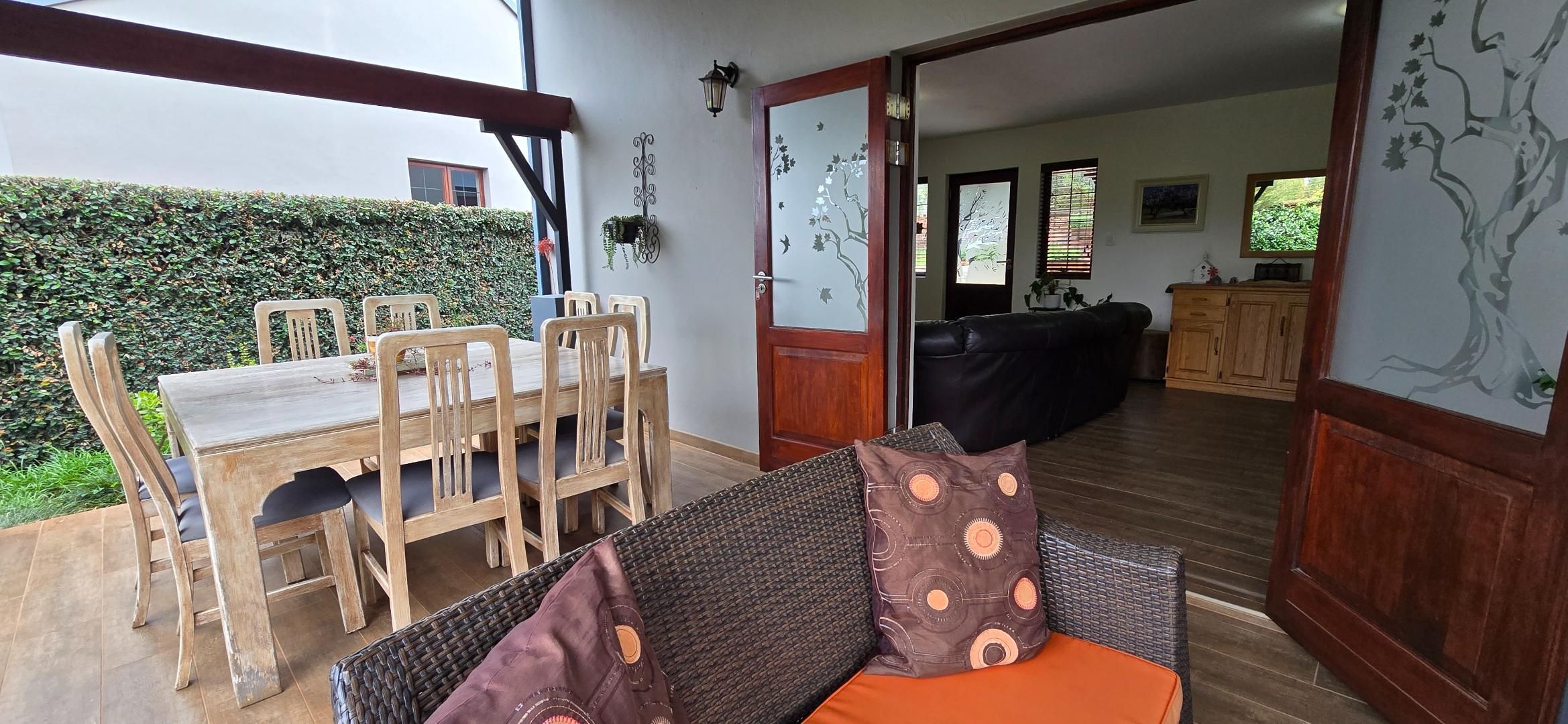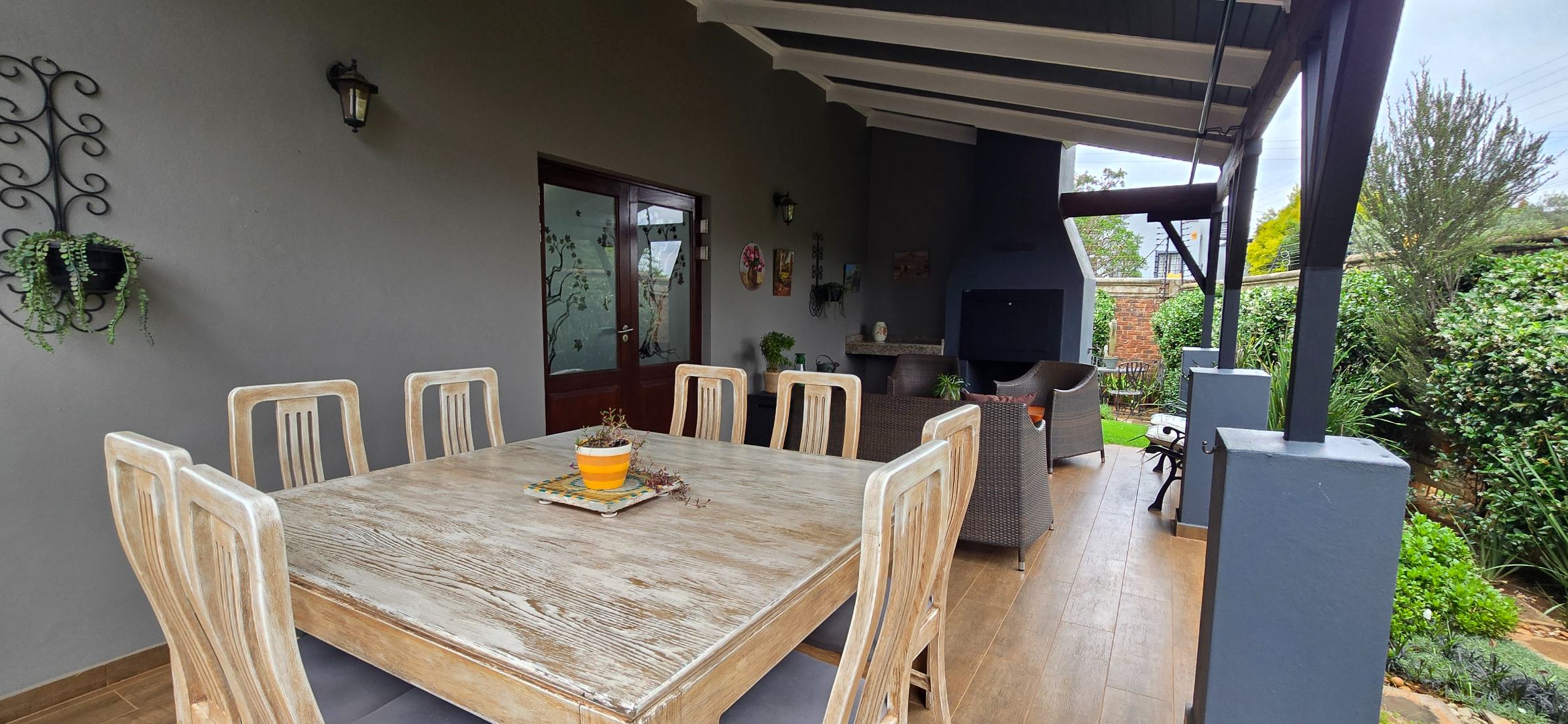 Step through the solid wood front door into the spacious open-plan lounge and dining areas, which are flooded with natural light. Double wooden doors lead onto a covered patio with a built-in braai, ideal for entertaining family and friends while admiring the beautifully landscaped garden.