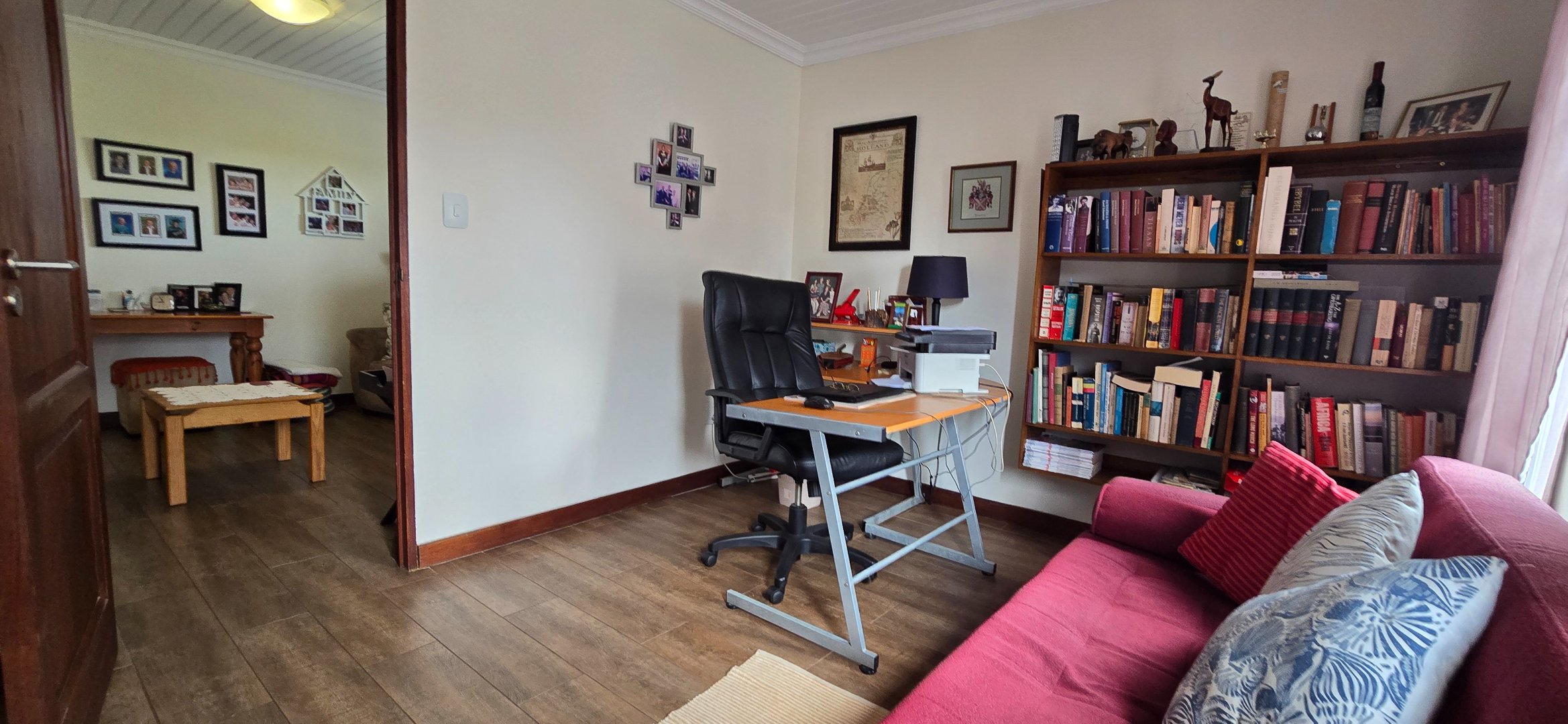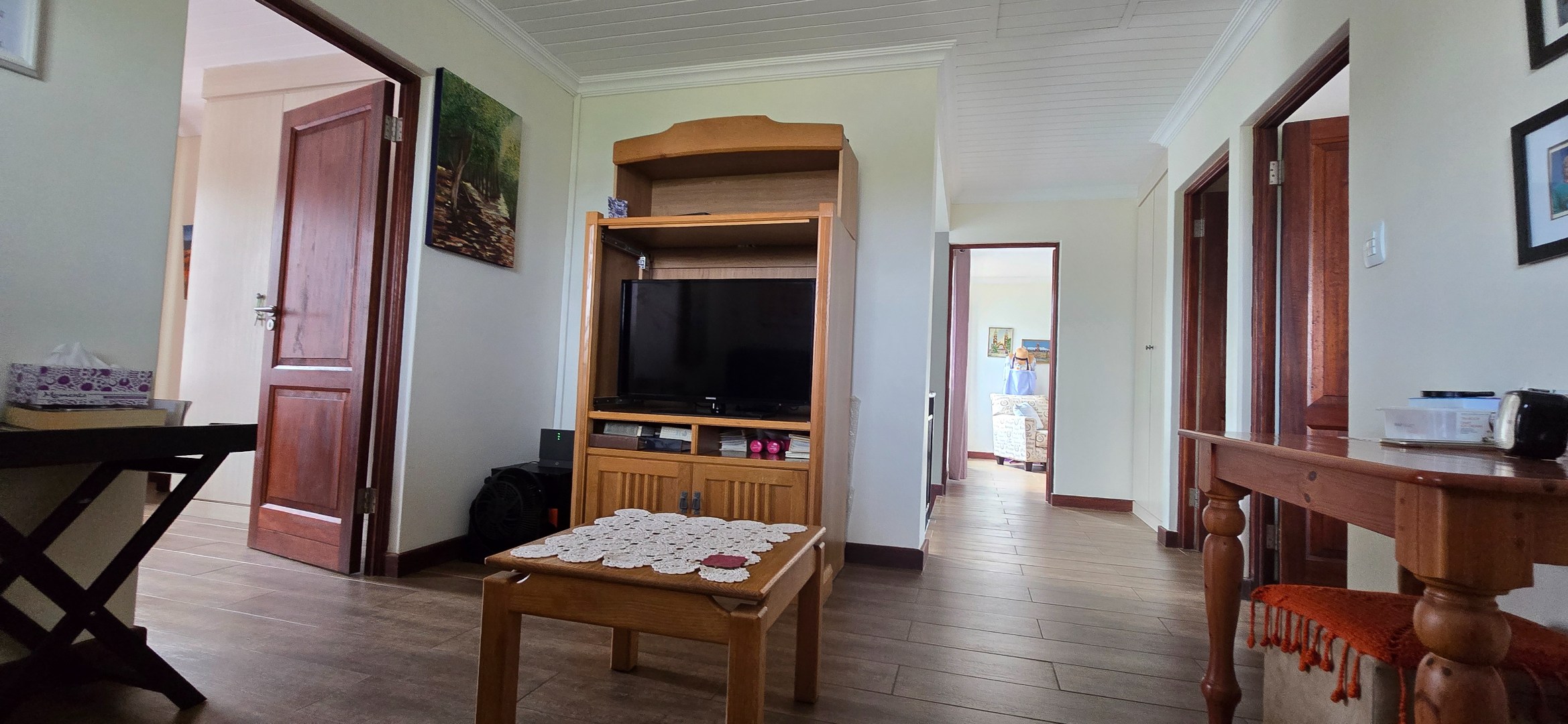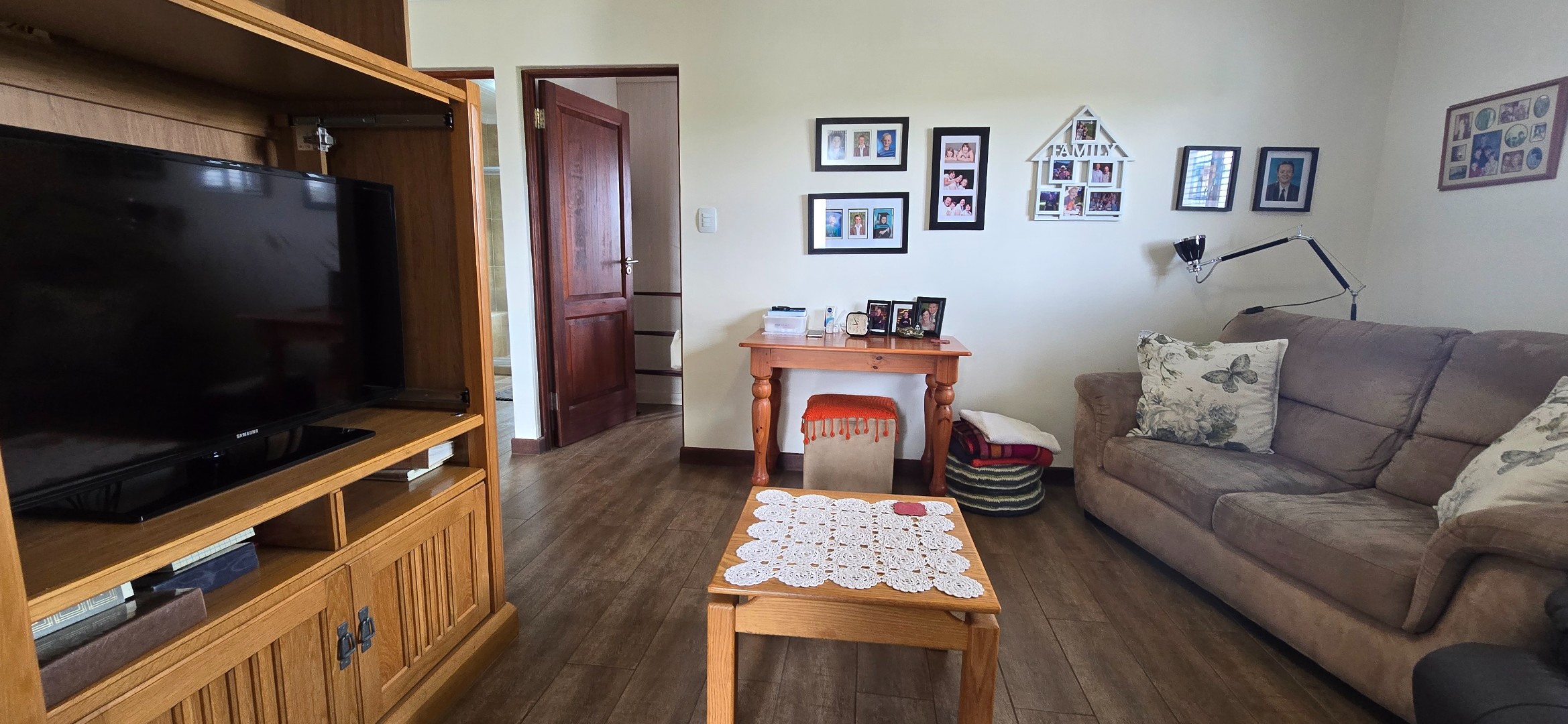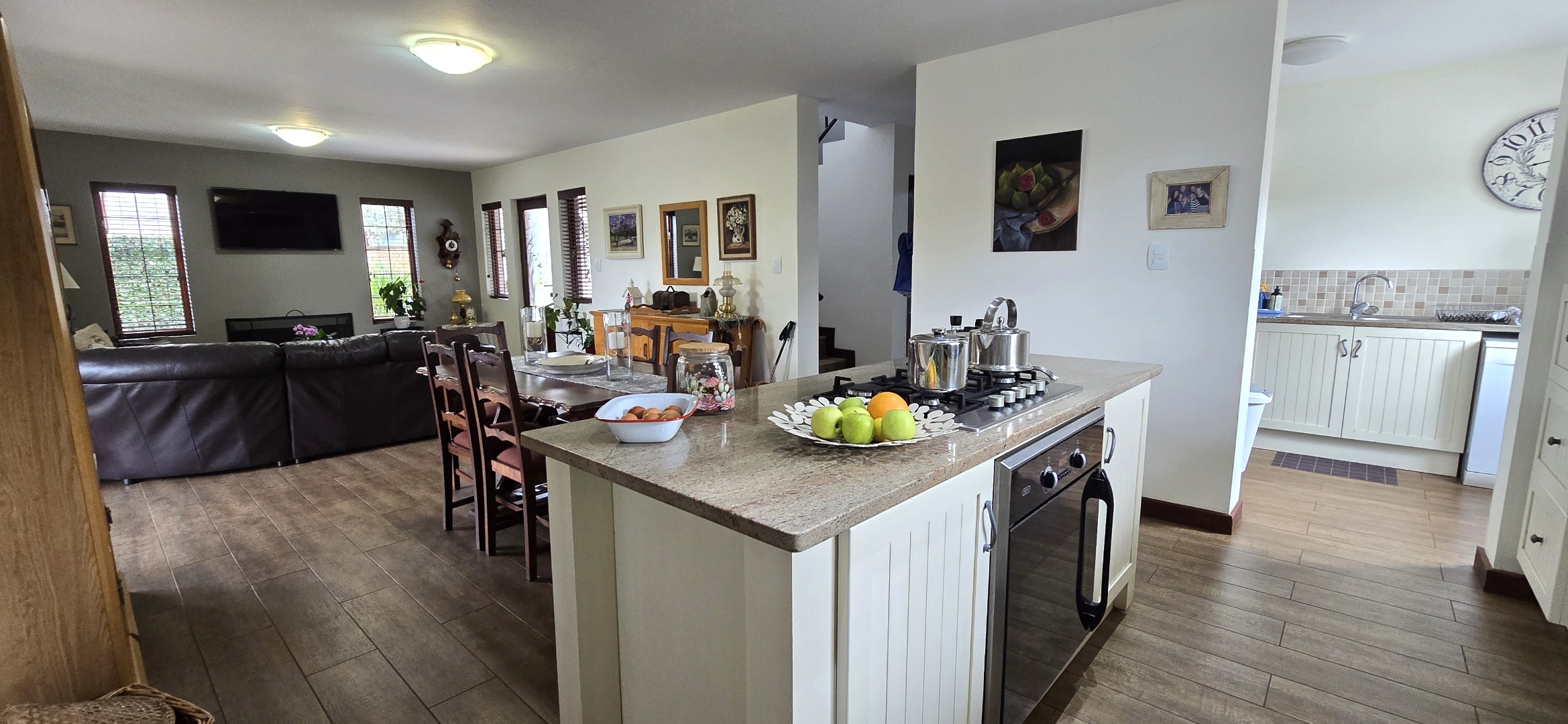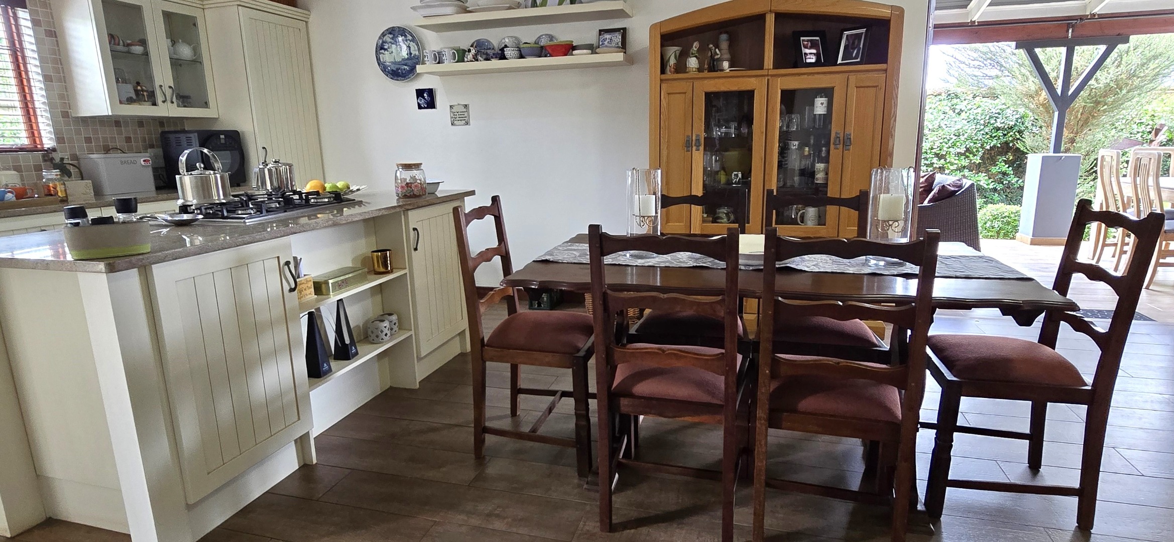 Step through the solid wood front door into the spacious open-plan lounge and dining areas, which are flooded with natural light. Double wooden doors lead onto a covered patio with a built-in braai, ideal for entertaining family and friends while admiring the beautifully landscaped garden.