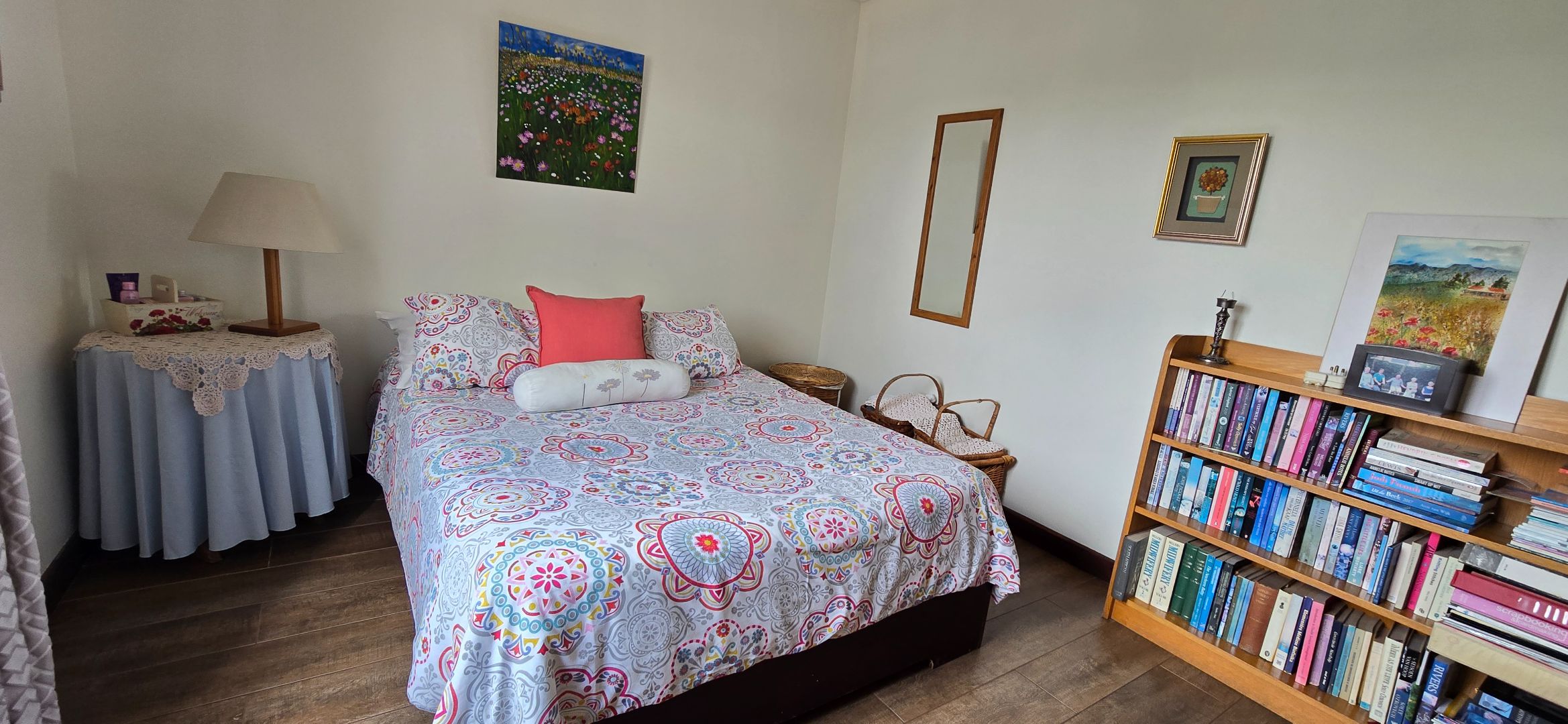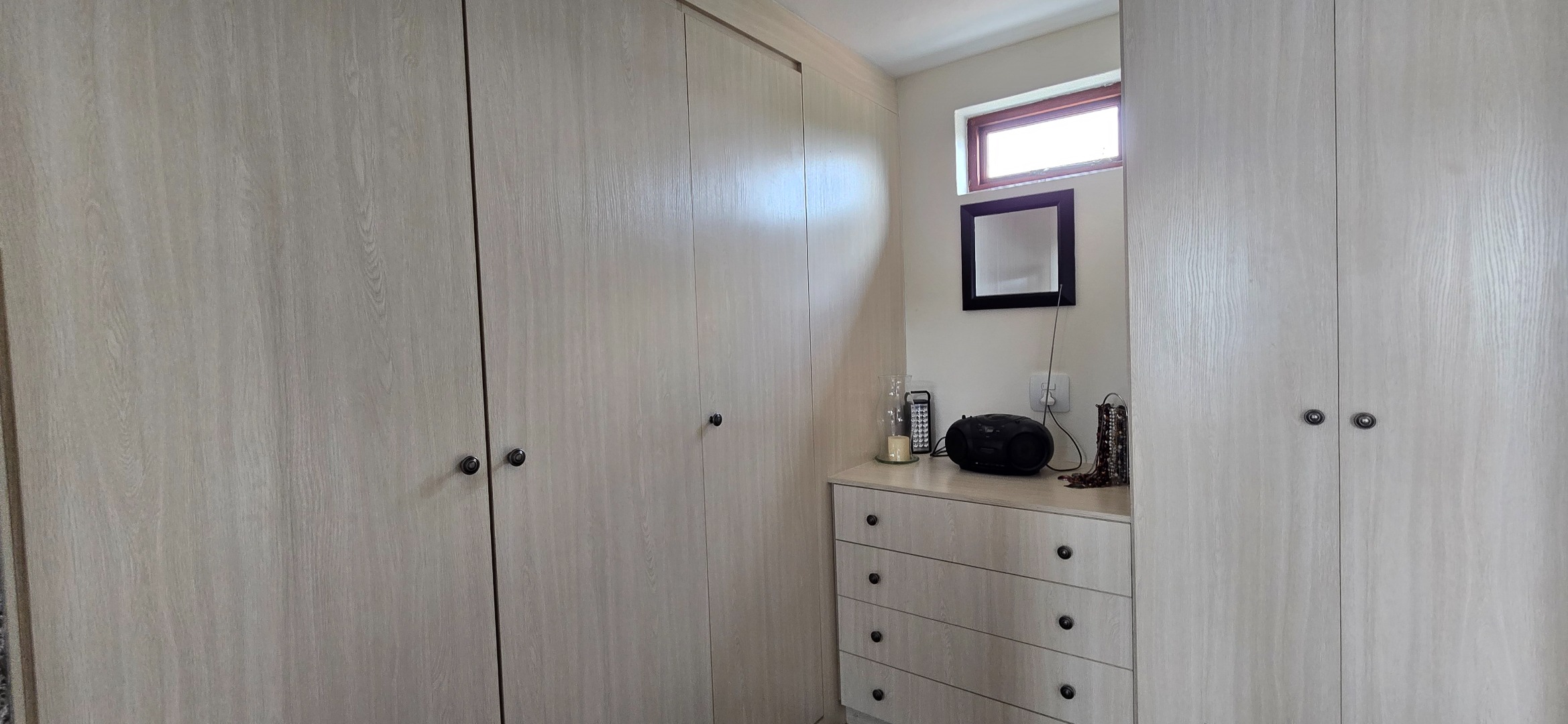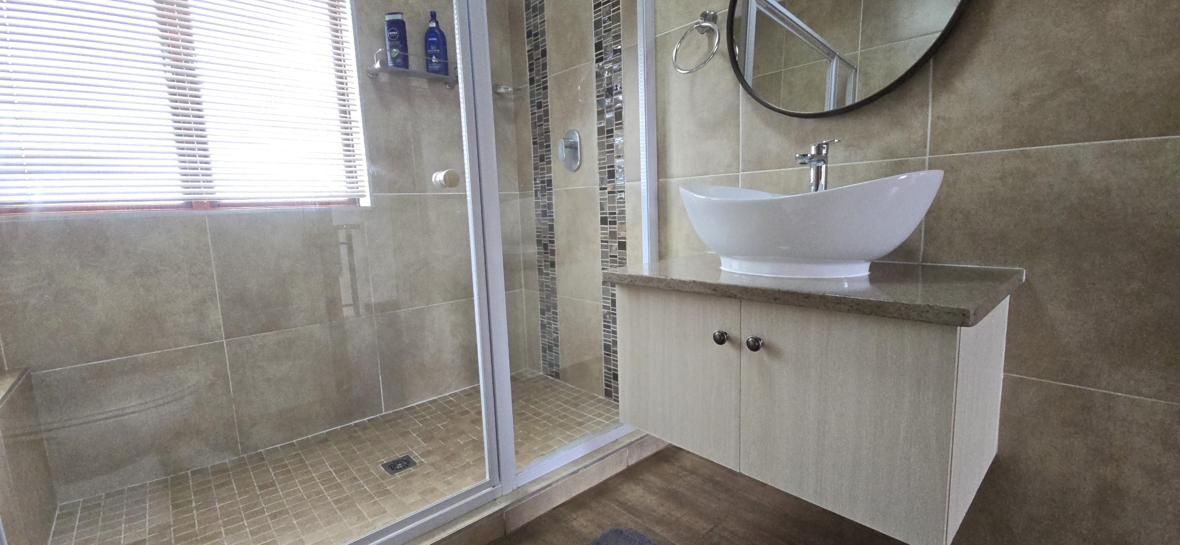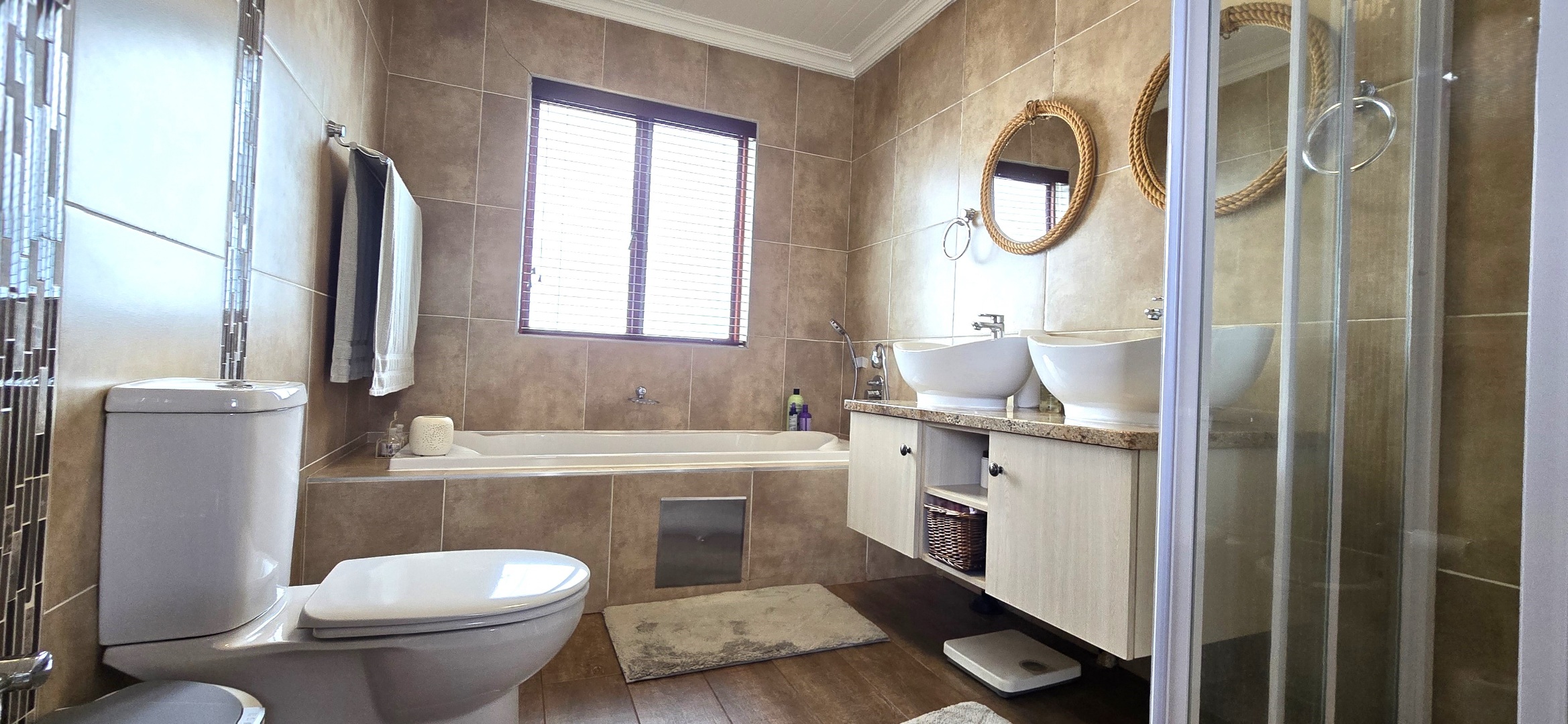 - Two additional bedrooms share a stylish bathroom equipped with a double shower, basin, and toilet. The bedrooms are spacious, fully tiled with built-in cupboards.