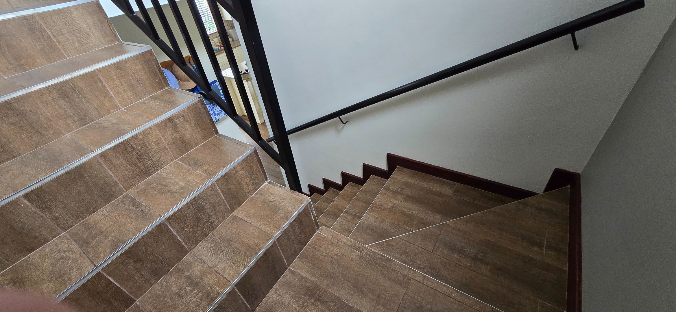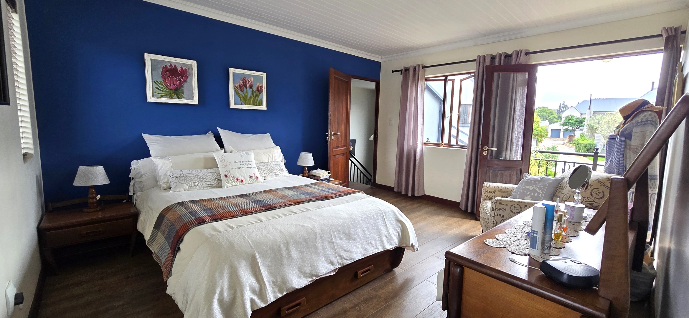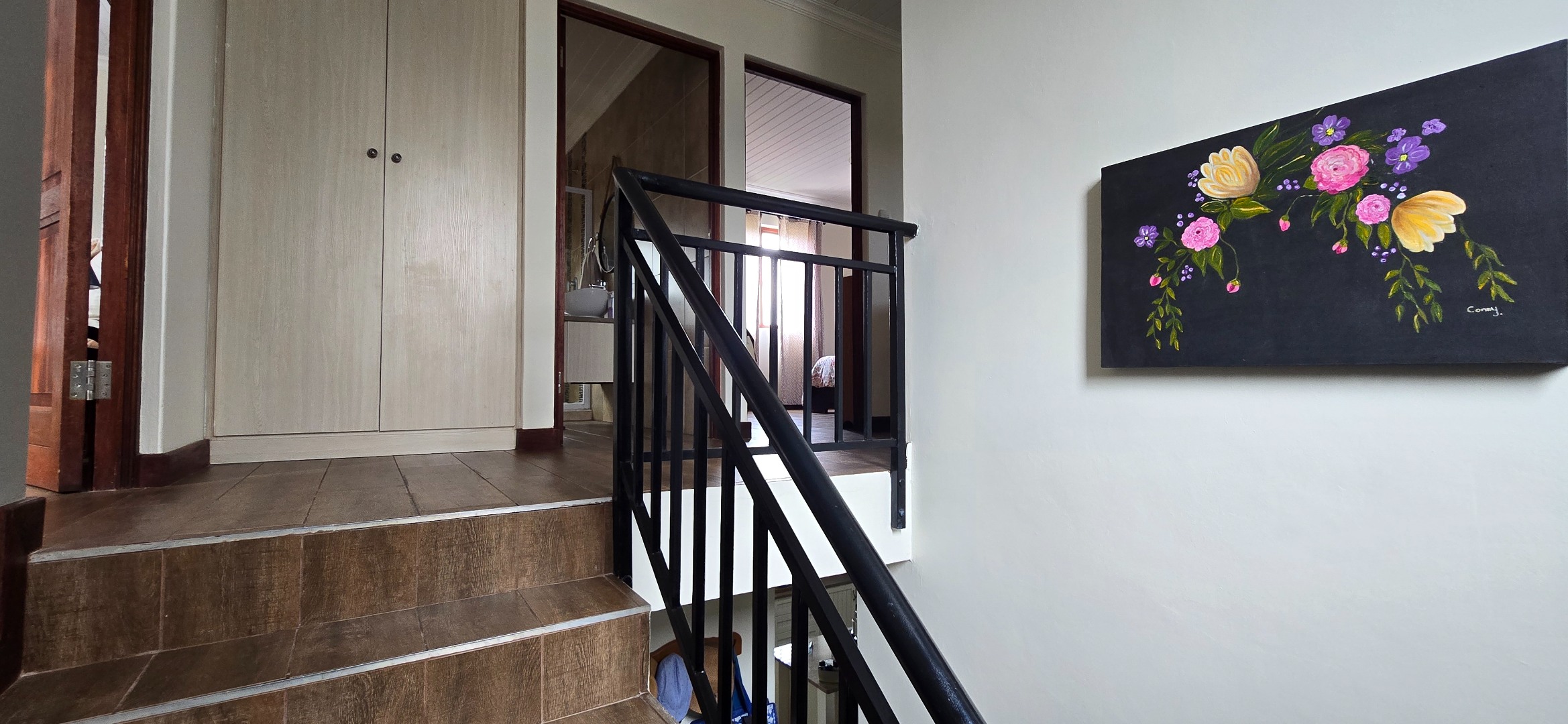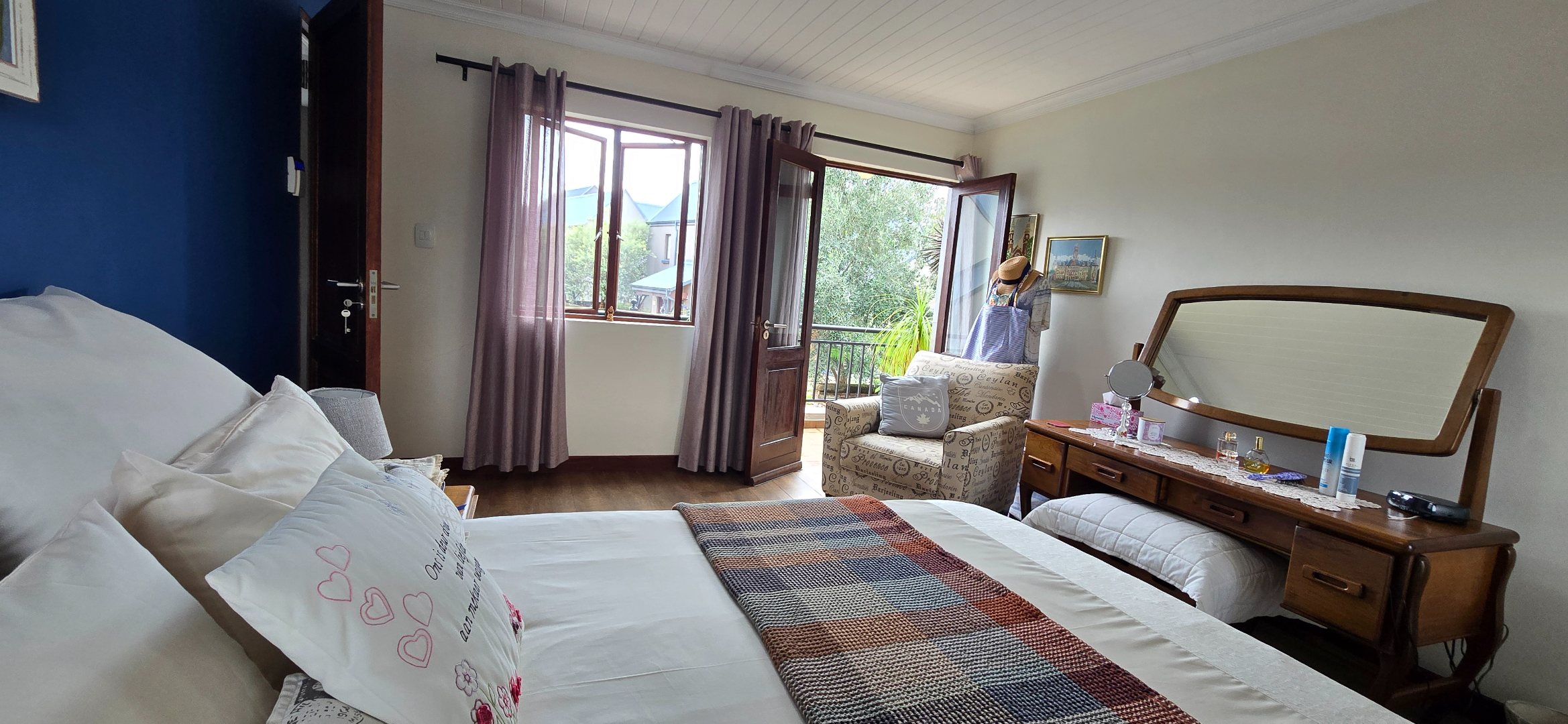 - The spacious main bedroom is fully tiled and features a walk-in closet and built-in dressing table. The double wooden doors open to a private balcony that overlooks the estate.