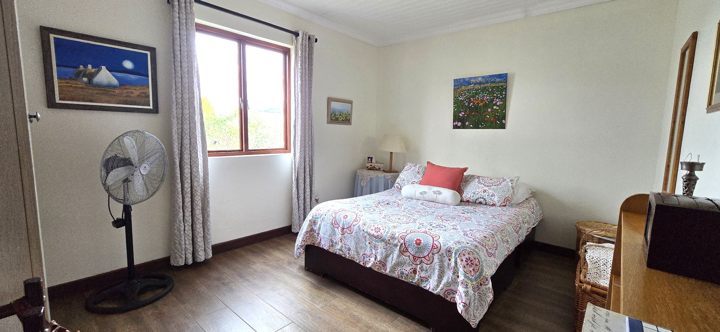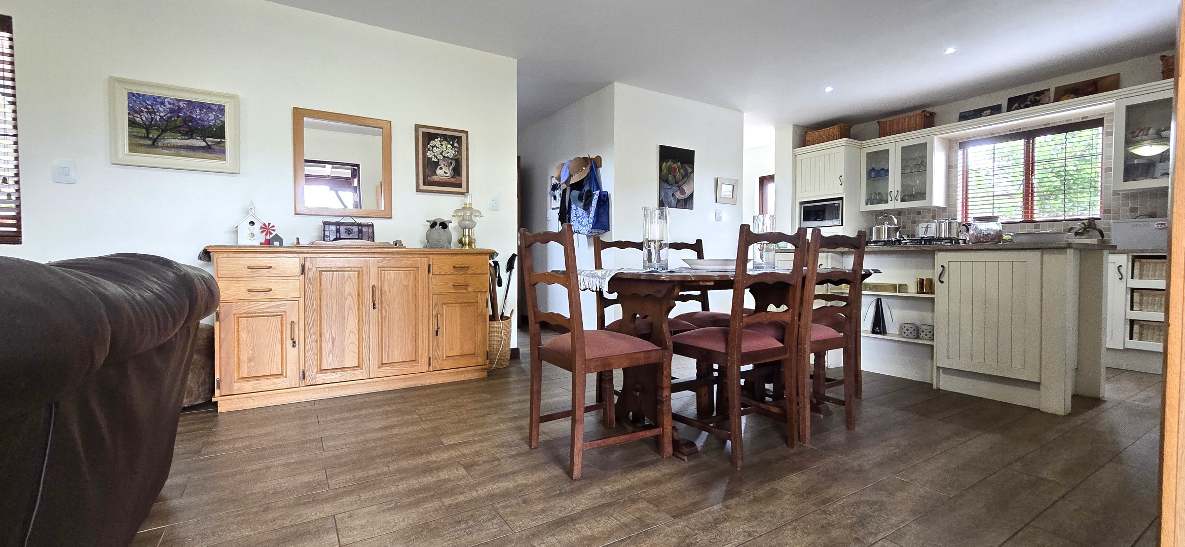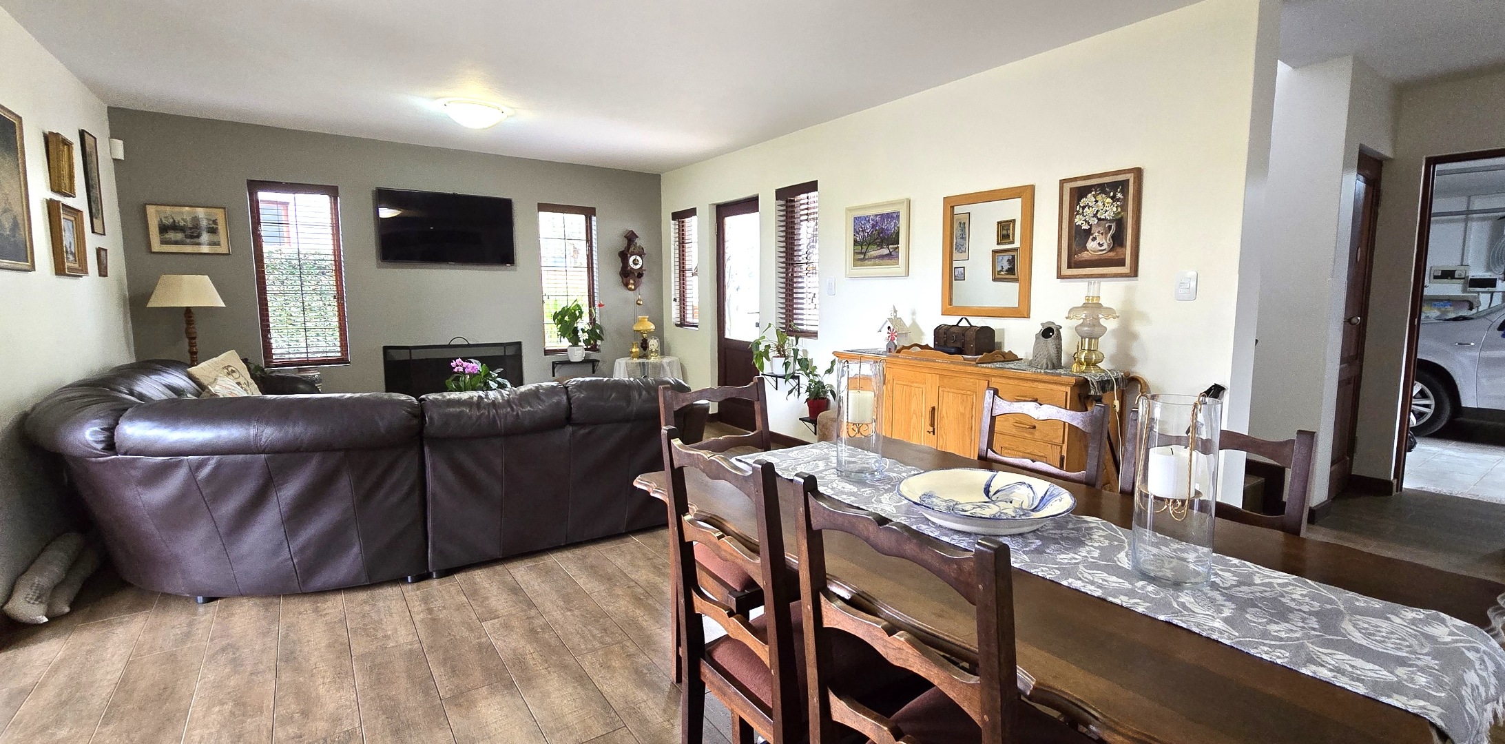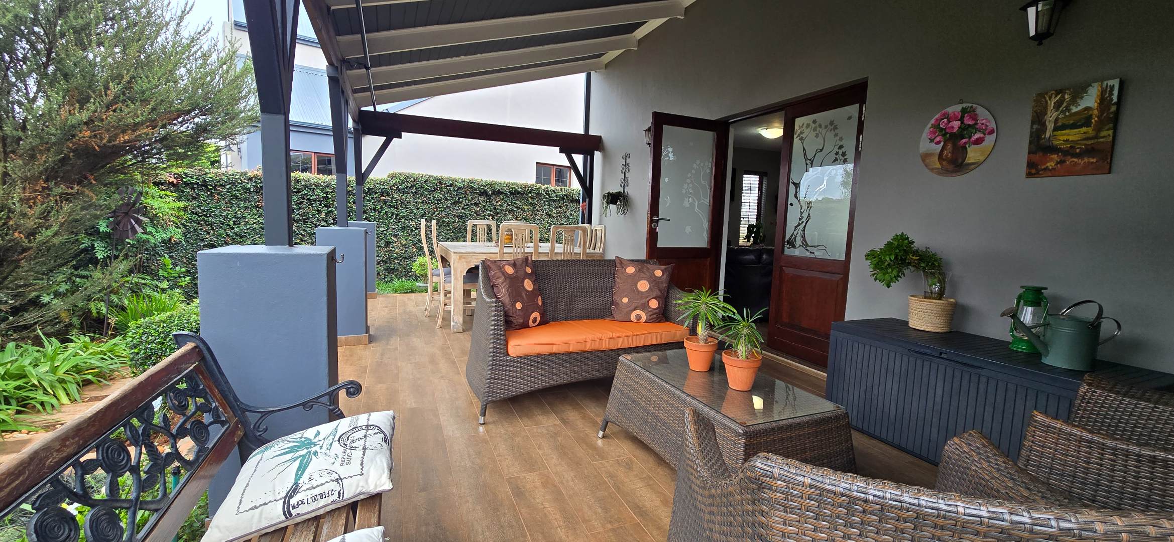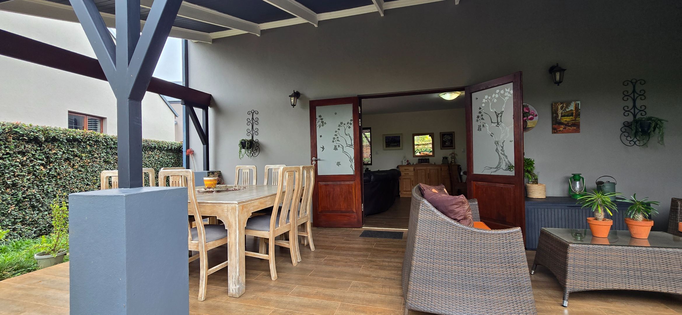 Step through the solid wood front door into the spacious open-plan lounge and dining areas, which are flooded with natural light. Double wooden doors lead onto a covered patio with a built-in braai, ideal for entertaining family and friends while admiring the beautifully landscaped garden.