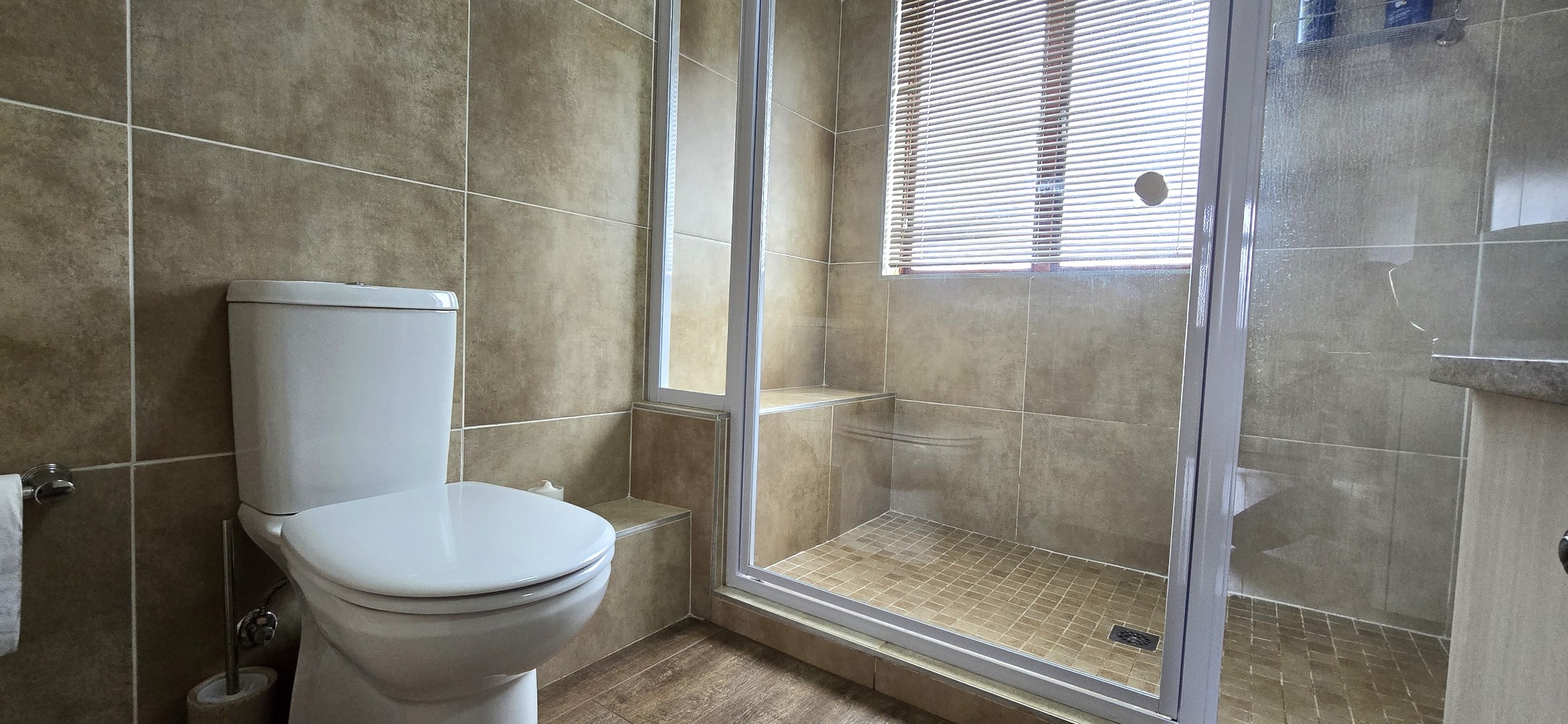 - Two additional bedrooms share a stylish bathroom equipped with a double shower, basin, and toilet. The bedrooms are spacious, fully tiled with built-in cupboards.