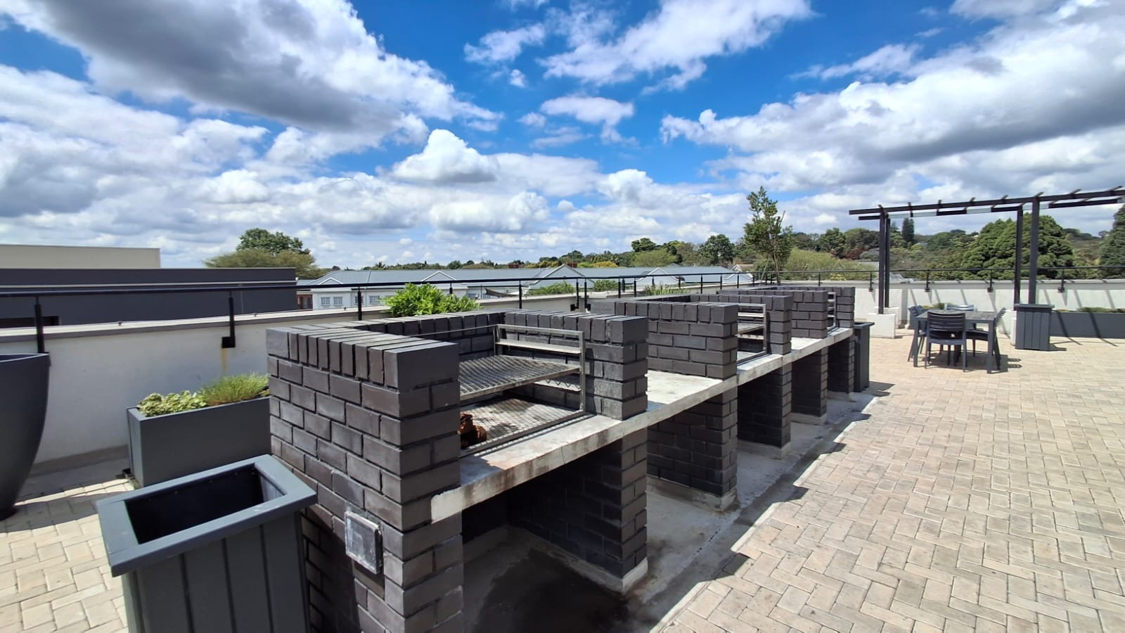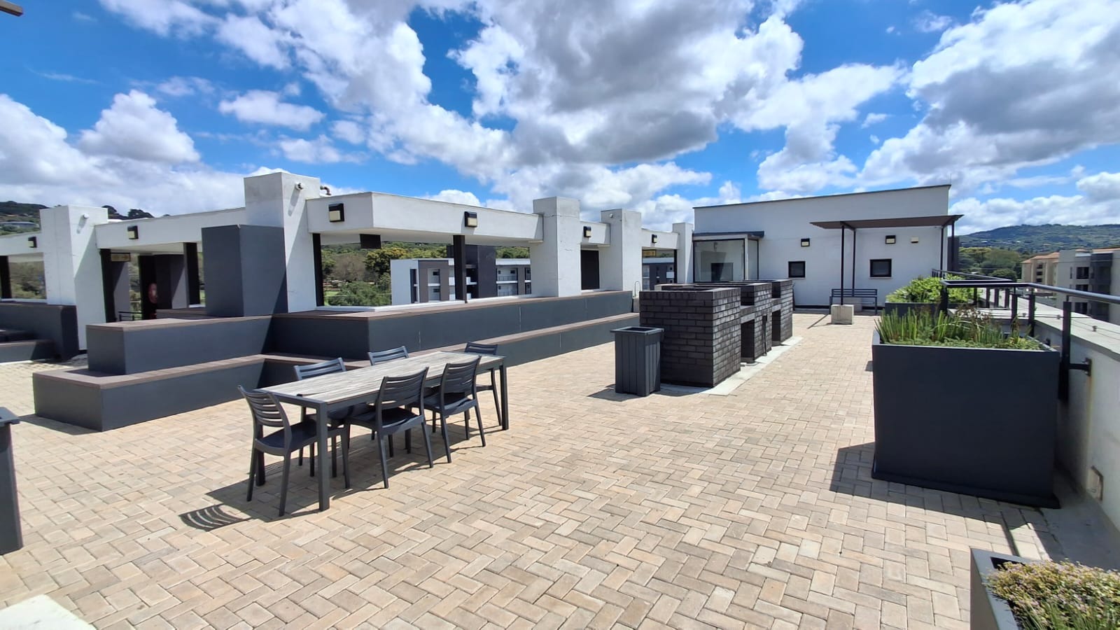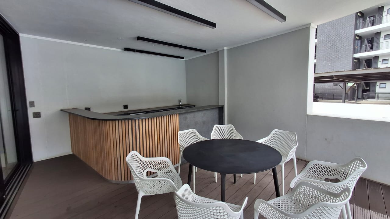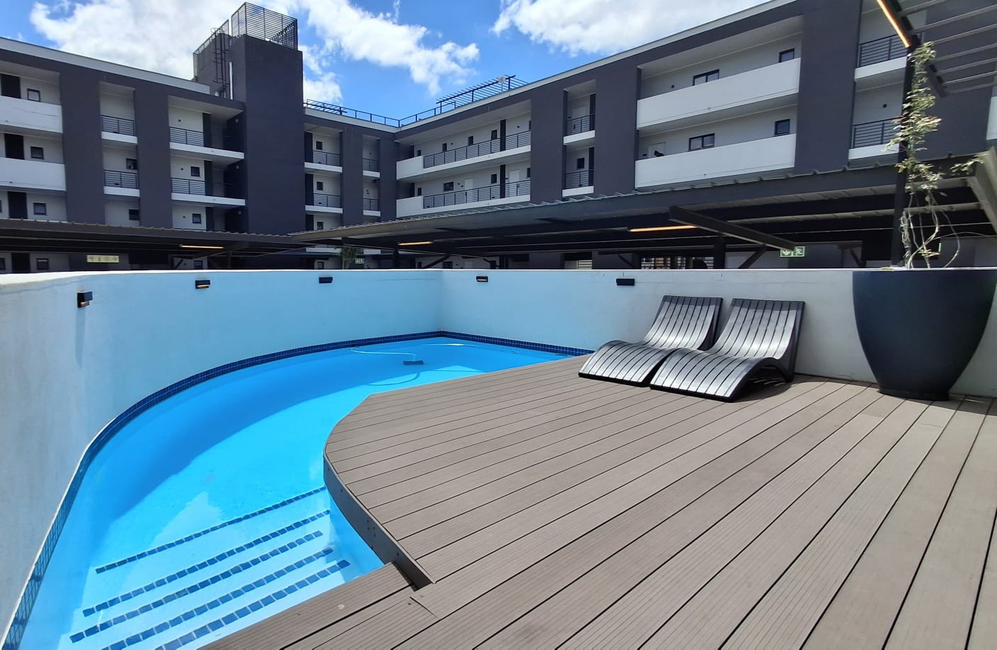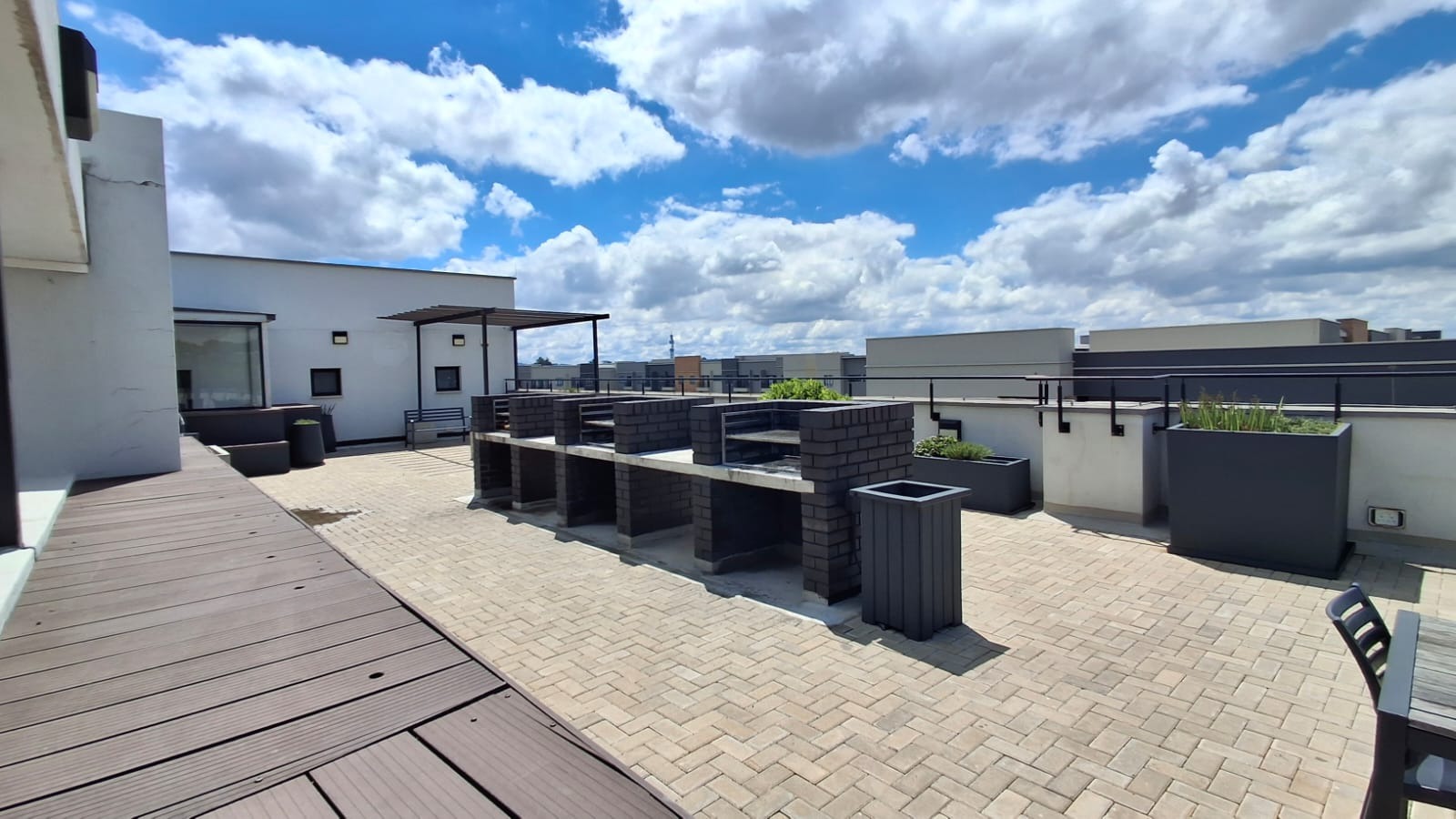 Beyond the private balcony, a world of exclusive amenities awaits. Indulge in the expansive rooftop terrace, featuring multiple built-in braai areas, dedicated dining zones, and a unique giant chess set, all set against scenic views. A sparkling communal swimming pool with a stylish composite deck and lounge chairs offers a refreshing escape, complemented by a fully equipped gym and a sophisticated clubhouse with a built-in bar, perfect for social gatherings.