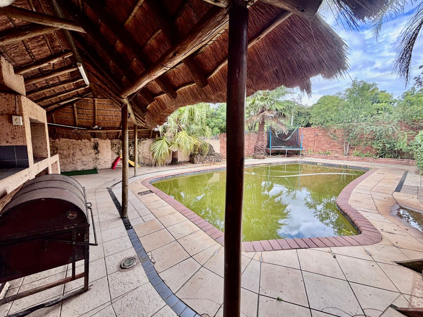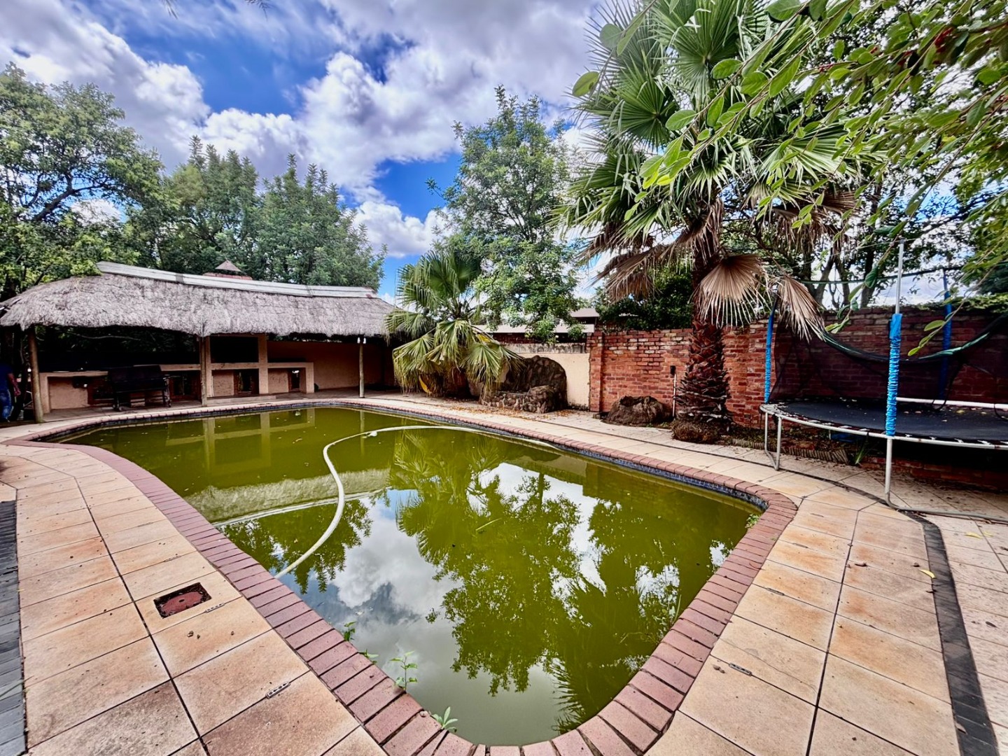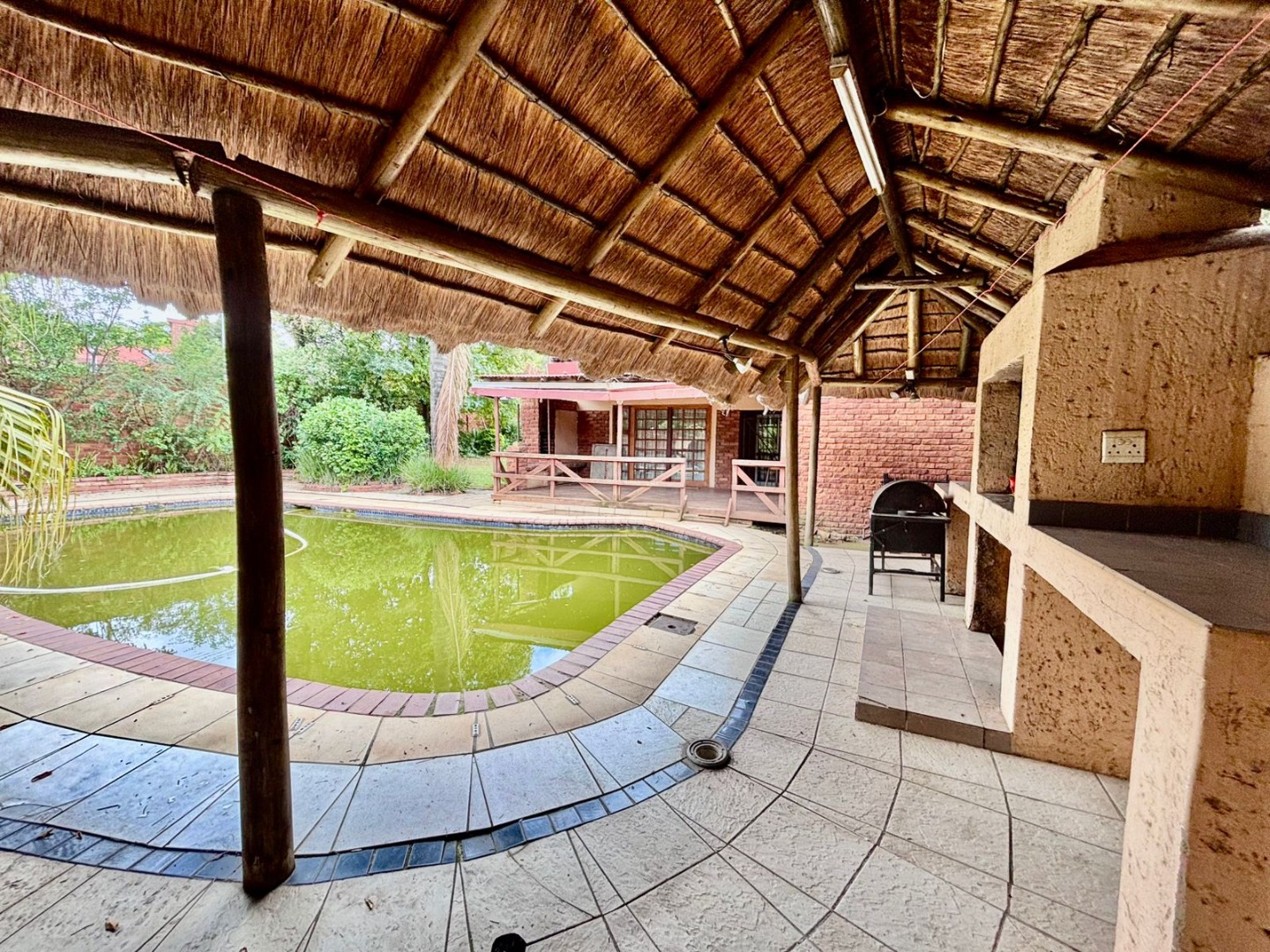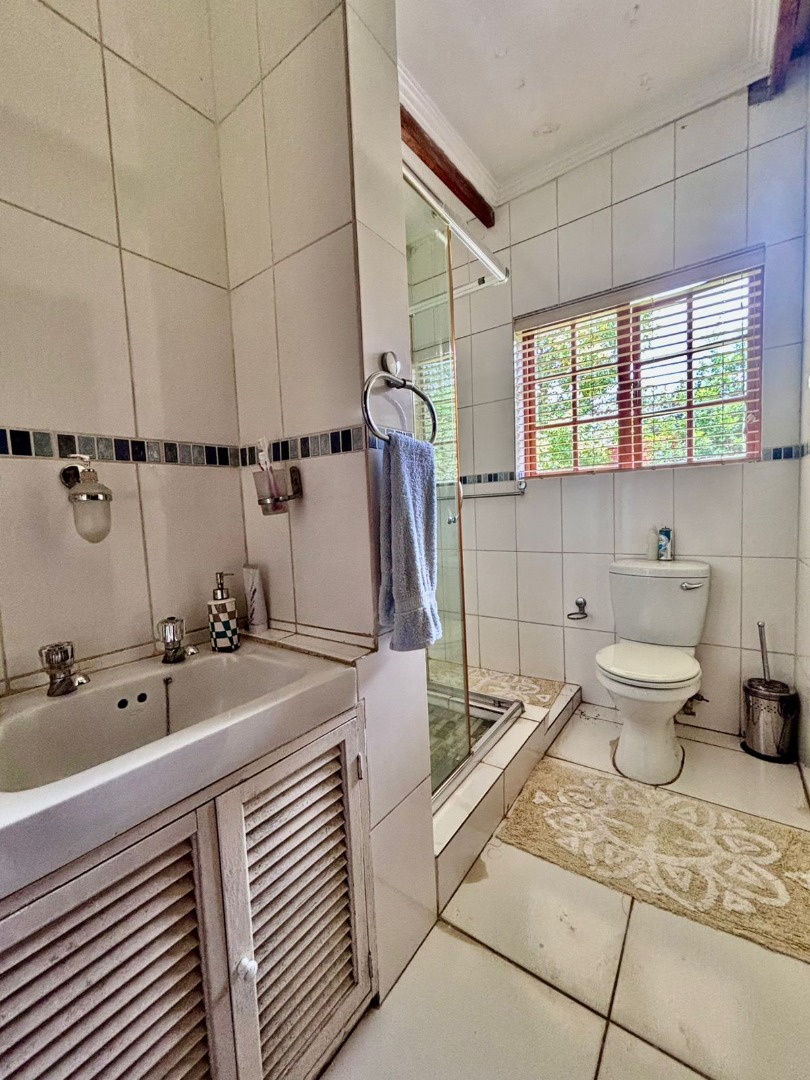 Outdoor living is equally well-catered for, with a private garden providing a serene backdrop for relaxation. Enjoy leisurely afternoons by the swimming pool, or entertain guests on the spacious patio and deck areas. A charming lapa offers an ideal spot for outdoor dining and socialising. Practical features include an irrigation system to maintain the lush garden, paved areas, and a secure driveway leading to two garages and six additional parking spaces, ensuring ample parking for residents and visitors alike. Further conveniences include a dedicated laundry room and ample storage solutions throughout the property.