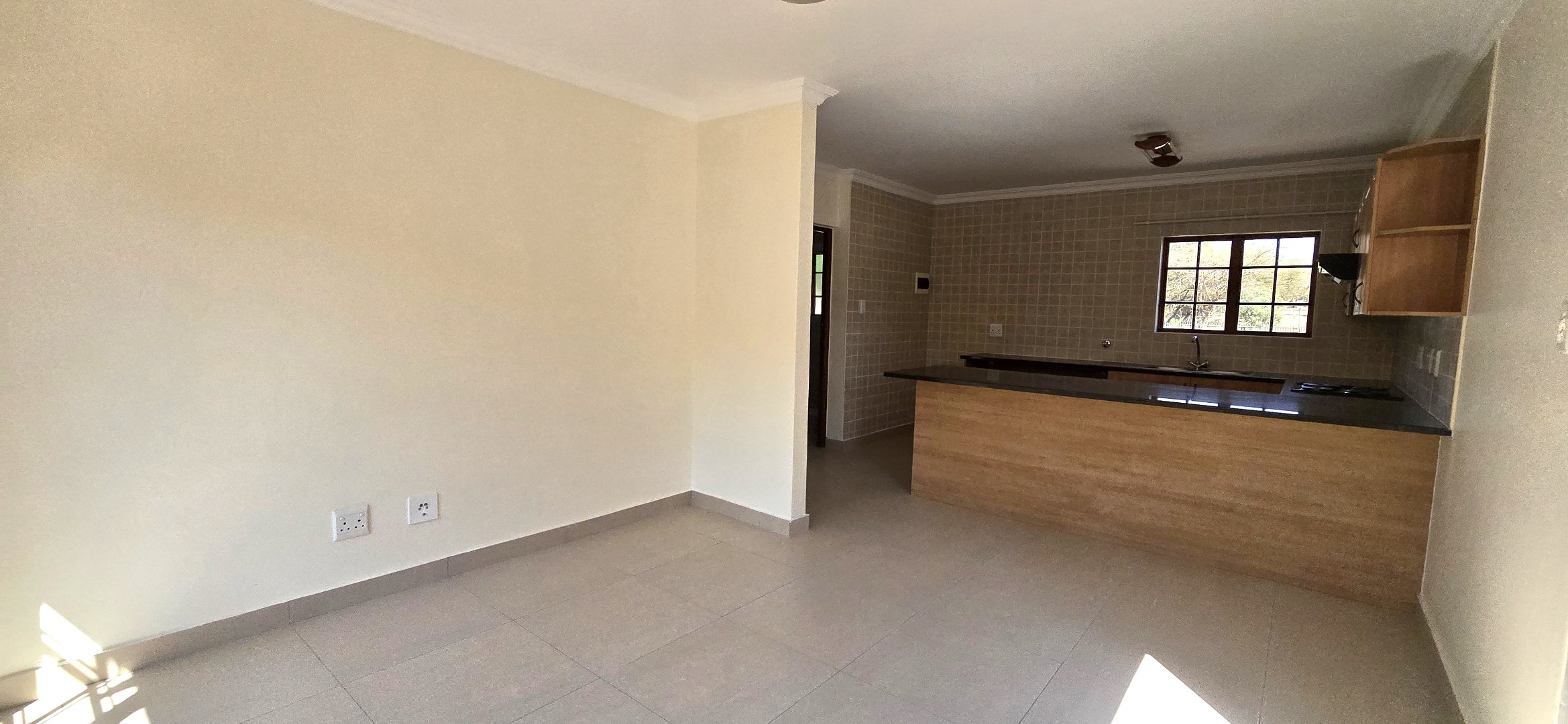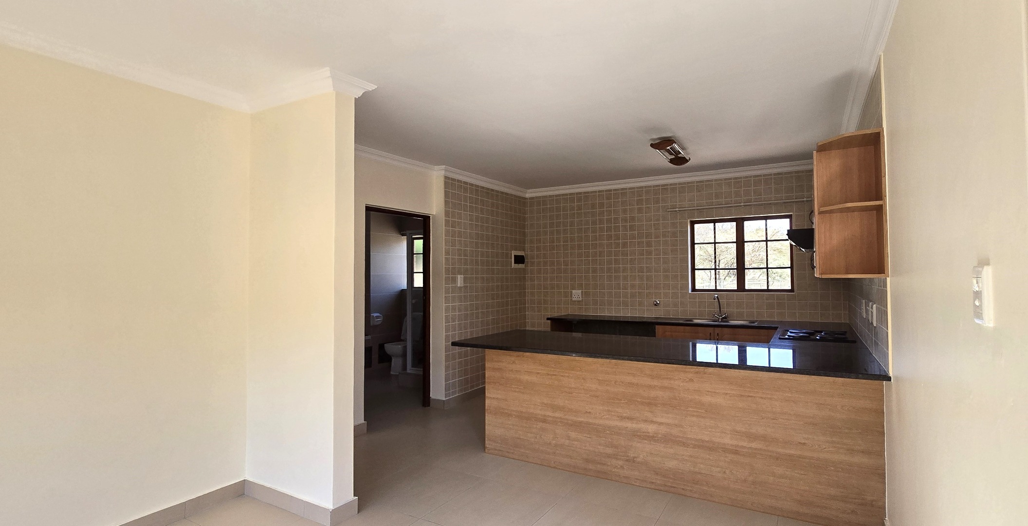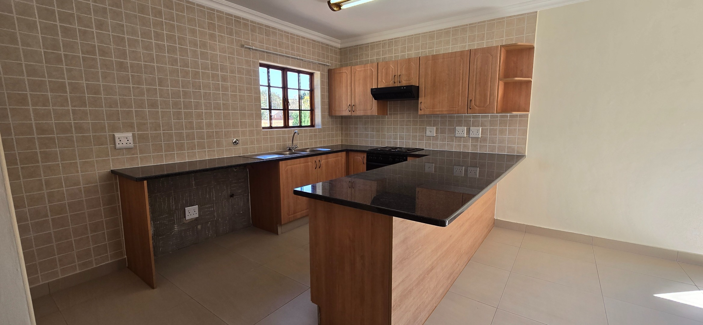 • Open-Plan Kitchen – Granite countertops, stove & extractor fan, 1 water inlets, space for fridge & tumble-dryer.