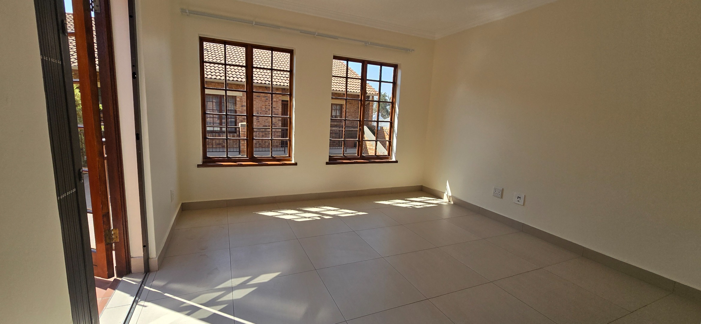 • Open-Plan Living & Dining Area – Natural sunlight, TV point, and double wooden doors leading to a balcony.