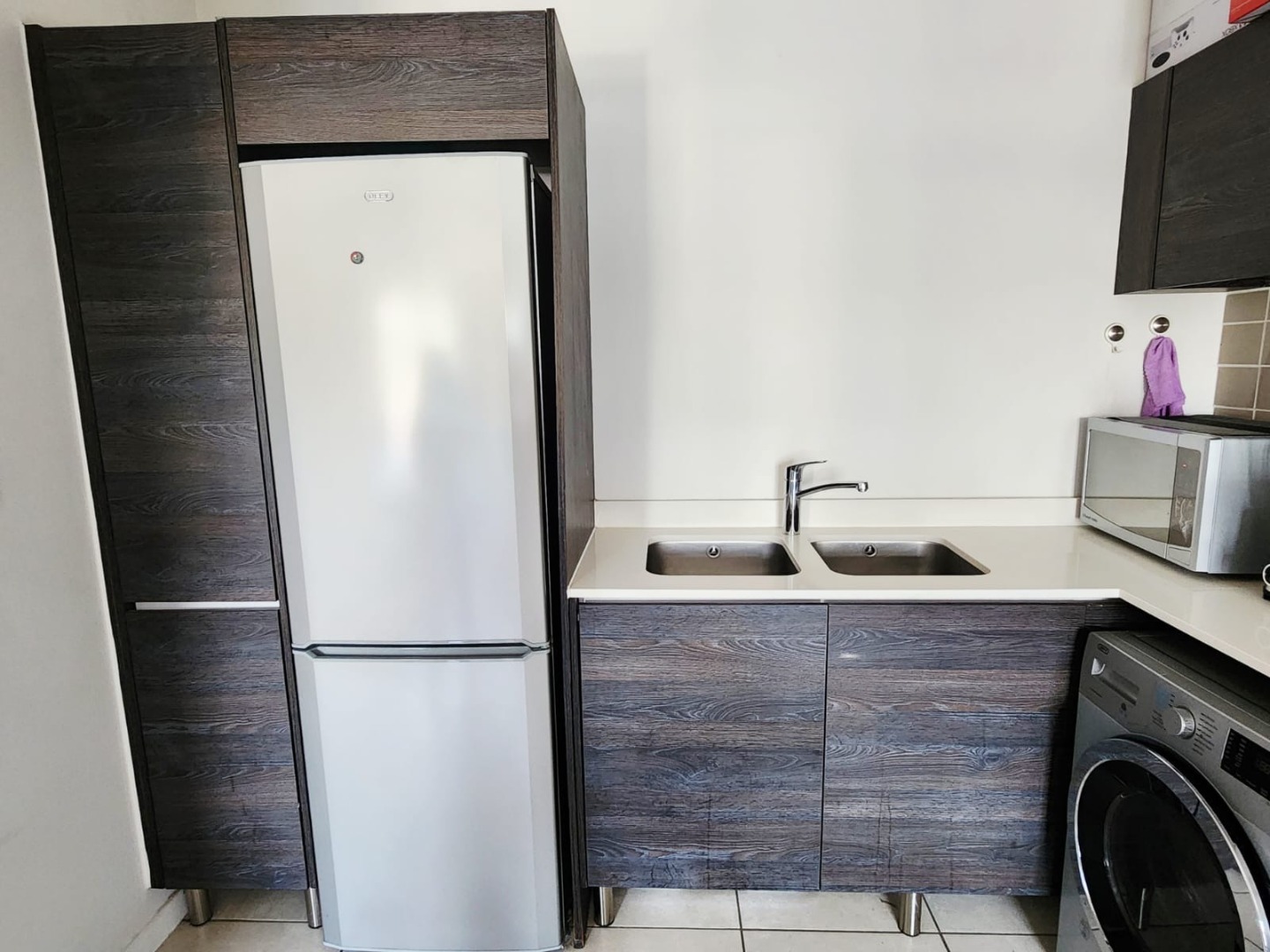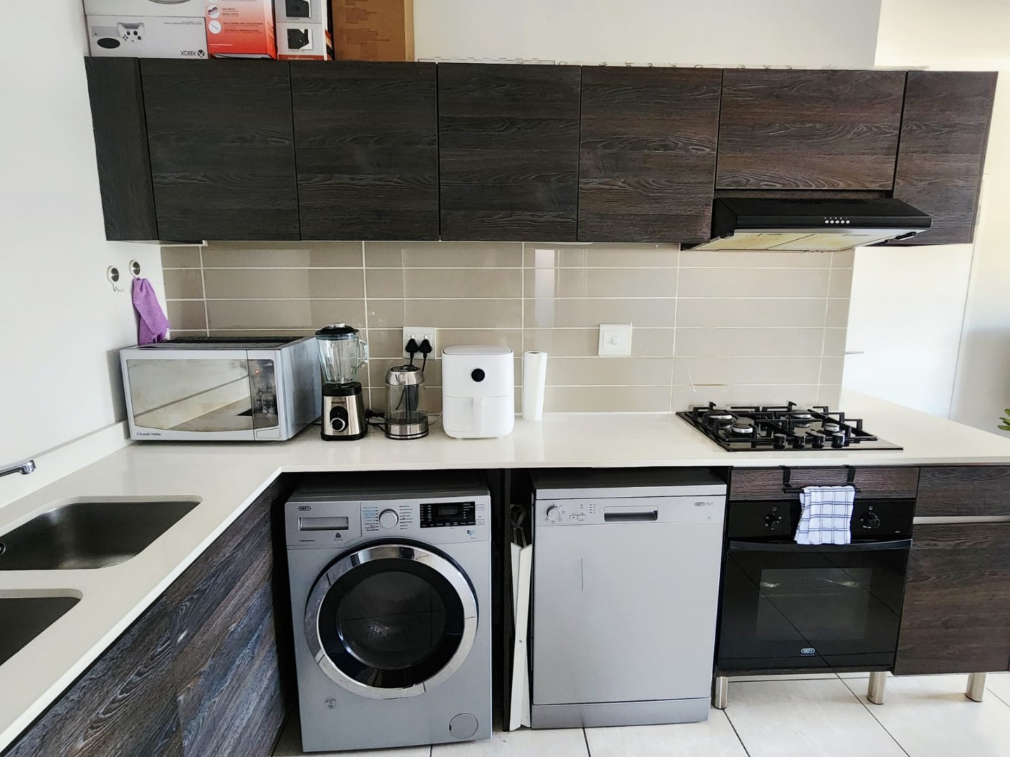 The kitchen boasts modern dark wood-grain cabinetry, light countertops, a double sink, and integrated appliances including a gas hob, oven, washing machine, and dishwasher, ensuring convenience and functionality. Tiled flooring extends throughout, creating a clean and cohesive aesthetic.