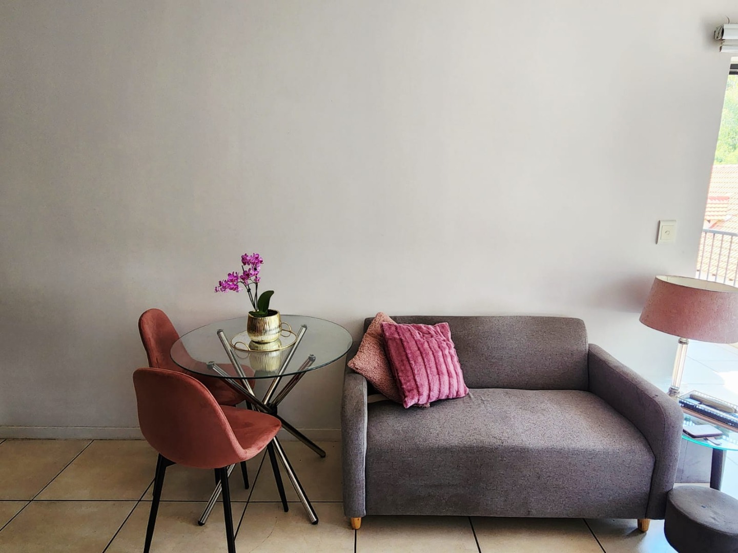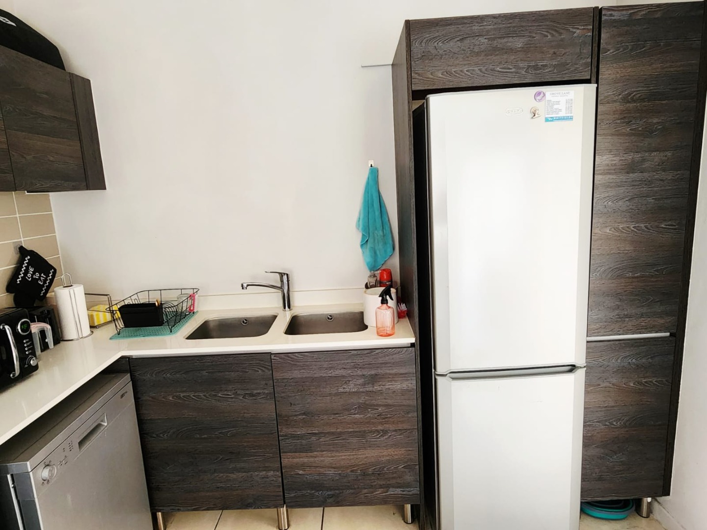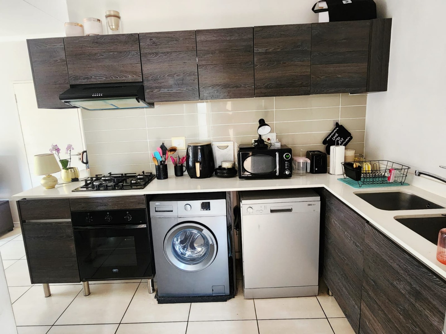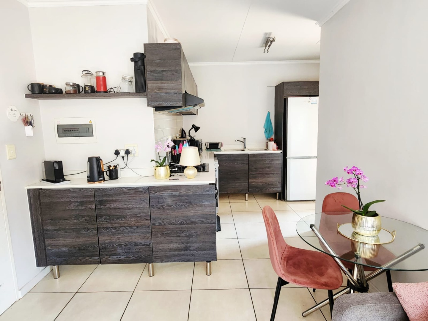 This modern 46 sqm apartment offers a comfortable and contemporary living experience in Pretoria's Equestria suburb. The open-plan interior features a sleek kitchen with dark wood grain cabinetry, light countertops, a double sink, built-in oven, gas hob, and extractor fan, alongside spaces for a washing machine and dishwasher. The well-lit lounge area provides direct access to a private balcony, perfect for relaxation and enjoying the green views.