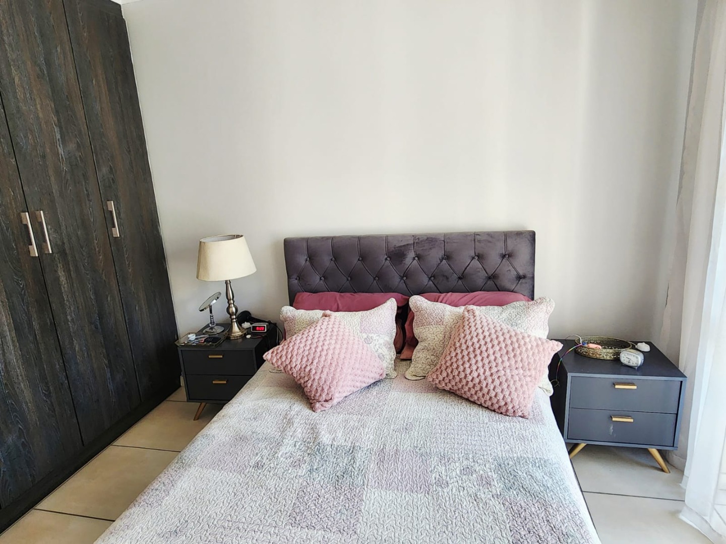The apartment includes one inviting bedroom and one bathroom. The bedroom boasts a stylish dark tufted headboard, modern nightstands, and a large, dark wood built-in wardrobe for ample storage. Sliding doors connect the bedroom to the private balcony, ensuring abundant natural light throughout the space.