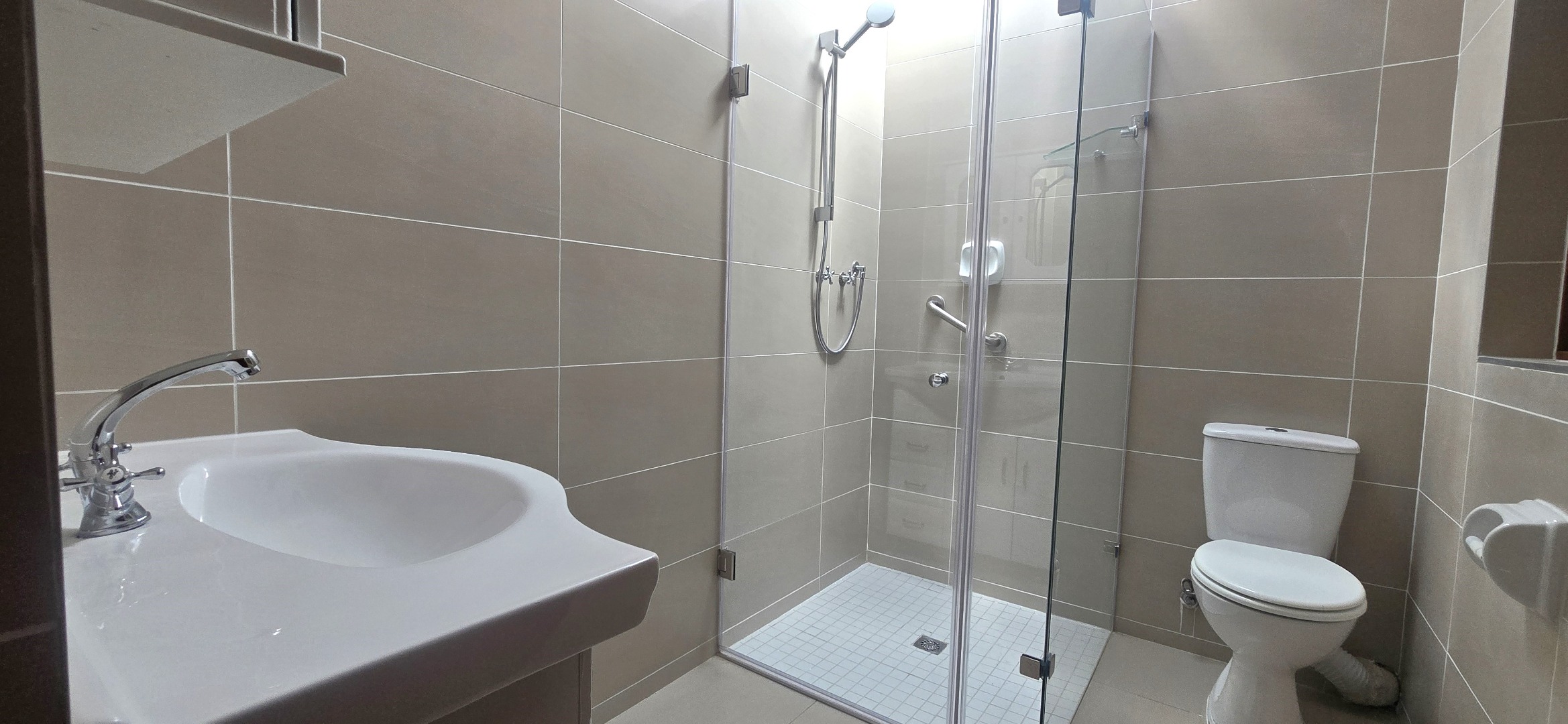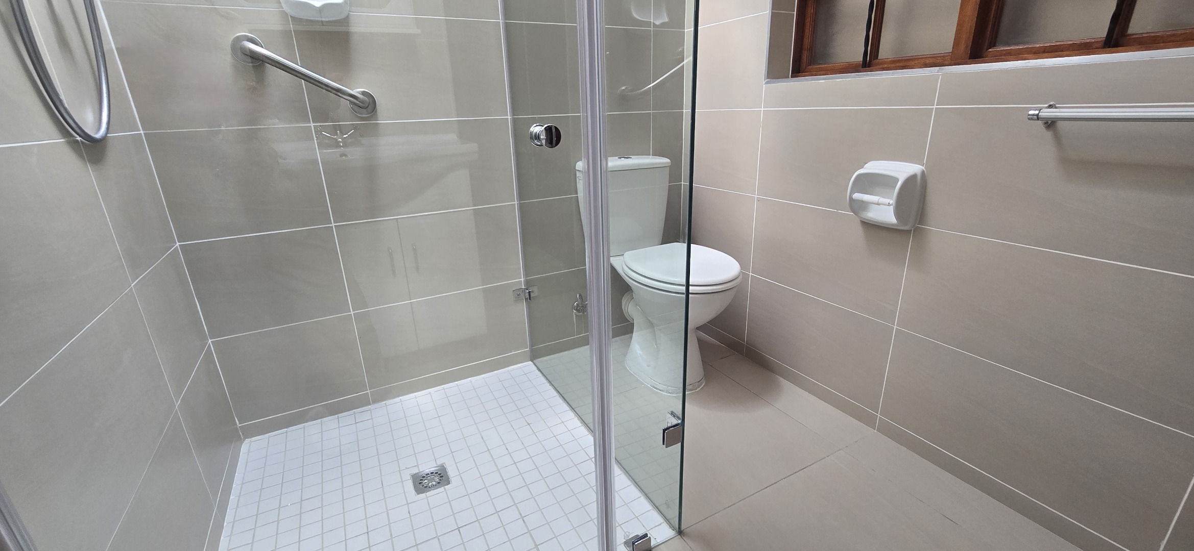 • Bathroom with shower, basin and toilet, fitted with grab rails for added safety,