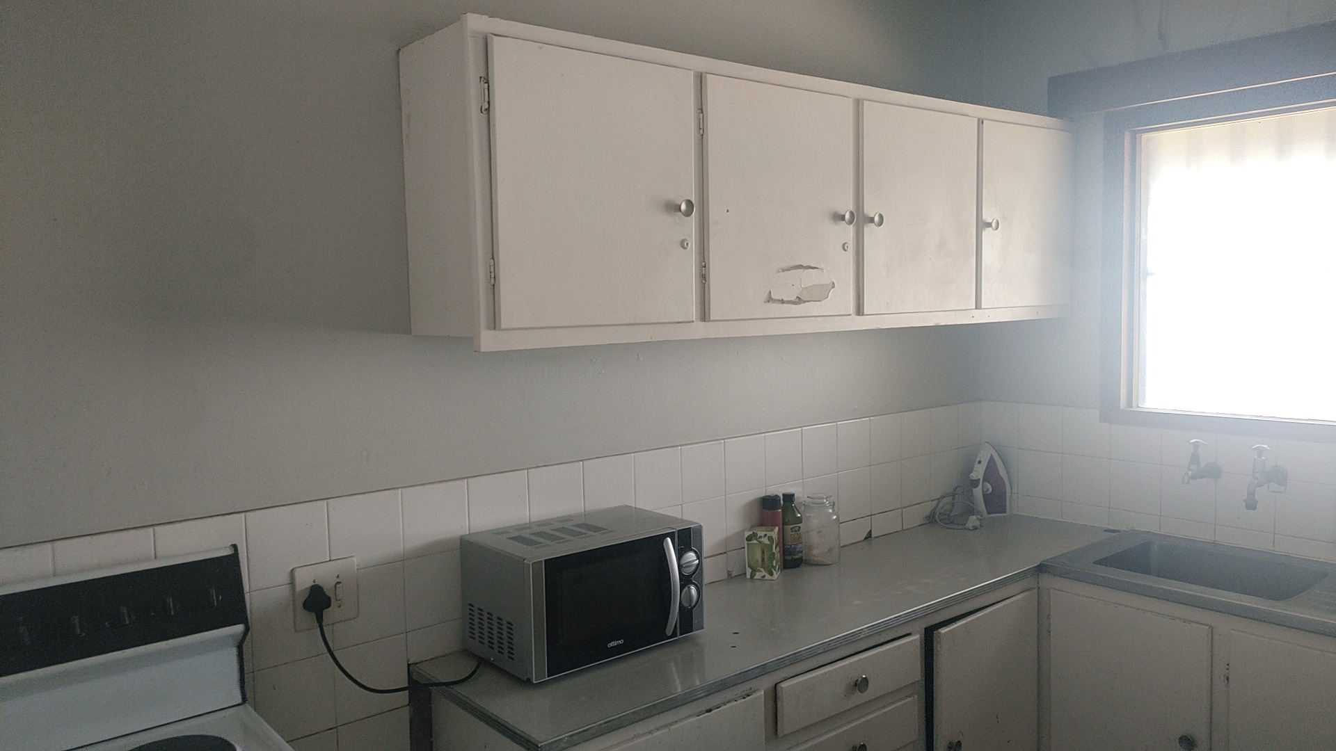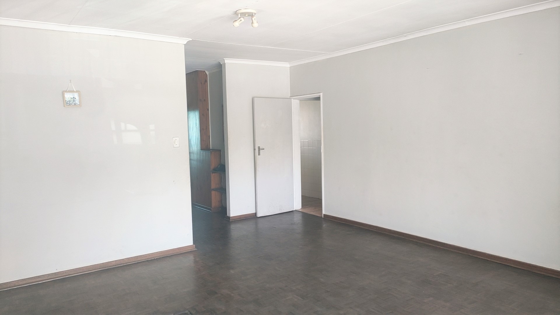 Inside, the apartment offers a practical layout designed for comfortable living. It comprises two spacious old-world bedrooms and one bathroom, alongside a dedicated lounge with parquet flooring and a functional kitchen that can possibly be converted to an open plan one. The interior spaces present a neutral palette with light gray/off-white walls, providing a blank canvas for personalization. Classic parquet flooring, though showing signs of wear, offers significant potential for restoration to its original charm. Architectural details include crown molding and a distinctive white-painted brick accent wall, adding character to the living areas.