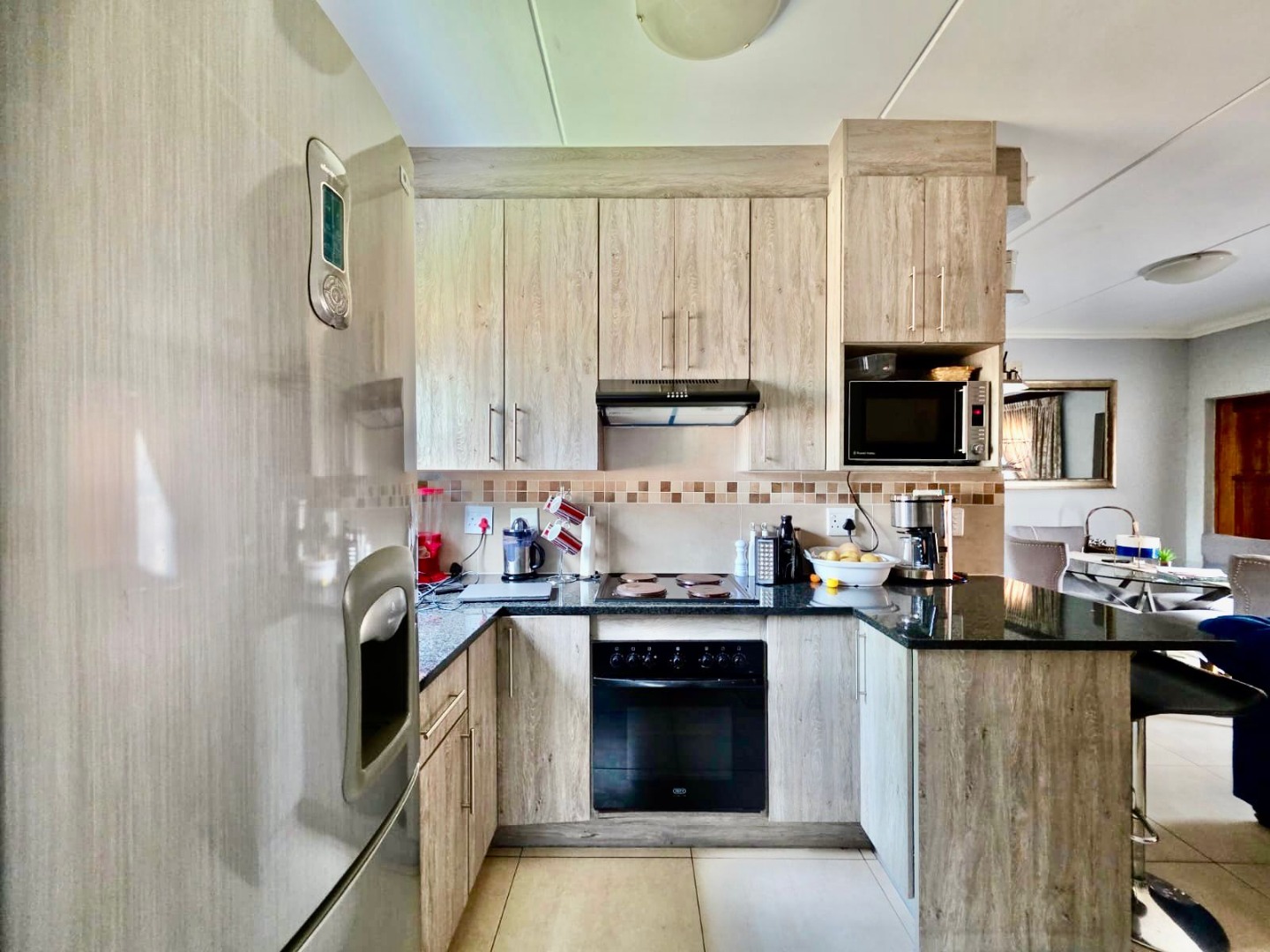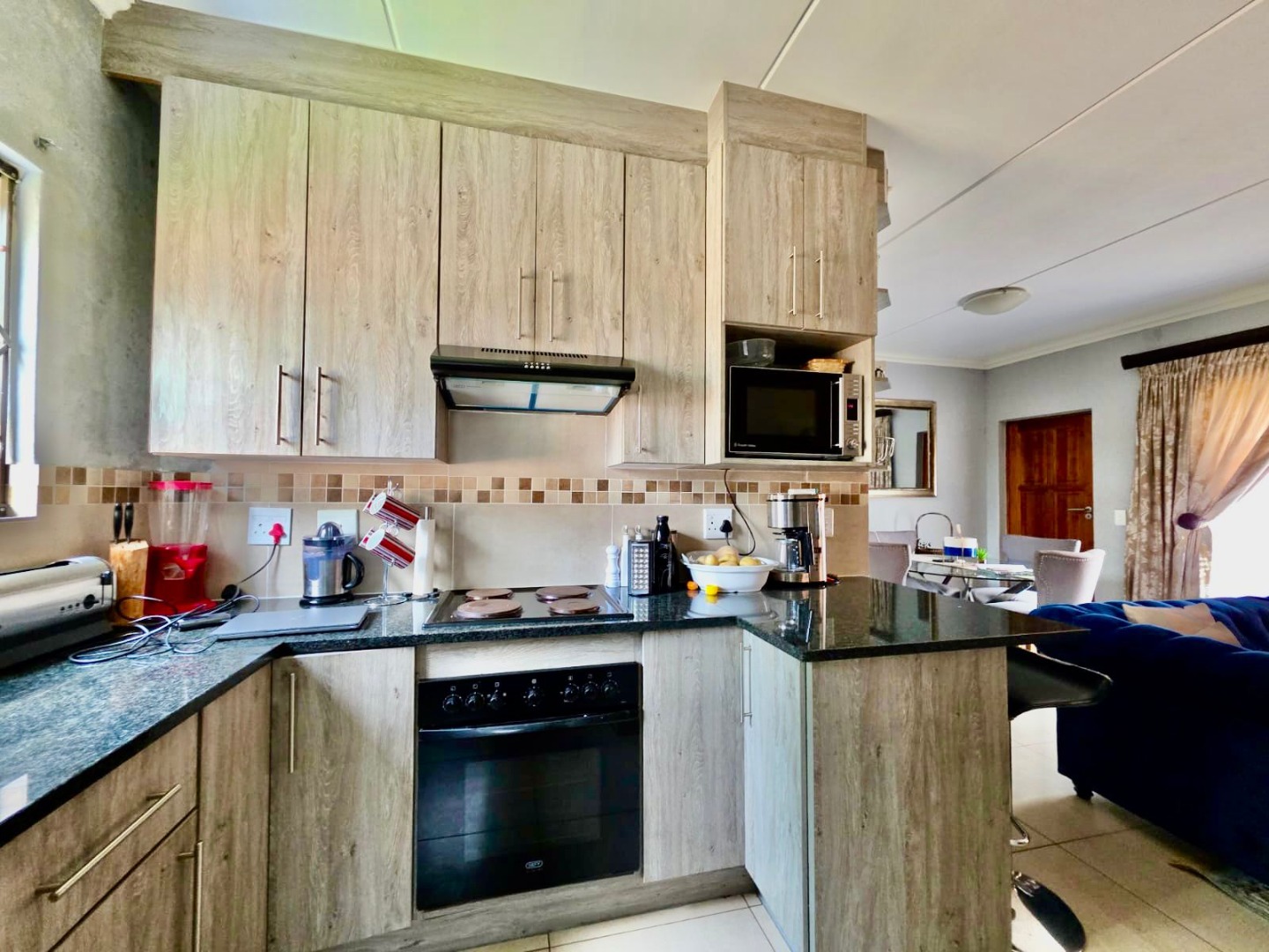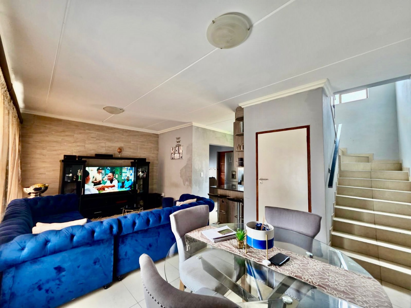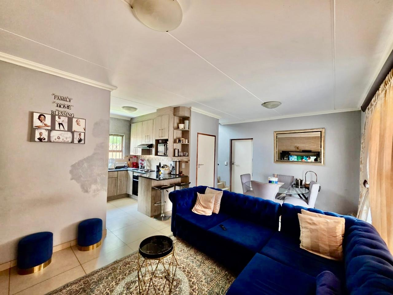 This distinguished two-story residence, ideally situated in the desirable suburban enclave of Montana, Pretoria, presents an exceptional opportunity for discerning buyers seeking a harmonious blend of comfort and contemporary living. The property’s exterior, characterized by a peach/beige finish and classic terracotta roof tiles, offers a welcoming aesthetic, complemented by modern window frames and a double garage with dark brown doors, accessible via a paved driveway. Upon entry, residents are greeted by an expansive open-plan living environment, meticulously designed to facilitate seamless interaction between the lounge, dining area, and a contemporary kitchen. The kitchen stands as a focal point, featuring elegant light wood-grain cabinetry, dark granite countertops, and a stylish tiled backsplash. It is comprehensively equipped with stainless steel appliances, including an integrated oven, hob, and extractor fan, alongside a built-in microwave. A functional breakfast bar extends from the main counter, providing an informal dining option, while a dedicated dining area accommodates a glass table, perfect for formal gatherings. The living space is further enhanced by a vibrant blue sectional sofa and a tiled feature wall, creating an inviting atmosphere. The residence offers three generously proportioned bedrooms, ensuring ample private accommodation. The master suite benefits from a luxurious en-suite bathroom, providing a private sanctuary. An additional well-appointed bathroom serves the remaining bedrooms, and a convenient guest toilet is located on the ground floor, catering to both residents and visitors. The property's floor plan, spanning 137.00 square meters, is thoughtfully laid out to maximize space and functionality, with tiled flooring extending throughout the main living areas. Exterior amenities include a double garage and a paved driveway, providing secure parking for multiple vehicles. The presence of a garden enhances the outdoor appeal, offering a private space for relaxation or recreation. Situated within a security complex, the property benefits from enhanced safety measures, including an access gate, contributing to a secure and tranquil living environment. Montana, a prominent metropolitan suburb in Pretoria, South Africa, offers a desirable lifestyle characterized by its accessibility to essential amenities, reputable educational institutions, and various retail and recreational facilities. This location ensures convenience without compromising on the suburban tranquility. Key Features of this Residence: * Three Bedrooms * Two Bathrooms (One En-suite) * One Guest Toilet * Open-Plan Living, Dining, and Kitchen * Modern Kitchen with Granite Countertops and Stainless Steel Appliances * Double Garage * Paved Driveway * Garden * Located within a Security Complex with Access Gate * 137 sqm Floor Size