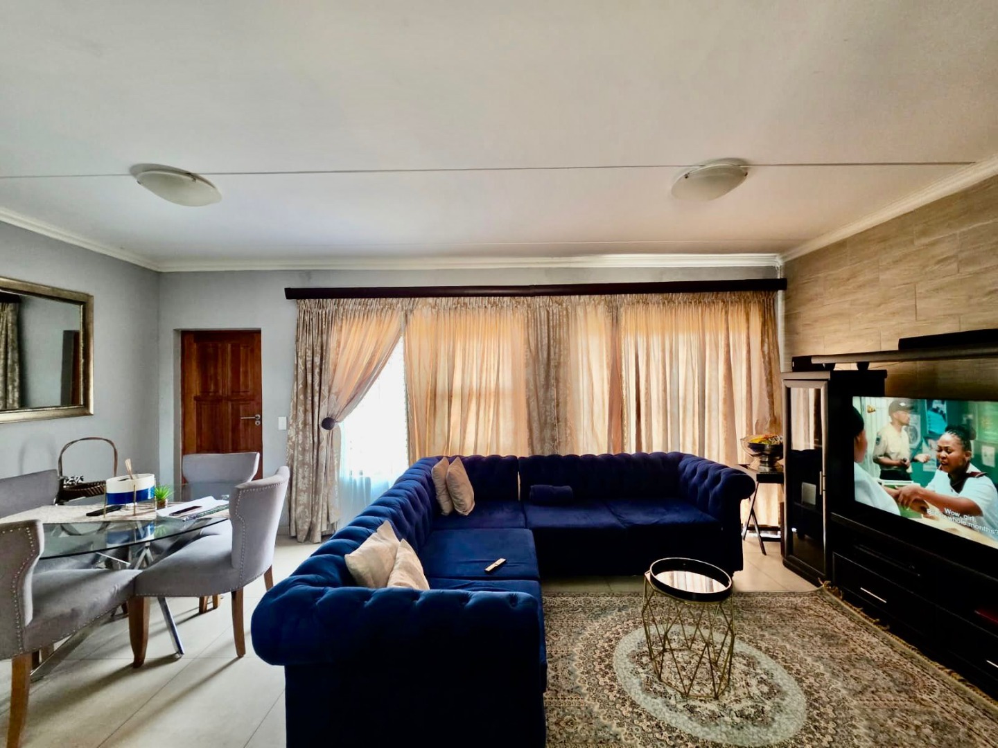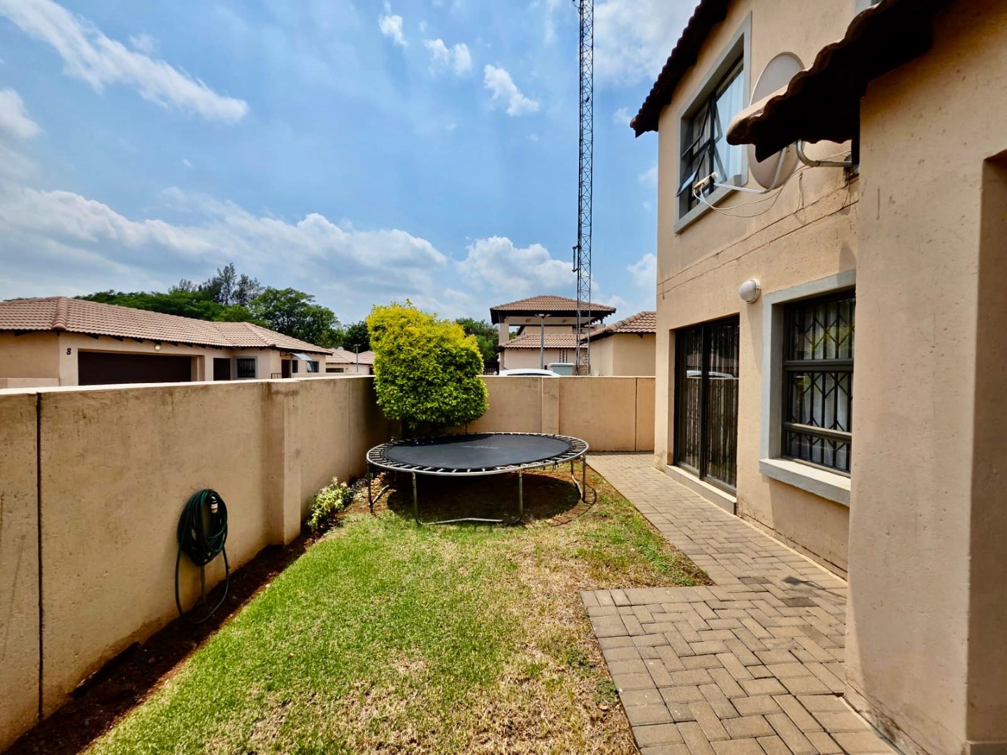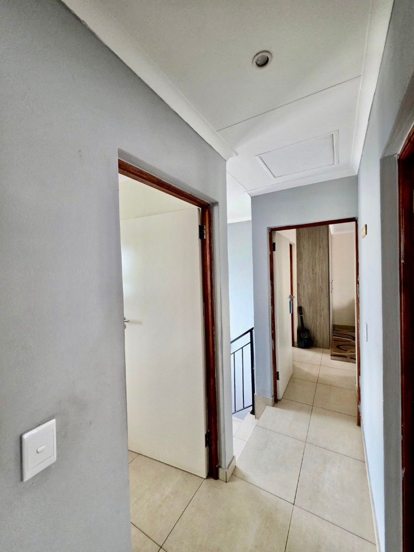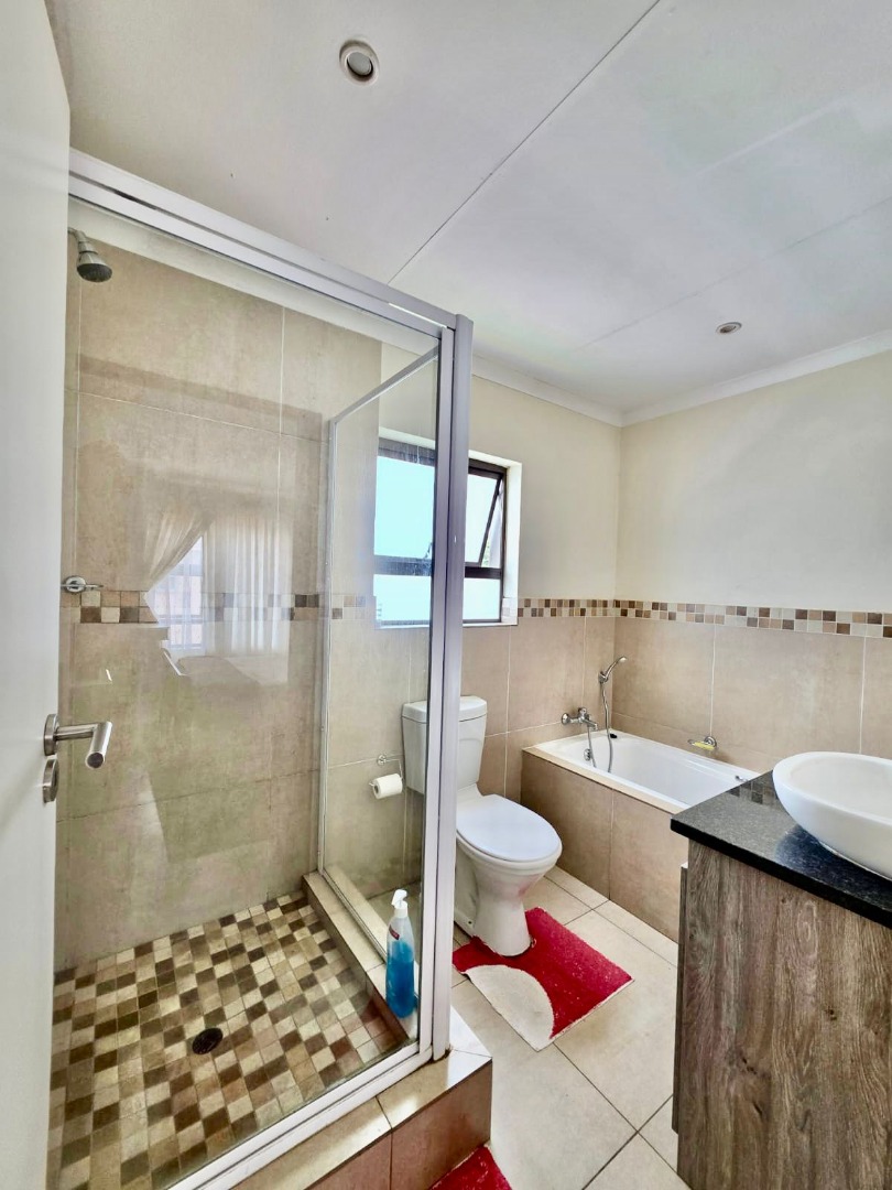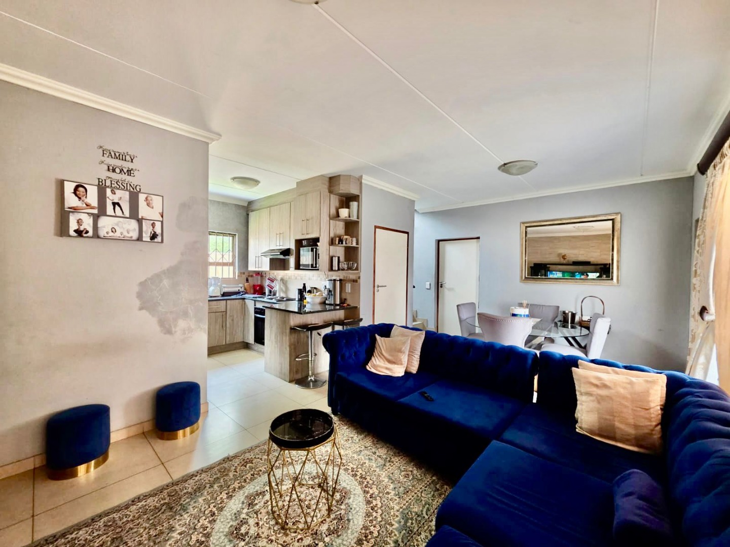 This distinguished two-story residence, ideally situated in the desirable suburban enclave of Montana, Pretoria, presents an exceptional opportunity for discerning buyers seeking a harmonious blend of comfort and contemporary living. The property’s exterior, characterized by a peach/beige finish and classic terracotta roof tiles, offers a welcoming aesthetic, complemented by modern window frames and a double garage with dark brown doors, accessible via a paved driveway. Upon entry, residents are greeted by an expansive open-plan living environment, meticulously designed to facilitate seamless interaction between the lounge, dining area, and a contemporary kitchen. The kitchen stands as a focal point, featuring elegant light wood-grain cabinetry, dark granite countertops, and a stylish tiled backsplash. It is comprehensively equipped with stainless steel appliances, including an integrated oven, hob, and extractor fan, alongside a built-in microwave. A functional breakfast bar extends from the main counter, providing an informal dining option, while a dedicated dining area accommodates a glass table, perfect for formal gatherings. The living space is further enhanced by a vibrant blue sectional sofa and a tiled feature wall, creating an inviting atmosphere. The residence offers three generously proportioned bedrooms, ensuring ample private accommodation. The master suite benefits from a luxurious en-suite bathroom, providing a private sanctuary. An additional well-appointed bathroom serves the remaining bedrooms, and a convenient guest toilet is located on the ground floor, catering to both residents and visitors. The property's floor plan, spanning 137.00 square meters, is thoughtfully laid out to maximize space and functionality, with tiled flooring extending throughout the main living areas. Exterior amenities include a double garage and a paved driveway, providing secure parking for multiple vehicles. The presence of a garden enhances the outdoor appeal, offering a private space for relaxation or recreation. Situated within a security complex, the property benefits from enhanced safety measures, including an access gate, contributing to a secure and tranquil living environment. Montana, a prominent metropolitan suburb in Pretoria, South Africa, offers a desirable lifestyle characterized by its accessibility to essential amenities, reputable educational institutions, and various retail and recreational facilities. This location ensures convenience without compromising on the suburban tranquility. Key Features of this Residence: * Three Bedrooms * Two Bathrooms (One En-suite) * One Guest Toilet * Open-Plan Living, Dining, and Kitchen * Modern Kitchen with Granite Countertops and Stainless Steel Appliances * Double Garage * Paved Driveway * Garden * Located within a Security Complex with Access Gate * 137 sqm Floor Size