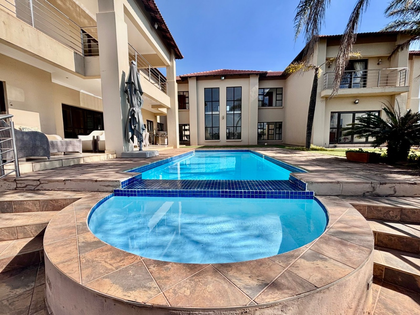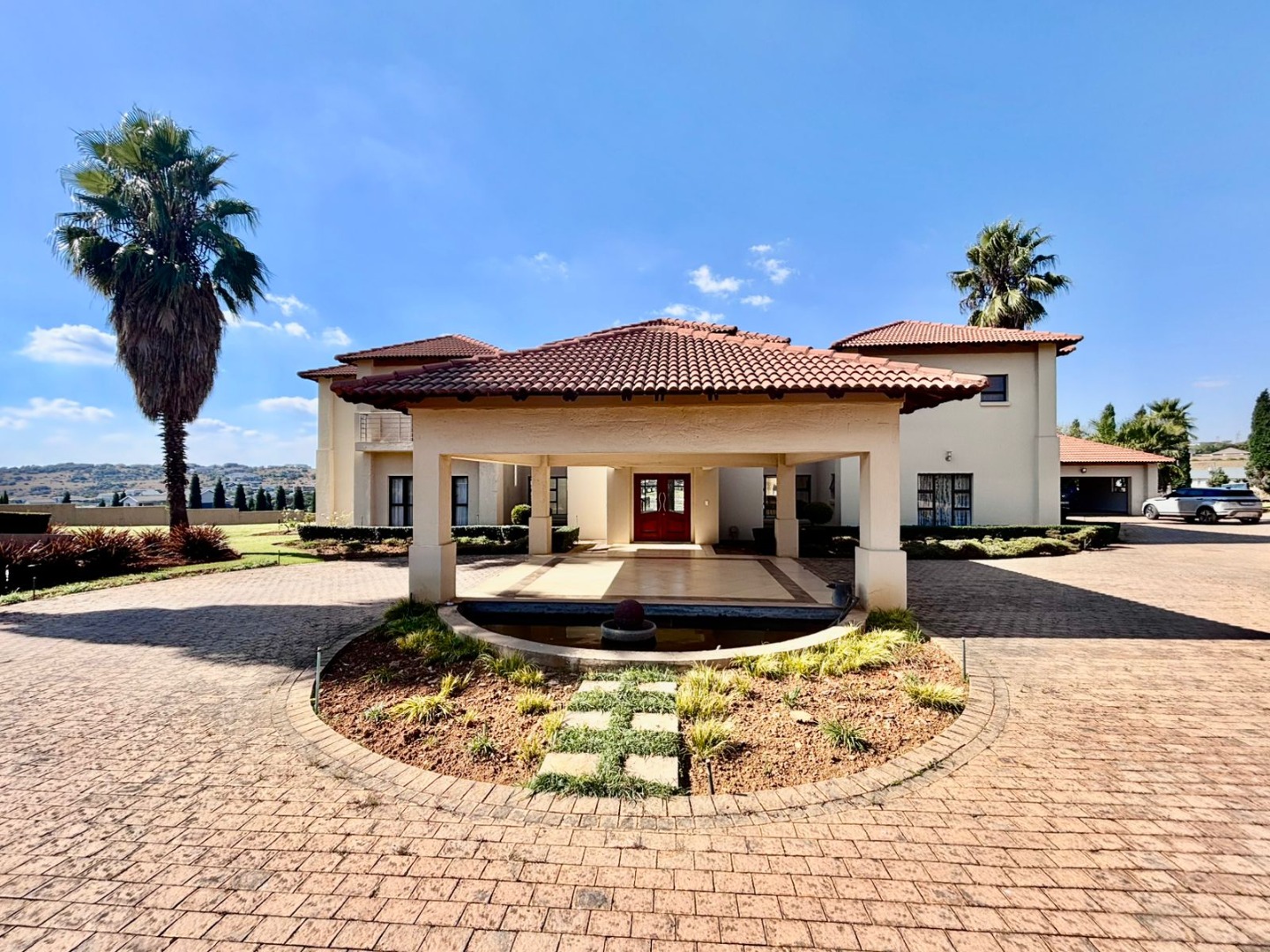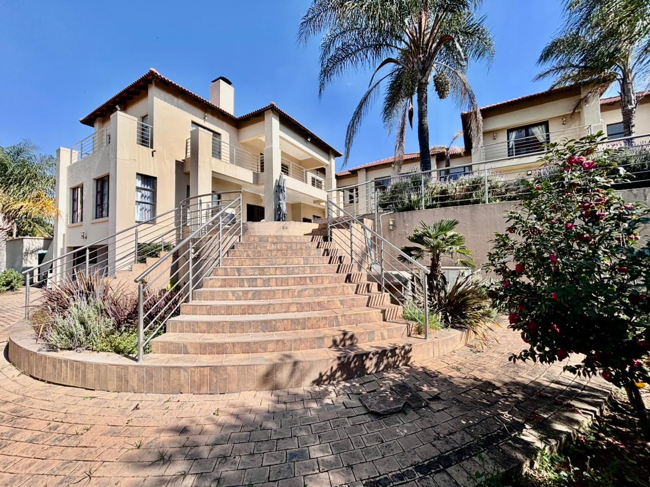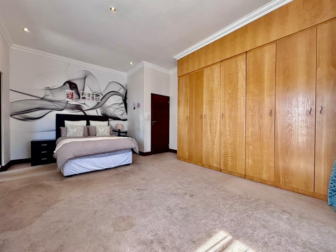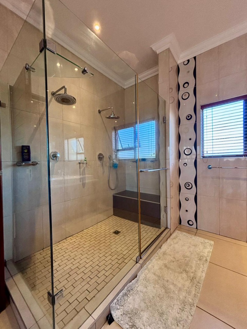 Nestled within the prestigious Mooikloof Glen security estate in Pretoria, South Africa, this magnificent residence epitomises opulent living on an expansive 8785 sqm erf. From the moment of arrival, the property's commanding kerb appeal is undeniable, featuring a grand Mediterranean-inspired architectural style with a classic terracotta roof and a light-coloured facade. An extensive paved circular driveway, adorned with mature palm trees and a decorative water feature, leads to a stately porte-cochère entrance, offering both convenience and an impressive welcome. The elevated position affords distant scenic views, enhancing the sense of exclusivity and tranquility. Step inside to discover an interior designed for grandeur and sophisticated comfort. The double-volume entrance hall is a breathtaking spectacle, boasting high ceilings, polished tile flooring with an elegant medallion, and a dramatic double curved staircase with modern railings, bathed in natural light from soaring windows. This central architectural marvel sets the tone for the home's luxurious flow. The residence offers an abundance of living spaces, including three distinct lounges and a formal dining room, providing versatile settings for both intimate gatherings and lavish entertaining. The presence of two fully equipped kitchens ensures culinary excellence and convenience, while a dedicated study offers a private sanctuary for work or contemplation. The open-plan design seamlessly connects these magnificent spaces, fostering an atmosphere of effortless elegance. Accommodation is nothing short of exceptional, with five generously proportioned bedrooms, each a private retreat. Five of these bedrooms boast luxurious en-suite bathrooms, complemented by an additional guest toilet, ensuring ultimate comfort and privacy for residents and guests alike. The bedrooms are appointed with extensive built-in wooden wardrobes, offering ample storage, and are illuminated by large windows and modern recessed lighting. The bathrooms are spacious and light-filled, featuring separate glass-enclosed showers, built-in tiled bathtubs, and contemporary vanities, creating spa-like environments within the home. Beyond the interiors, the estate unfolds into a resort-like outdoor paradise. A captivating tiered swimming pool complex invites relaxation and recreation, surrounded by multiple balconies and a spacious patio perfect for al fresco dining and entertaining, complete with a built-in braai. The meticulously manicured garden, sustained by an irrigation system and water tanks, provides a lush backdrop to this outdoor haven. Practical amenities include six garages and ten additional parking spaces, ensuring ample accommodation for vehicles. The property further benefits from staff quarters, domestic rooms, and a second house, presenting exceptional potential for dual living or accommodating a large retinue. Residents also enjoy access to a club house within the estate. Security is paramount within this esteemed security estate, featuring 24-hour security, an access gate, intercom system, and security gates, providing peace of mind. The property is equipped with a sprinkler system, ensuring the pristine condition of the grounds. This is more than a home; it is a lifestyle statement, offering unparalleled luxury and comfort in a secure and prestigious setting. Key Features: * 5 Bedrooms, 6.5 Bathrooms (5 En-suite) * 3 Lounges, 1 Dining Room, 2 Kitchens * Grand Double Curved Staircase Entrance Hall * Tiered Swimming Pool & Patio with Built-in Braai * 6 Garages & 10 Parking Spaces * Staff Quarters, Domestic Rooms & Second House * Study, Balcony, Pantry, Guest Toilet * Security Estate with 24-Hour Security & Access Gate * Erf Size: 8785 sqm, Floor Size: 1182 sqm