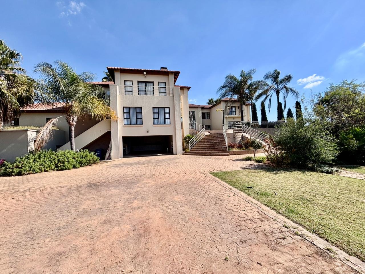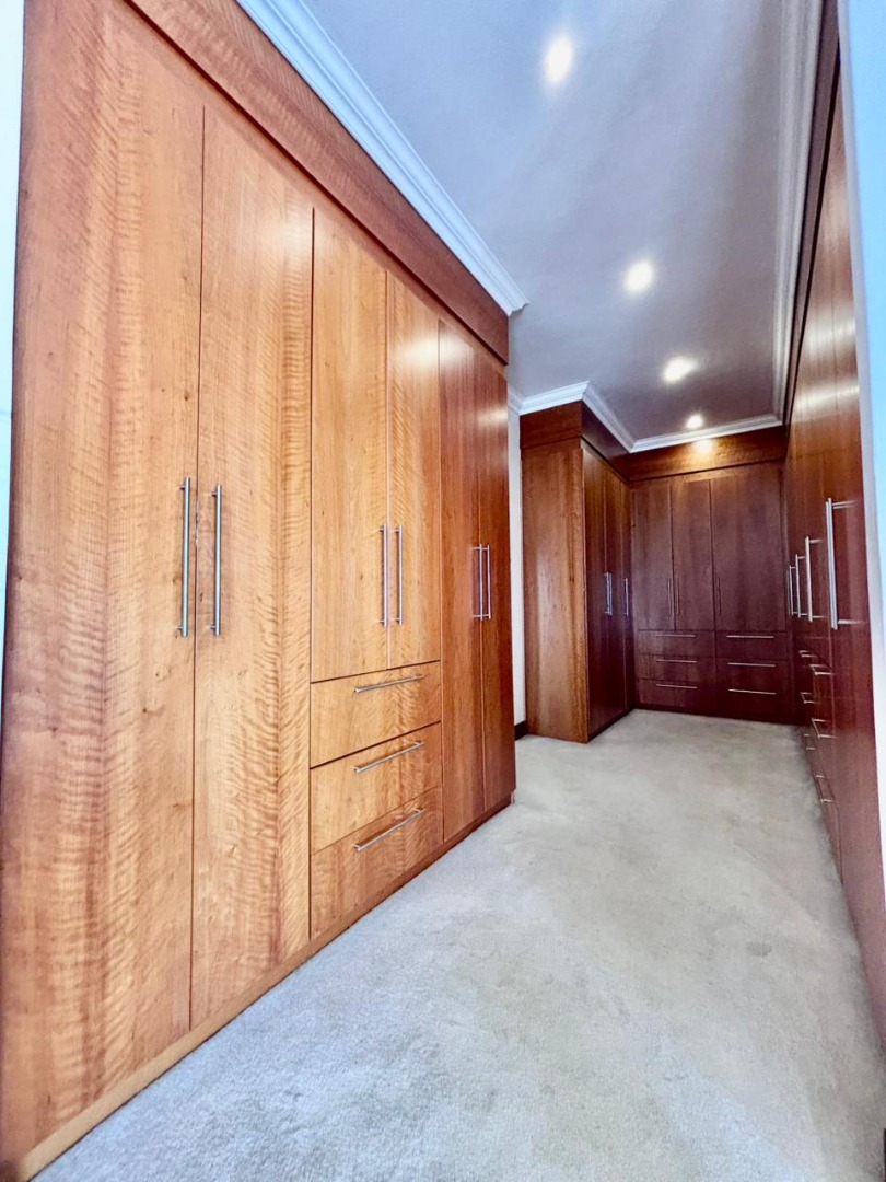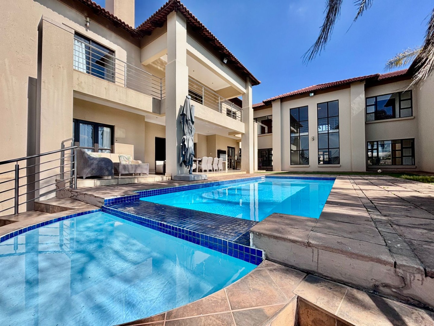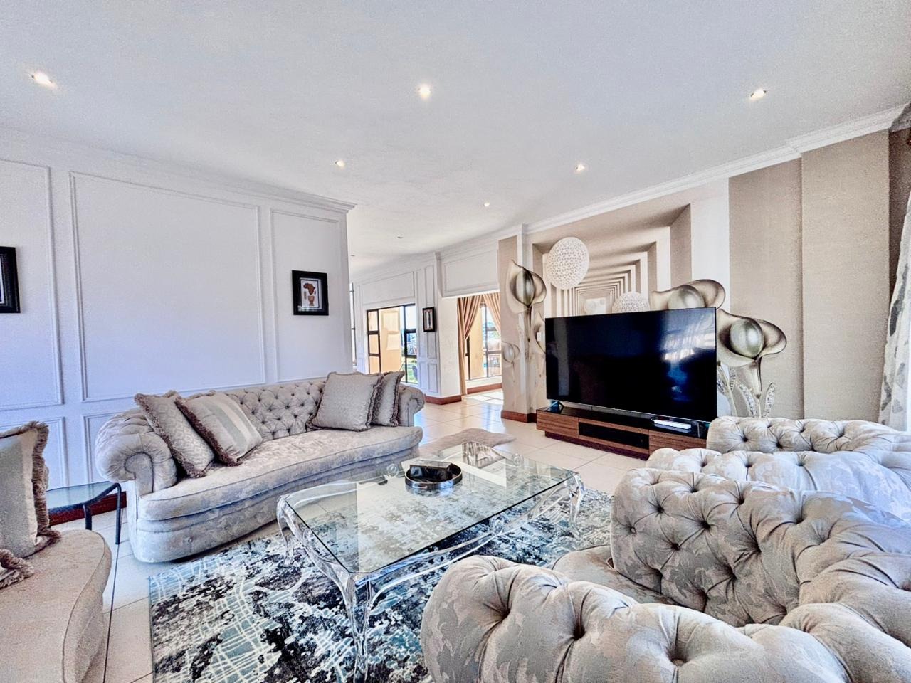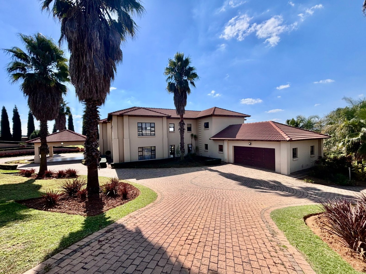 Nestled within the prestigious Mooikloof Glen security estate in Pretoria, South Africa, this magnificent residence epitomises opulent living on an expansive 8785 sqm erf. From the moment of arrival, the property's commanding kerb appeal is undeniable, featuring a grand Mediterranean-inspired architectural style with a classic terracotta roof and a light-coloured facade. An extensive paved circular driveway, adorned with mature palm trees and a decorative water feature, leads to a stately porte-cochère entrance, offering both convenience and an impressive welcome. The elevated position affords distant scenic views, enhancing the sense of exclusivity and tranquility. Step inside to discover an interior designed for grandeur and sophisticated comfort. The double-volume entrance hall is a breathtaking spectacle, boasting high ceilings, polished tile flooring with an elegant medallion, and a dramatic double curved staircase with modern railings, bathed in natural light from soaring windows. This central architectural marvel sets the tone for the home's luxurious flow. The residence offers an abundance of living spaces, including three distinct lounges and a formal dining room, providing versatile settings for both intimate gatherings and lavish entertaining. The presence of two fully equipped kitchens ensures culinary excellence and convenience, while a dedicated study offers a private sanctuary for work or contemplation. The open-plan design seamlessly connects these magnificent spaces, fostering an atmosphere of effortless elegance. Accommodation is nothing short of exceptional, with five generously proportioned bedrooms, each a private retreat. Five of these bedrooms boast luxurious en-suite bathrooms, complemented by an additional guest toilet, ensuring ultimate comfort and privacy for residents and guests alike. The bedrooms are appointed with extensive built-in wooden wardrobes, offering ample storage, and are illuminated by large windows and modern recessed lighting. The bathrooms are spacious and light-filled, featuring separate glass-enclosed showers, built-in tiled bathtubs, and contemporary vanities, creating spa-like environments within the home. Beyond the interiors, the estate unfolds into a resort-like outdoor paradise. A captivating tiered swimming pool complex invites relaxation and recreation, surrounded by multiple balconies and a spacious patio perfect for al fresco dining and entertaining, complete with a built-in braai. The meticulously manicured garden, sustained by an irrigation system and water tanks, provides a lush backdrop to this outdoor haven. Practical amenities include six garages and ten additional parking spaces, ensuring ample accommodation for vehicles. The property further benefits from staff quarters, domestic rooms, and a second house, presenting exceptional potential for dual living or accommodating a large retinue. Residents also enjoy access to a club house within the estate. Security is paramount within this esteemed security estate, featuring 24-hour security, an access gate, intercom system, and security gates, providing peace of mind. The property is equipped with a sprinkler system, ensuring the pristine condition of the grounds. This is more than a home; it is a lifestyle statement, offering unparalleled luxury and comfort in a secure and prestigious setting. Key Features: * 5 Bedrooms, 6.5 Bathrooms (5 En-suite) * 3 Lounges, 1 Dining Room, 2 Kitchens * Grand Double Curved Staircase Entrance Hall * Tiered Swimming Pool & Patio with Built-in Braai * 6 Garages & 10 Parking Spaces * Staff Quarters, Domestic Rooms & Second House * Study, Balcony, Pantry, Guest Toilet * Security Estate with 24-Hour Security & Access Gate * Erf Size: 8785 sqm, Floor Size: 1182 sqm