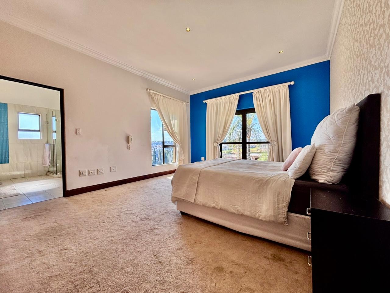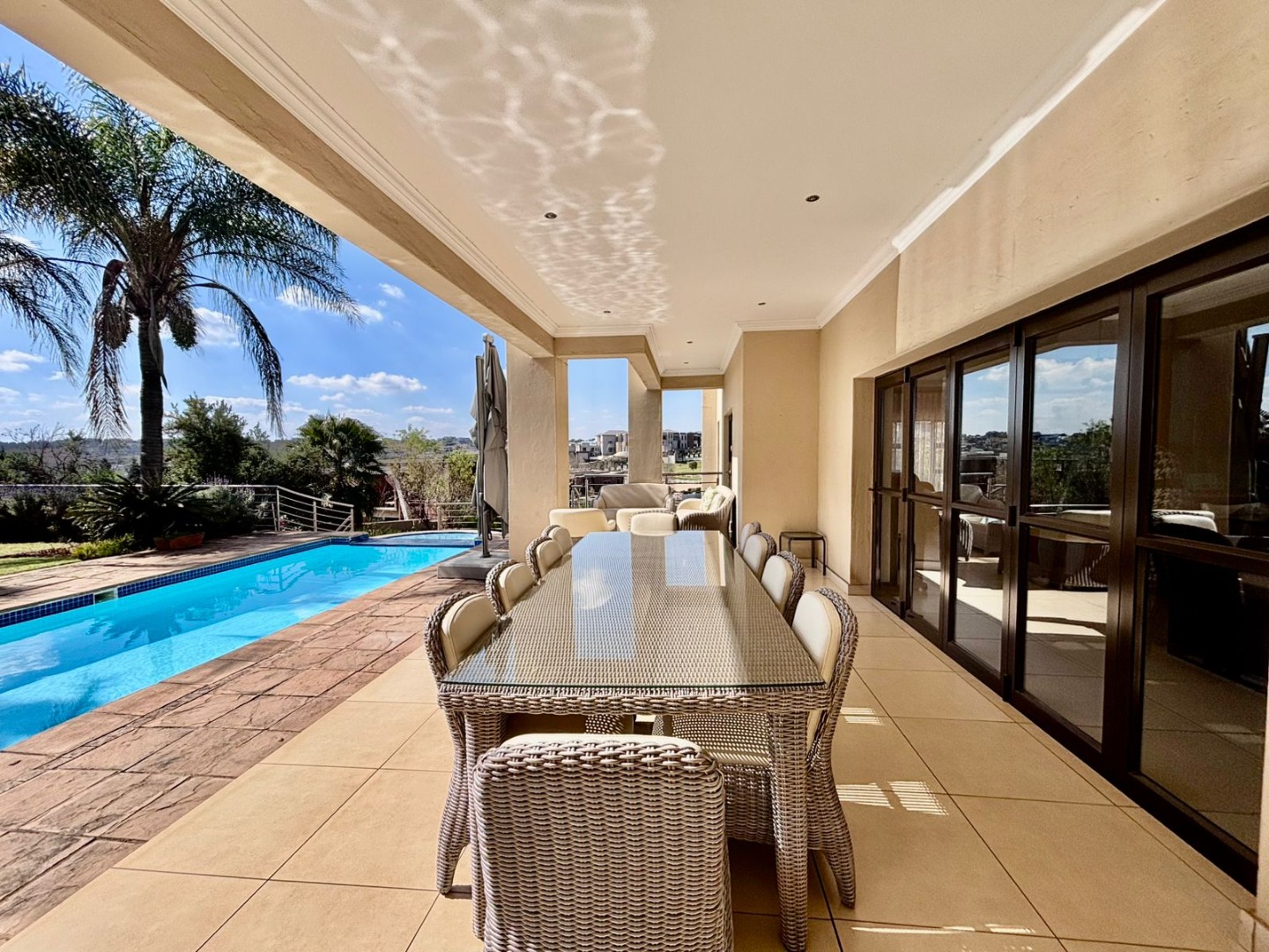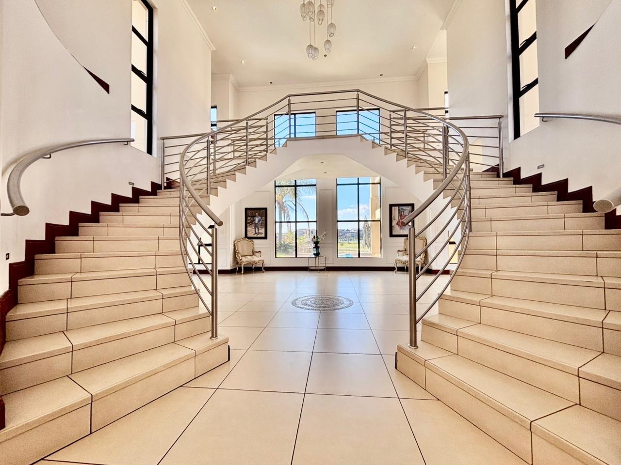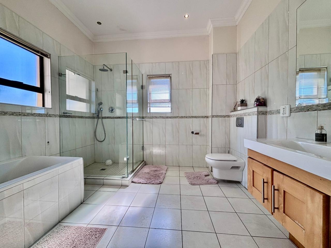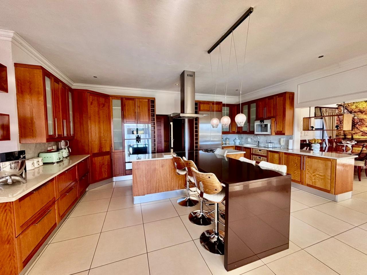 Nestled within the prestigious Mooikloof Glen security estate in Pretoria, South Africa, this magnificent residence epitomises opulent living on an expansive 8785 sqm erf. From the moment of arrival, the property's commanding kerb appeal is undeniable, featuring a grand Mediterranean-inspired architectural style with a classic terracotta roof and a light-coloured facade. An extensive paved circular driveway, adorned with mature palm trees and a decorative water feature, leads to a stately porte-cochère entrance, offering both convenience and an impressive welcome. The elevated position affords distant scenic views, enhancing the sense of exclusivity and tranquility. Step inside to discover an interior designed for grandeur and sophisticated comfort. The double-volume entrance hall is a breathtaking spectacle, boasting high ceilings, polished tile flooring with an elegant medallion, and a dramatic double curved staircase with modern railings, bathed in natural light from soaring windows. This central architectural marvel sets the tone for the home's luxurious flow. The residence offers an abundance of living spaces, including three distinct lounges and a formal dining room, providing versatile settings for both intimate gatherings and lavish entertaining. The presence of two fully equipped kitchens ensures culinary excellence and convenience, while a dedicated study offers a private sanctuary for work or contemplation. The open-plan design seamlessly connects these magnificent spaces, fostering an atmosphere of effortless elegance. Accommodation is nothing short of exceptional, with five generously proportioned bedrooms, each a private retreat. Five of these bedrooms boast luxurious en-suite bathrooms, complemented by an additional guest toilet, ensuring ultimate comfort and privacy for residents and guests alike. The bedrooms are appointed with extensive built-in wooden wardrobes, offering ample storage, and are illuminated by large windows and modern recessed lighting. The bathrooms are spacious and light-filled, featuring separate glass-enclosed showers, built-in tiled bathtubs, and contemporary vanities, creating spa-like environments within the home. Beyond the interiors, the estate unfolds into a resort-like outdoor paradise. A captivating tiered swimming pool complex invites relaxation and recreation, surrounded by multiple balconies and a spacious patio perfect for al fresco dining and entertaining, complete with a built-in braai. The meticulously manicured garden, sustained by an irrigation system and water tanks, provides a lush backdrop to this outdoor haven. Practical amenities include six garages and ten additional parking spaces, ensuring ample accommodation for vehicles. The property further benefits from staff quarters, domestic rooms, and a second house, presenting exceptional potential for dual living or accommodating a large retinue. Residents also enjoy access to a club house within the estate. Security is paramount within this esteemed security estate, featuring 24-hour security, an access gate, intercom system, and security gates, providing peace of mind. The property is equipped with a sprinkler system, ensuring the pristine condition of the grounds. This is more than a home; it is a lifestyle statement, offering unparalleled luxury and comfort in a secure and prestigious setting. Key Features: * 5 Bedrooms, 6.5 Bathrooms (5 En-suite) * 3 Lounges, 1 Dining Room, 2 Kitchens * Grand Double Curved Staircase Entrance Hall * Tiered Swimming Pool & Patio with Built-in Braai * 6 Garages & 10 Parking Spaces * Staff Quarters, Domestic Rooms & Second House * Study, Balcony, Pantry, Guest Toilet * Security Estate with 24-Hour Security & Access Gate * Erf Size: 8785 sqm, Floor Size: 1182 sqm