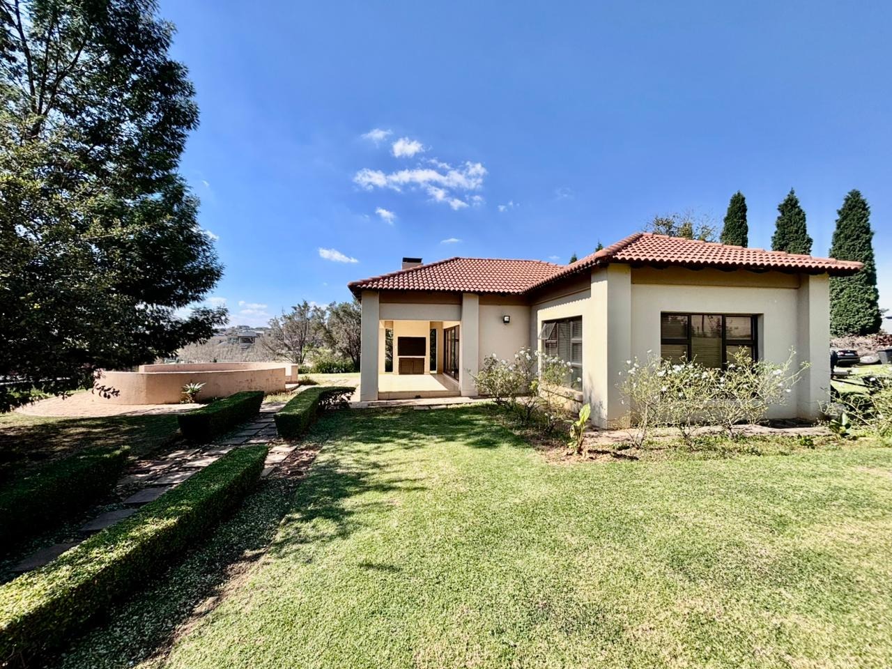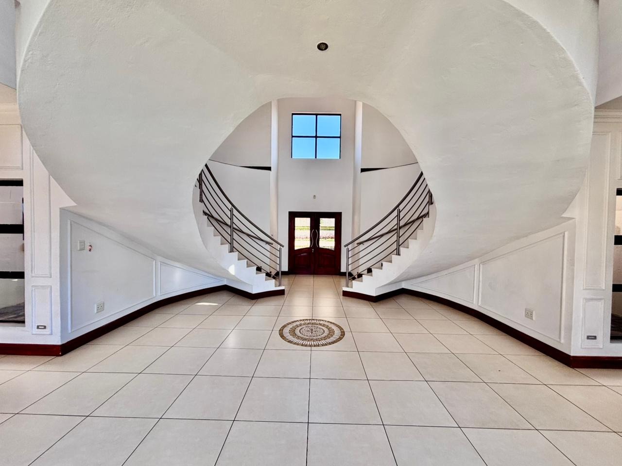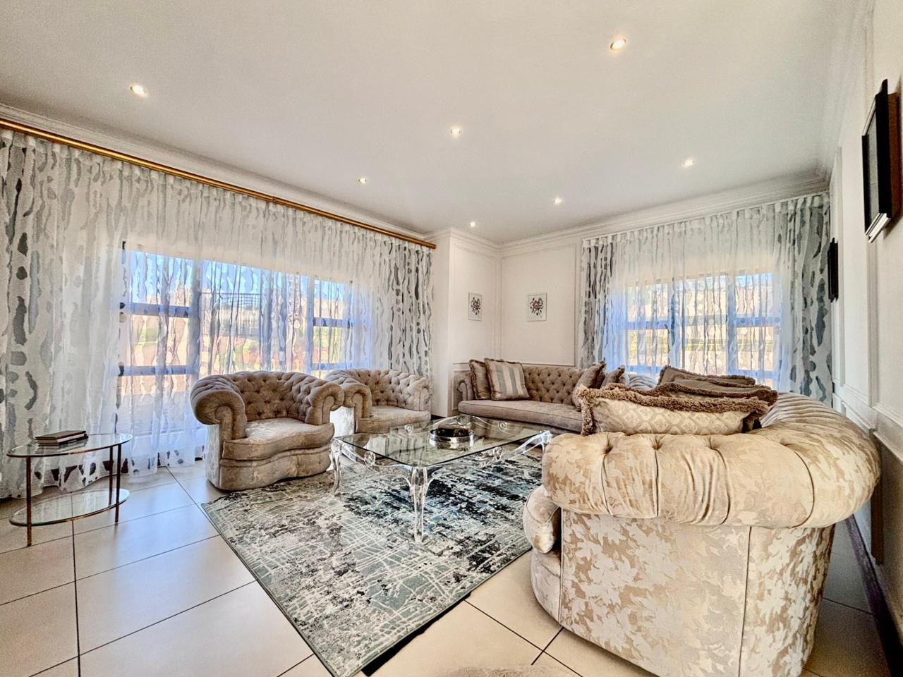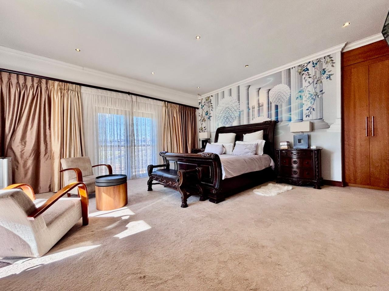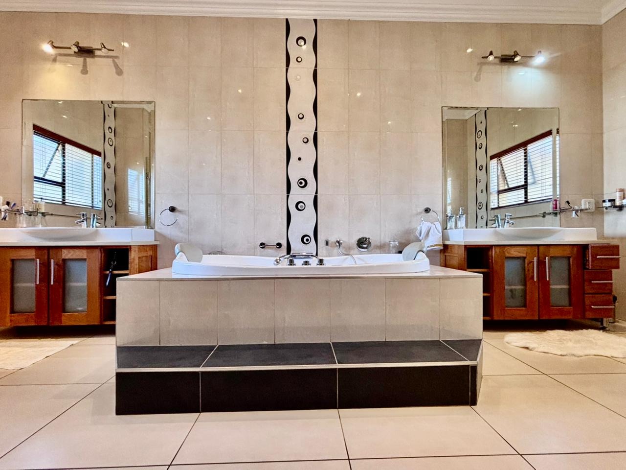 Nestled within the prestigious Mooikloof Glen security estate in Pretoria, South Africa, this magnificent residence epitomises opulent living on an expansive 8785 sqm erf. From the moment of arrival, the property's commanding kerb appeal is undeniable, featuring a grand Mediterranean-inspired architectural style with a classic terracotta roof and a light-coloured facade. An extensive paved circular driveway, adorned with mature palm trees and a decorative water feature, leads to a stately porte-cochère entrance, offering both convenience and an impressive welcome. The elevated position affords distant scenic views, enhancing the sense of exclusivity and tranquility. Step inside to discover an interior designed for grandeur and sophisticated comfort. The double-volume entrance hall is a breathtaking spectacle, boasting high ceilings, polished tile flooring with an elegant medallion, and a dramatic double curved staircase with modern railings, bathed in natural light from soaring windows. This central architectural marvel sets the tone for the home's luxurious flow. The residence offers an abundance of living spaces, including three distinct lounges and a formal dining room, providing versatile settings for both intimate gatherings and lavish entertaining. The presence of two fully equipped kitchens ensures culinary excellence and convenience, while a dedicated study offers a private sanctuary for work or contemplation. The open-plan design seamlessly connects these magnificent spaces, fostering an atmosphere of effortless elegance. Accommodation is nothing short of exceptional, with five generously proportioned bedrooms, each a private retreat. Five of these bedrooms boast luxurious en-suite bathrooms, complemented by an additional guest toilet, ensuring ultimate comfort and privacy for residents and guests alike. The bedrooms are appointed with extensive built-in wooden wardrobes, offering ample storage, and are illuminated by large windows and modern recessed lighting. The bathrooms are spacious and light-filled, featuring separate glass-enclosed showers, built-in tiled bathtubs, and contemporary vanities, creating spa-like environments within the home. Beyond the interiors, the estate unfolds into a resort-like outdoor paradise. A captivating tiered swimming pool complex invites relaxation and recreation, surrounded by multiple balconies and a spacious patio perfect for al fresco dining and entertaining, complete with a built-in braai. The meticulously manicured garden, sustained by an irrigation system and water tanks, provides a lush backdrop to this outdoor haven. Practical amenities include six garages and ten additional parking spaces, ensuring ample accommodation for vehicles. The property further benefits from staff quarters, domestic rooms, and a second house, presenting exceptional potential for dual living or accommodating a large retinue. Residents also enjoy access to a club house within the estate. Security is paramount within this esteemed security estate, featuring 24-hour security, an access gate, intercom system, and security gates, providing peace of mind. The property is equipped with a sprinkler system, ensuring the pristine condition of the grounds. This is more than a home; it is a lifestyle statement, offering unparalleled luxury and comfort in a secure and prestigious setting. Key Features: * 5 Bedrooms, 6.5 Bathrooms (5 En-suite) * 3 Lounges, 1 Dining Room, 2 Kitchens * Grand Double Curved Staircase Entrance Hall * Tiered Swimming Pool & Patio with Built-in Braai * 6 Garages & 10 Parking Spaces * Staff Quarters, Domestic Rooms & Second House * Study, Balcony, Pantry, Guest Toilet * Security Estate with 24-Hour Security & Access Gate * Erf Size: 8785 sqm, Floor Size: 1182 sqm