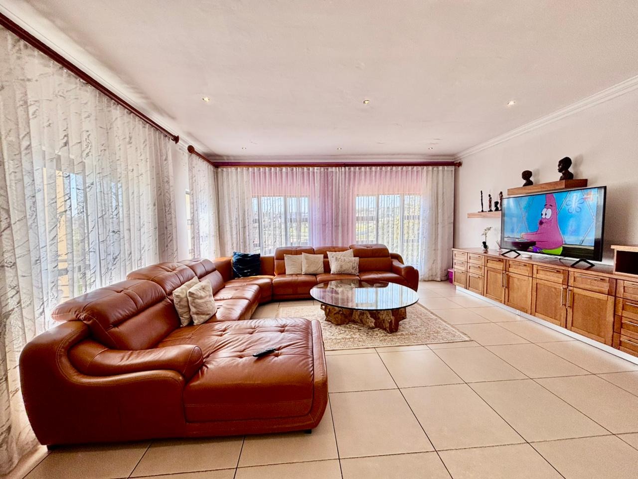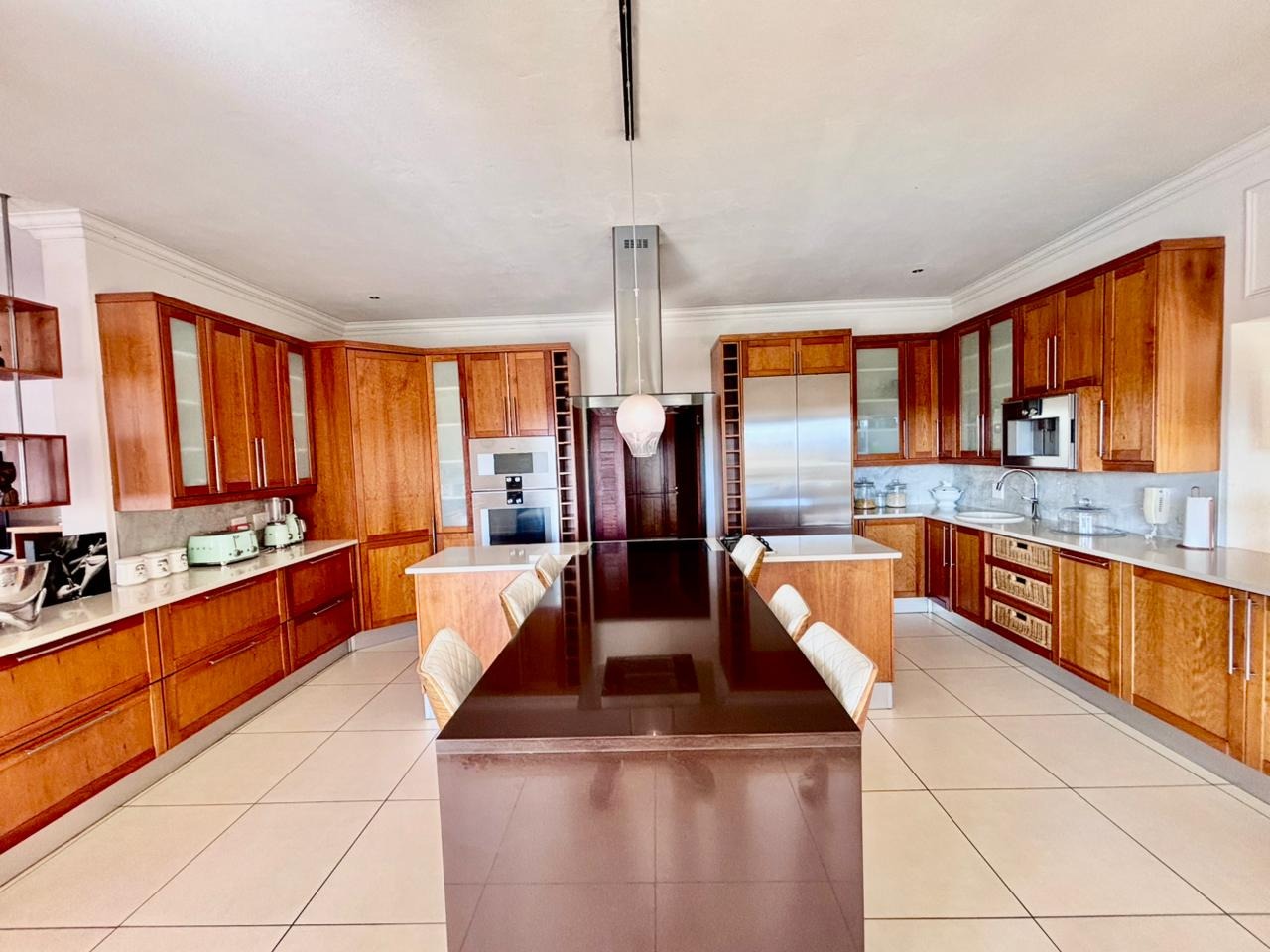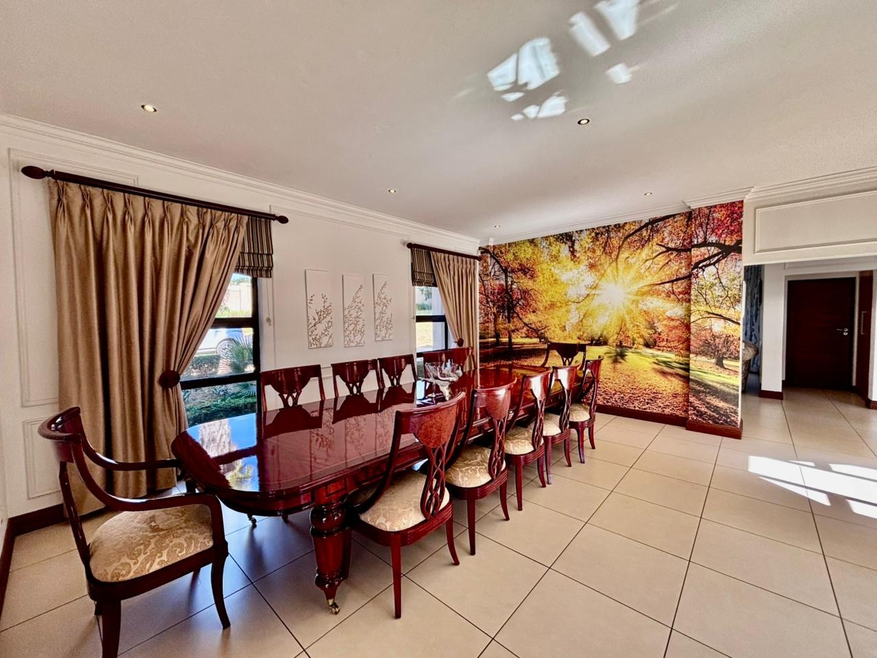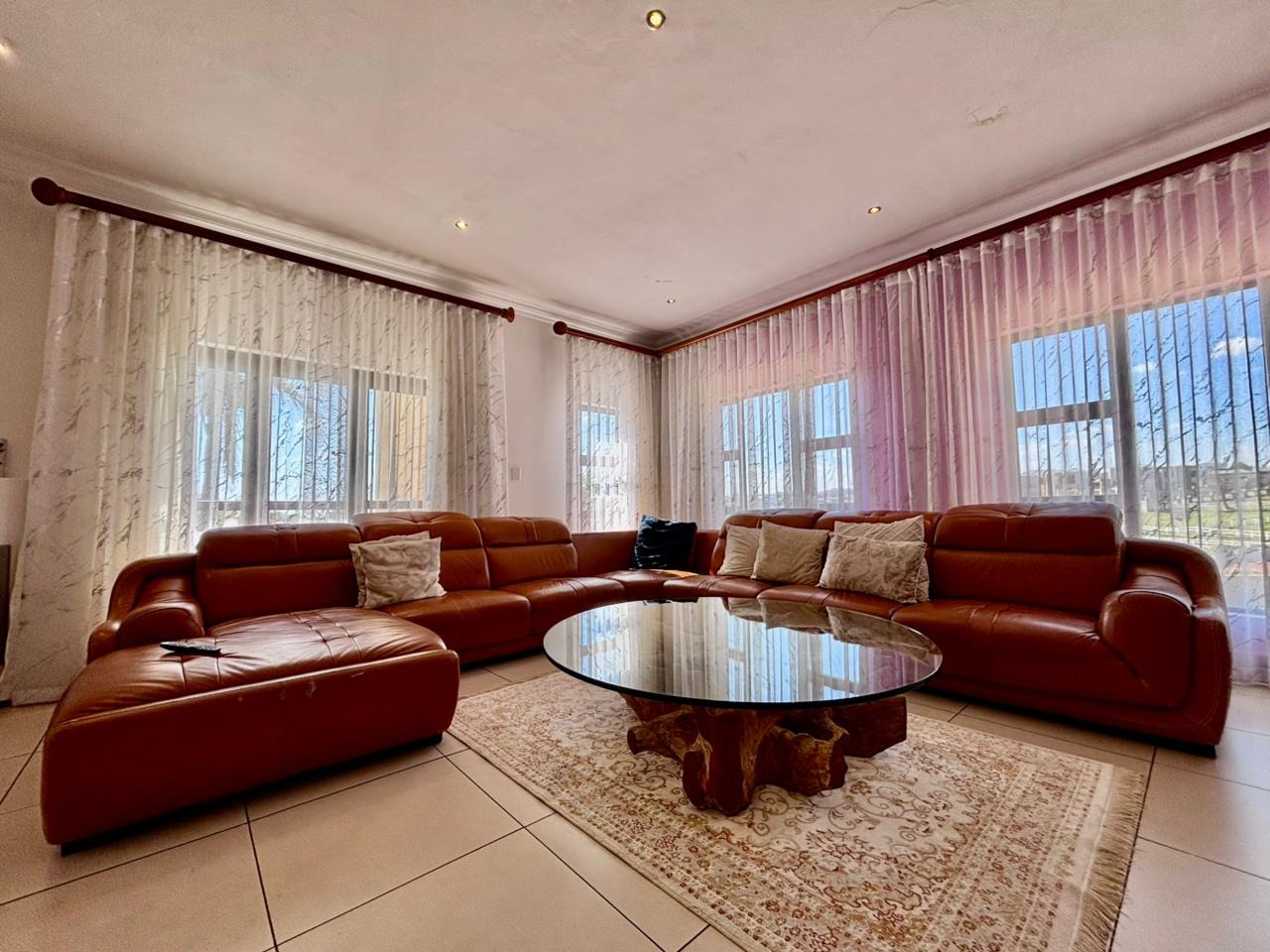 Nestled within the prestigious Mooikloof Glen security estate in Pretoria, South Africa, this magnificent residence epitomises opulent living on an expansive 8785 sqm erf. From the moment of arrival, the property's commanding kerb appeal is undeniable, featuring a grand Mediterranean-inspired architectural style with a classic terracotta roof and a light-coloured facade. An extensive paved circular driveway, adorned with mature palm trees and a decorative water feature, leads to a stately porte-cochère entrance, offering both convenience and an impressive welcome. The elevated position affords distant scenic views, enhancing the sense of exclusivity and tranquility. Step inside to discover an interior designed for grandeur and sophisticated comfort. The double-volume entrance hall is a breathtaking spectacle, boasting high ceilings, polished tile flooring with an elegant medallion, and a dramatic double curved staircase with modern railings, bathed in natural light from soaring windows. This central architectural marvel sets the tone for the home's luxurious flow. The residence offers an abundance of living spaces, including three distinct lounges and a formal dining room, providing versatile settings for both intimate gatherings and lavish entertaining. The presence of two fully equipped kitchens ensures culinary excellence and convenience, while a dedicated study offers a private sanctuary for work or contemplation. The open-plan design seamlessly connects these magnificent spaces, fostering an atmosphere of effortless elegance. Accommodation is nothing short of exceptional, with five generously proportioned bedrooms, each a private retreat. Five of these bedrooms boast luxurious en-suite bathrooms, complemented by an additional guest toilet, ensuring ultimate comfort and privacy for residents and guests alike. The bedrooms are appointed with extensive built-in wooden wardrobes, offering ample storage, and are illuminated by large windows and modern recessed lighting. The bathrooms are spacious and light-filled, featuring separate glass-enclosed showers, built-in tiled bathtubs, and contemporary vanities, creating spa-like environments within the home. Beyond the interiors, the estate unfolds into a resort-like outdoor paradise. A captivating tiered swimming pool complex invites relaxation and recreation, surrounded by multiple balconies and a spacious patio perfect for al fresco dining and entertaining, complete with a built-in braai. The meticulously manicured garden, sustained by an irrigation system and water tanks, provides a lush backdrop to this outdoor haven. Practical amenities include six garages and ten additional parking spaces, ensuring ample accommodation for vehicles. The property further benefits from staff quarters, domestic rooms, and a second house, presenting exceptional potential for dual living or accommodating a large retinue. Residents also enjoy access to a club house within the estate. Security is paramount within this esteemed security estate, featuring 24-hour security, an access gate, intercom system, and security gates, providing peace of mind. The property is equipped with a sprinkler system, ensuring the pristine condition of the grounds. This is more than a home; it is a lifestyle statement, offering unparalleled luxury and comfort in a secure and prestigious setting. Key Features: * 5 Bedrooms, 6.5 Bathrooms (5 En-suite) * 3 Lounges, 1 Dining Room, 2 Kitchens * Grand Double Curved Staircase Entrance Hall * Tiered Swimming Pool & Patio with Built-in Braai * 6 Garages & 10 Parking Spaces * Staff Quarters, Domestic Rooms & Second House * Study, Balcony, Pantry, Guest Toilet * Security Estate with 24-Hour Security & Access Gate * Erf Size: 8785 sqm, Floor Size: 1182 sqm