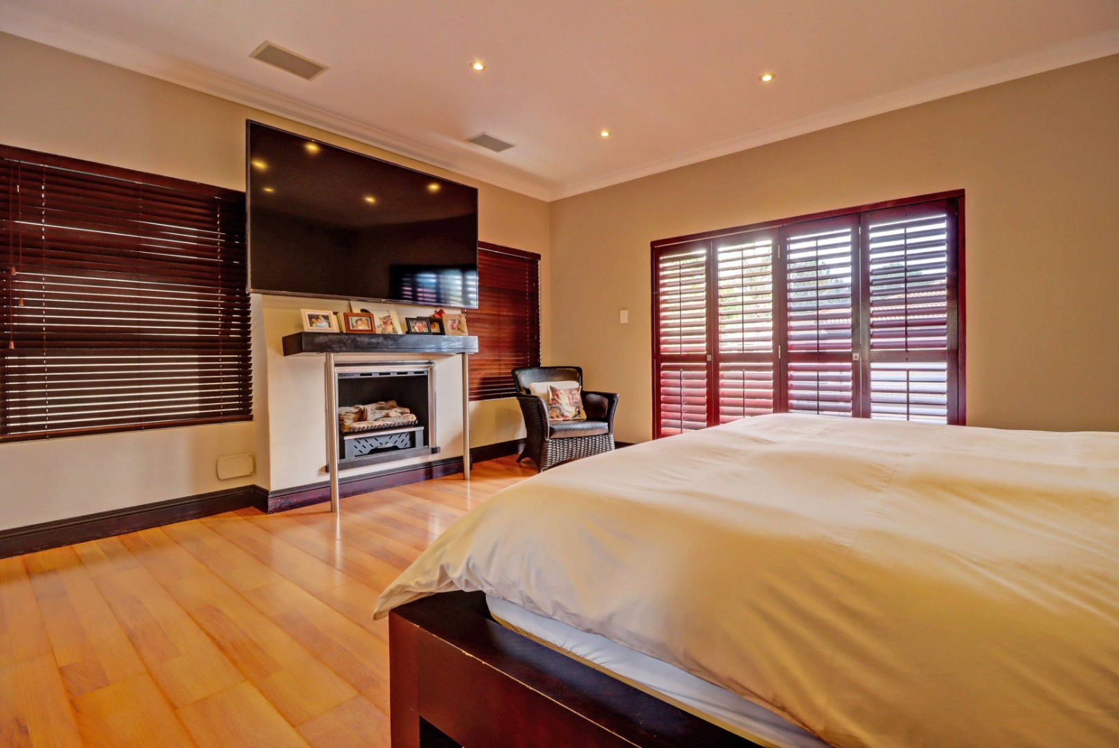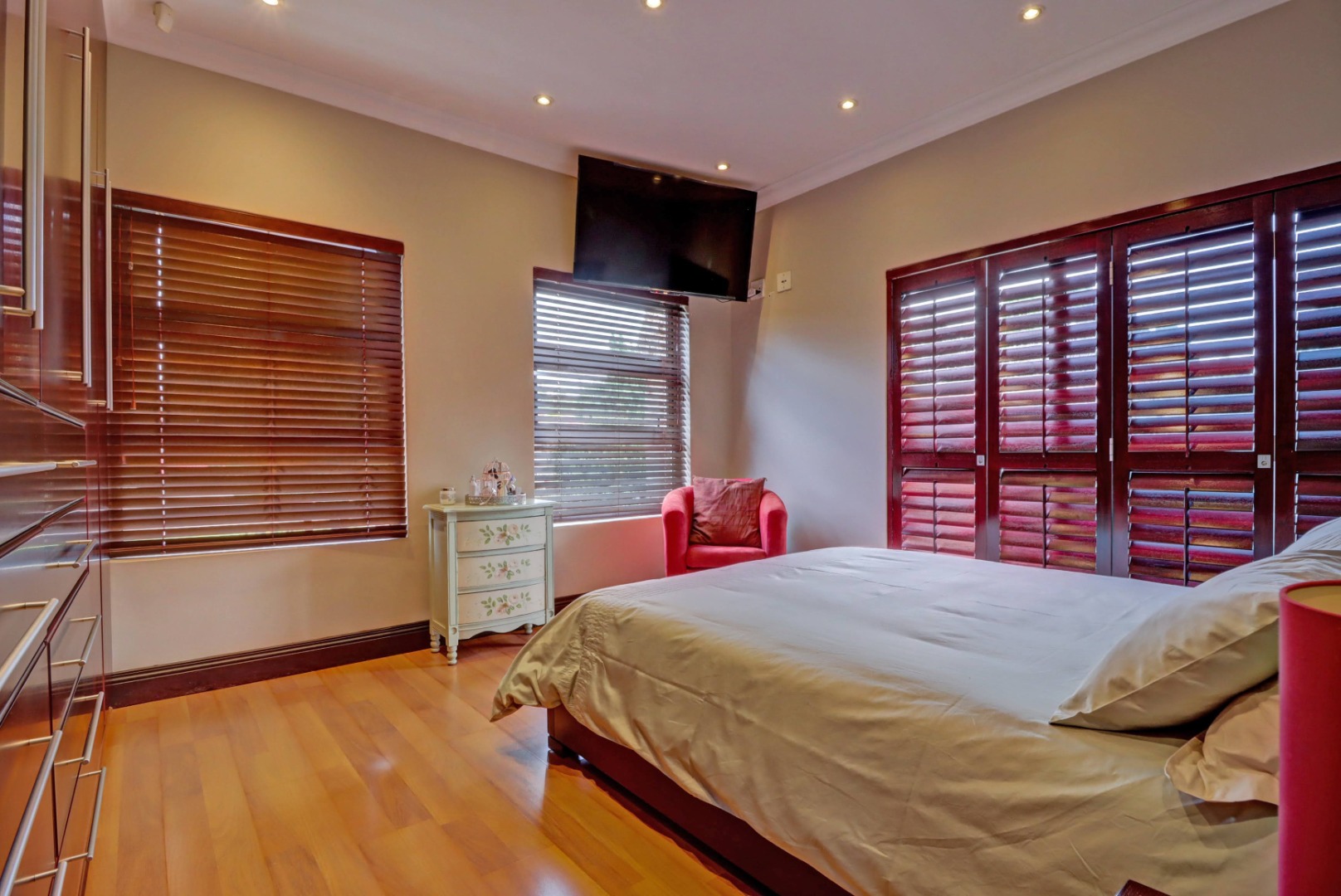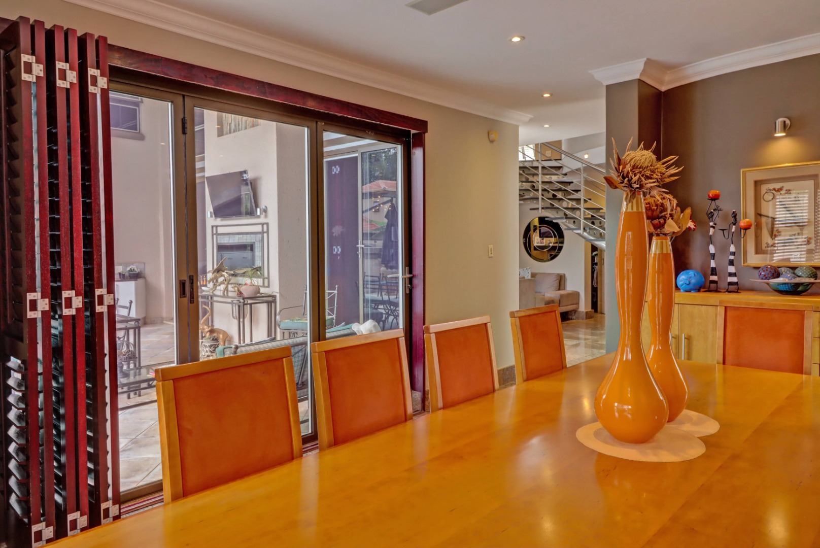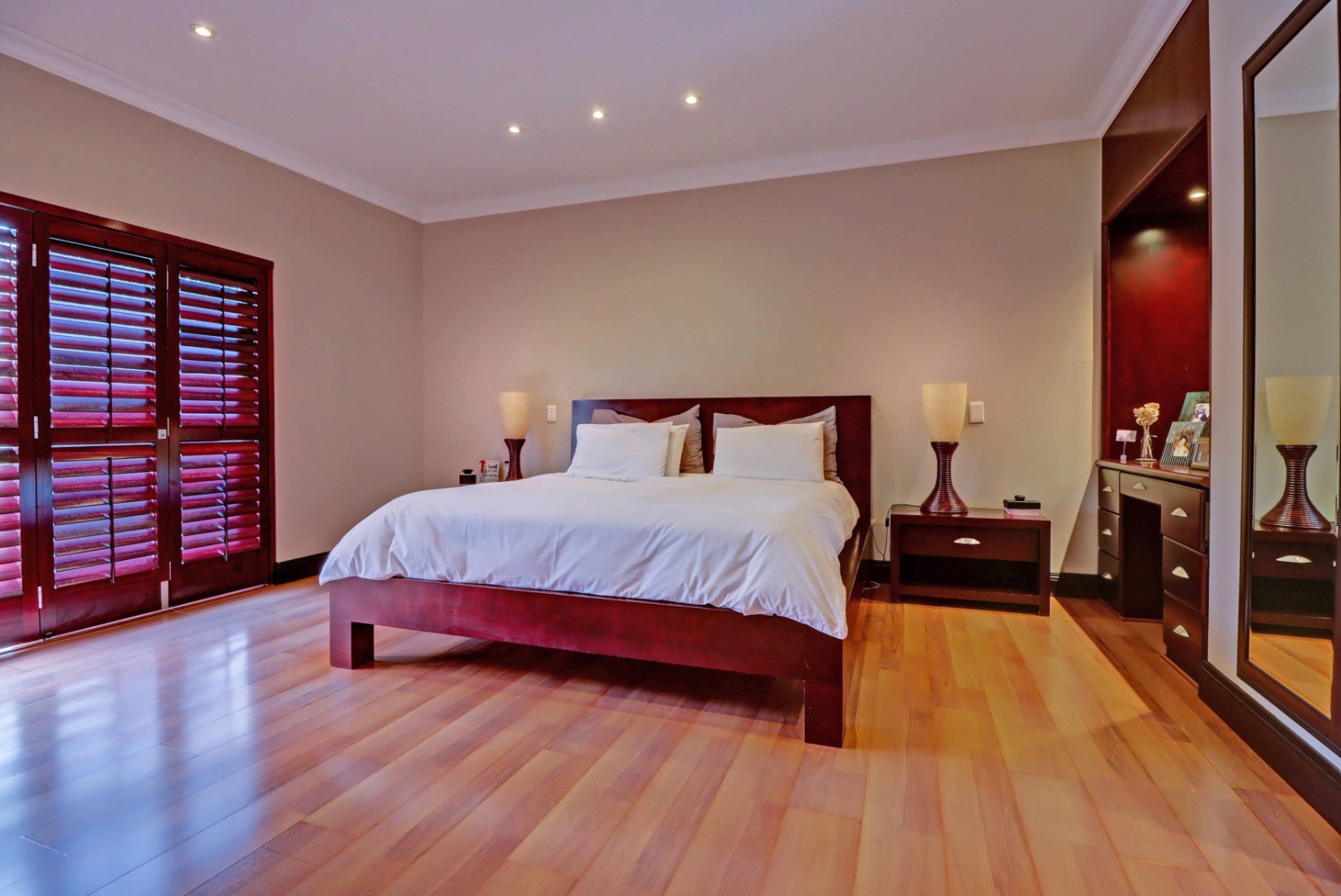 Spanning a generous 560 sqm under roof on a 760 sqm erf, the interior boasts rich hardwood floors and modern recessed lighting throughout, creating an elegant and inviting ambiance. The thoughtfully designed layout includes a well-appointed kitchen with a scullery, a dedicated dining room, a comfortable lounge, and an additional family TV room, ensuring ample space for both relaxation and entertaining. An inviting entrance hall welcomes residents and guests into this expansive home.