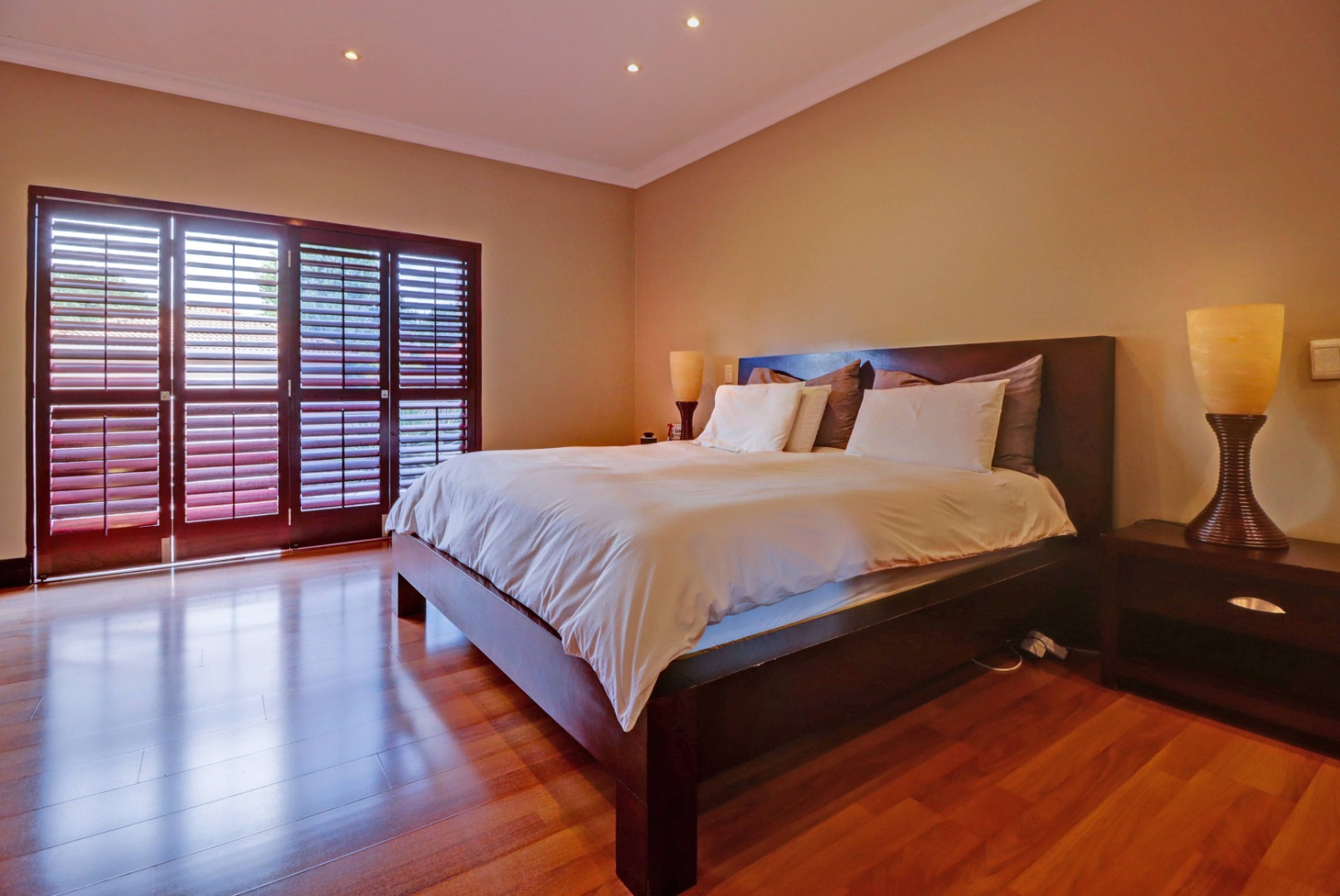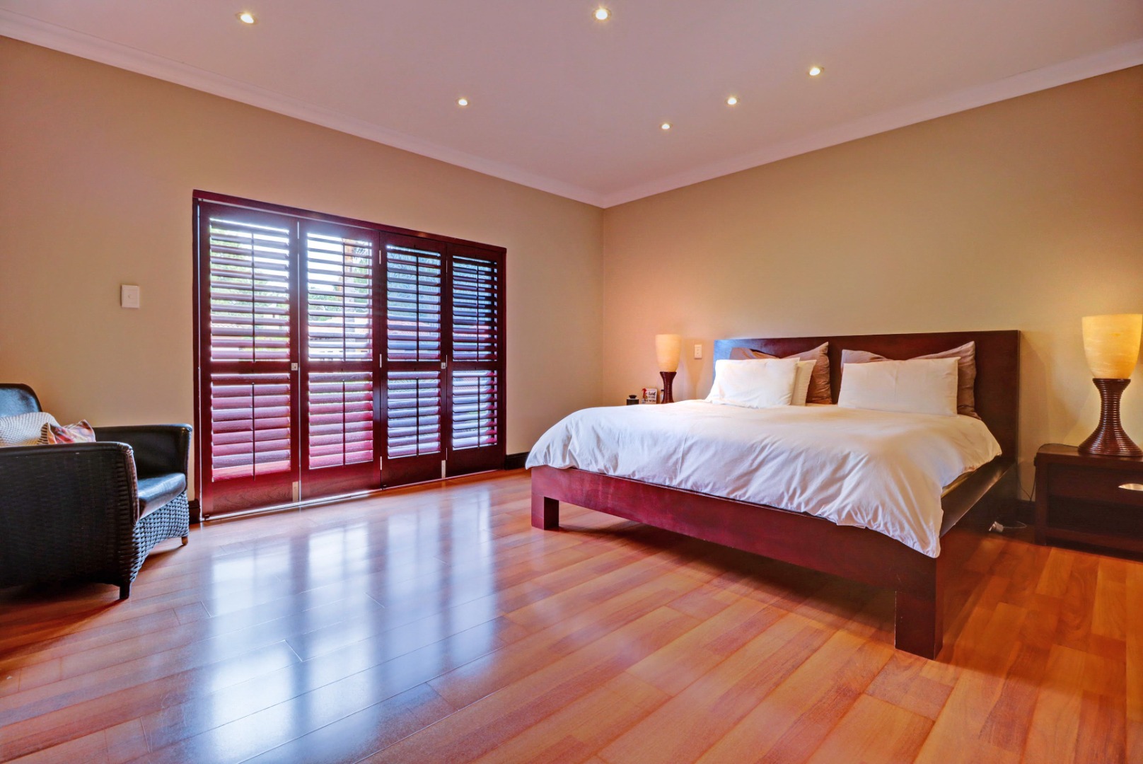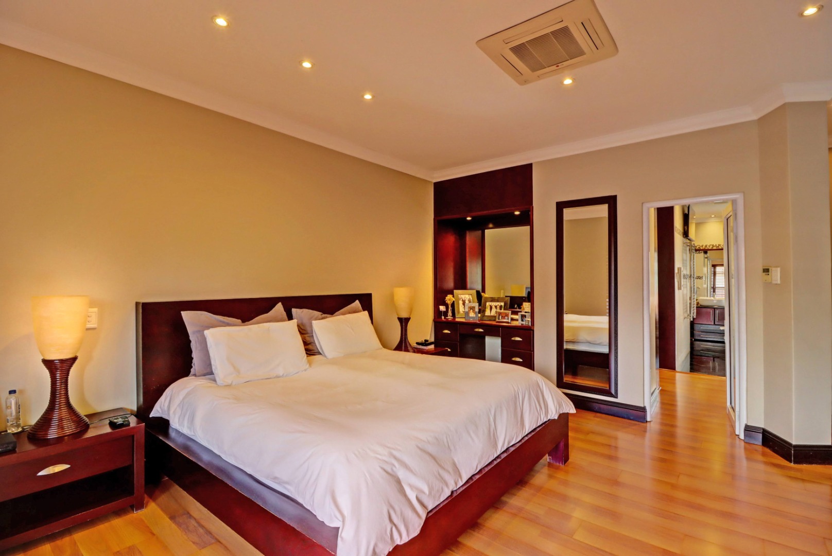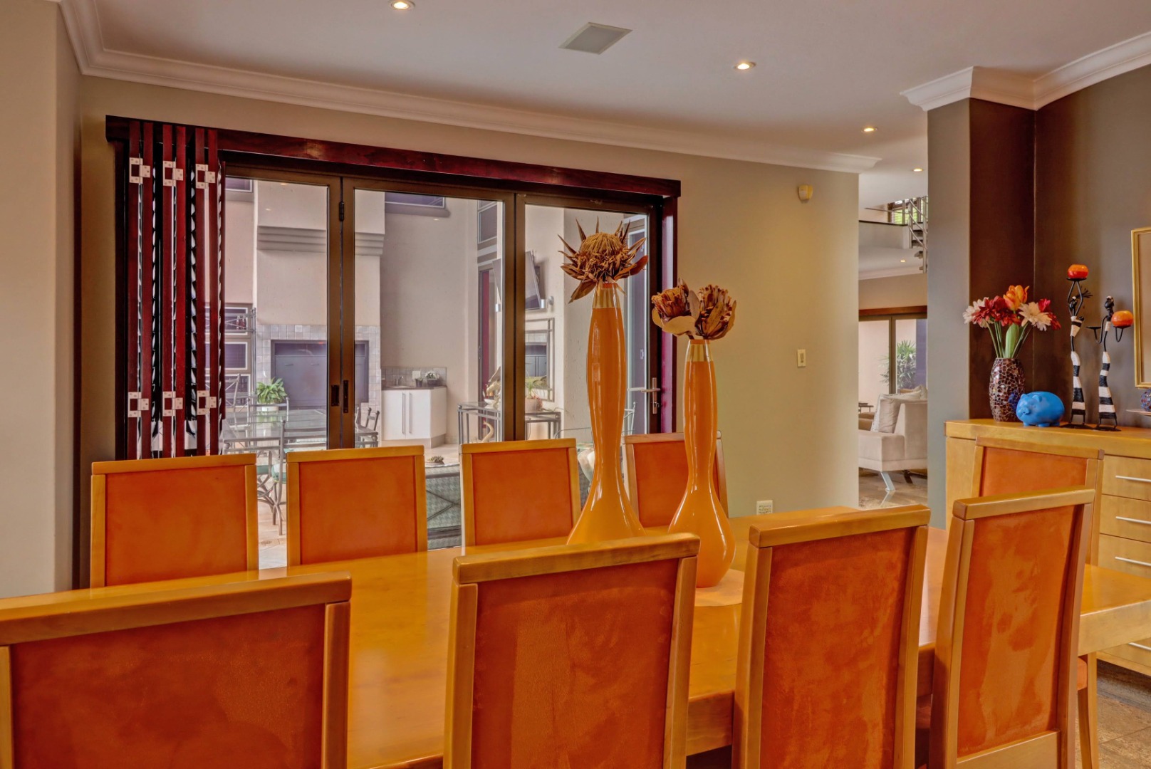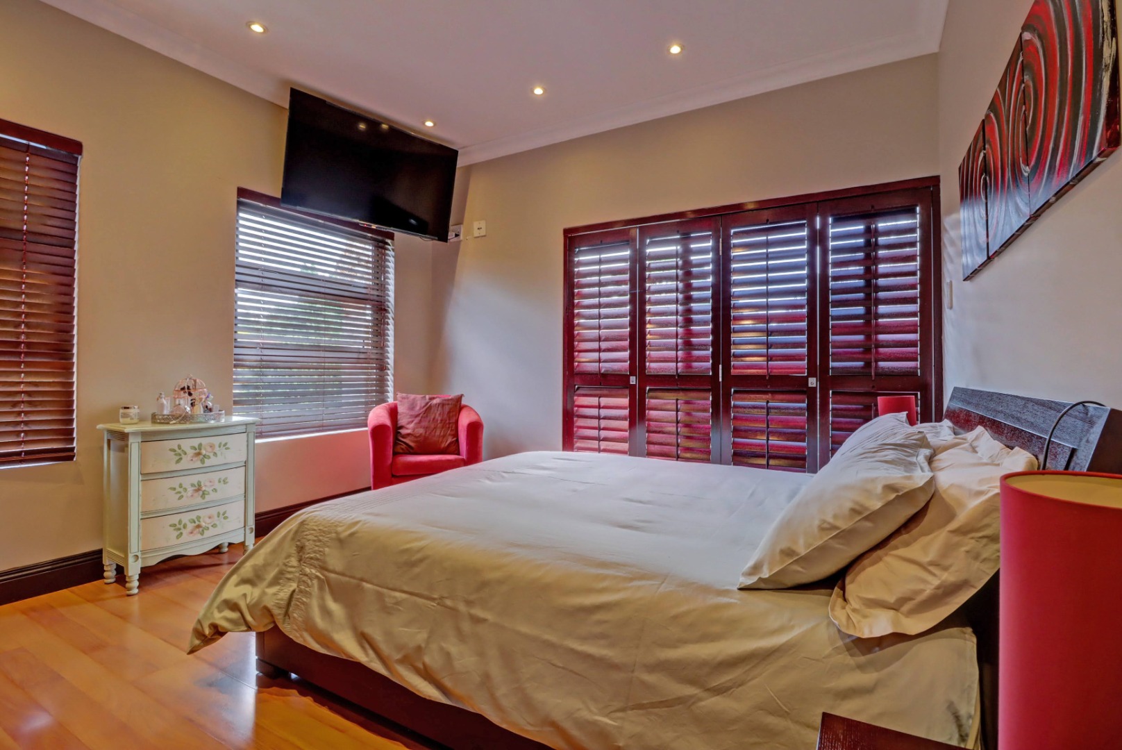 Spanning a generous 560 sqm under roof on a 760 sqm erf, the interior boasts rich hardwood floors and modern recessed lighting throughout, creating an elegant and inviting ambiance. The thoughtfully designed layout includes a well-appointed kitchen with a scullery, a dedicated dining room, a comfortable lounge, and an additional family TV room, ensuring ample space for both relaxation and entertaining. An inviting entrance hall welcomes residents and guests into this expansive home.