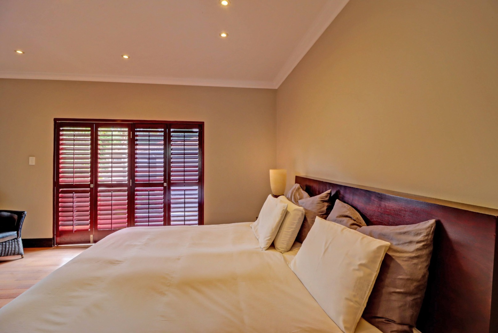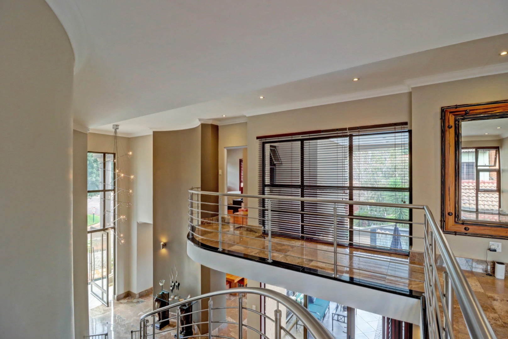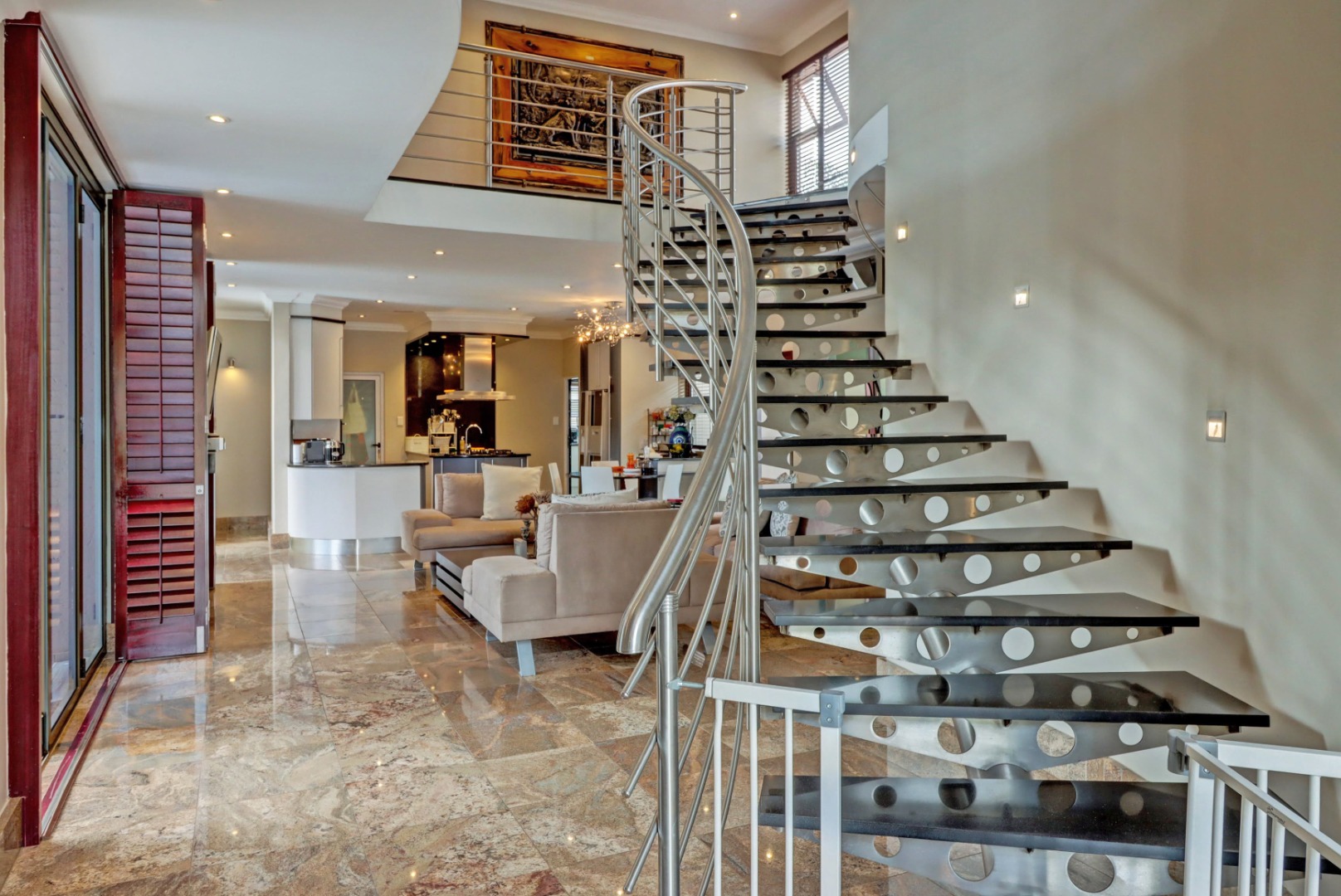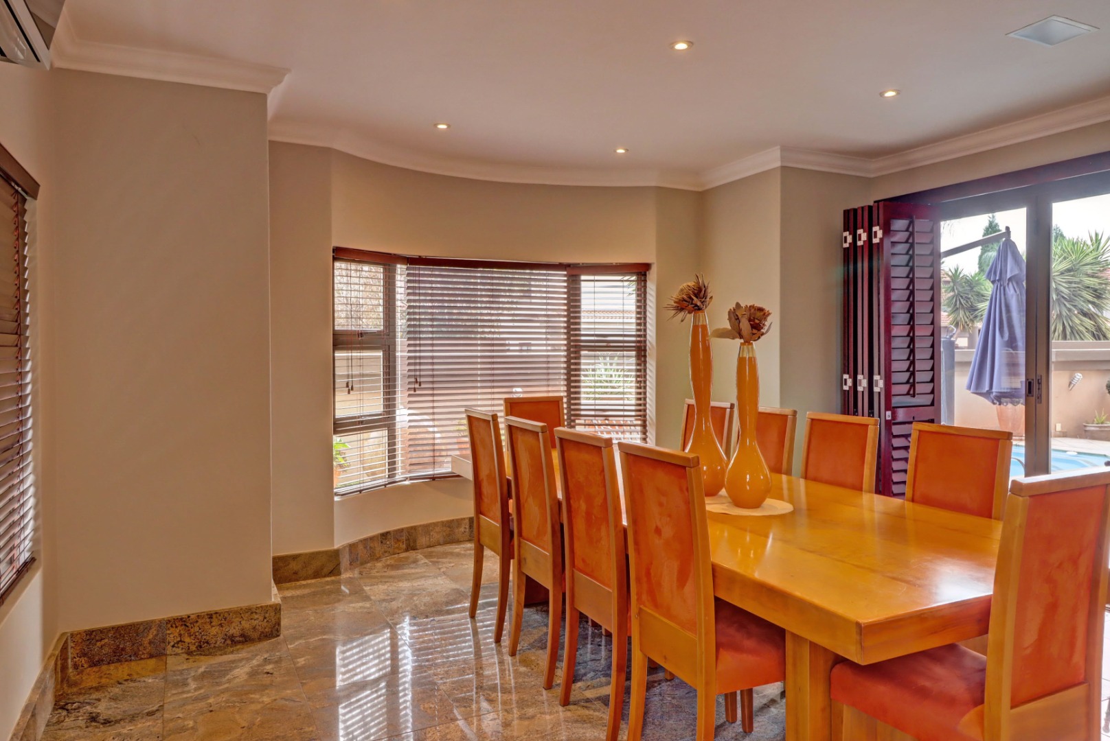 Spanning a generous 560 sqm under roof on a 760 sqm erf, the interior boasts rich hardwood floors and modern recessed lighting throughout, creating an elegant and inviting ambiance. The thoughtfully designed layout includes a well-appointed kitchen with a scullery, a dedicated dining room, a comfortable lounge, and an additional family TV room, ensuring ample space for both relaxation and entertaining. An inviting entrance hall welcomes residents and guests into this expansive home.
