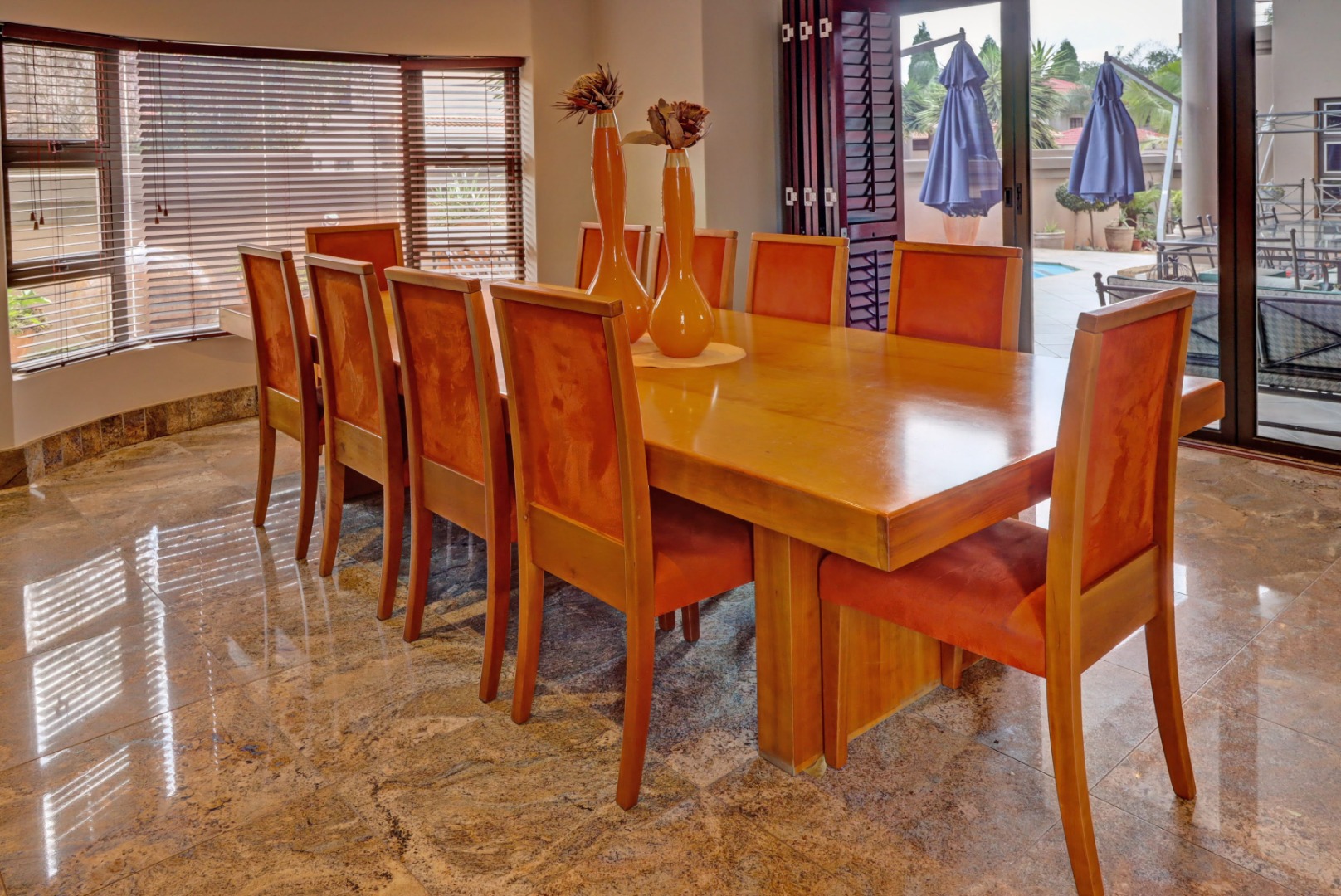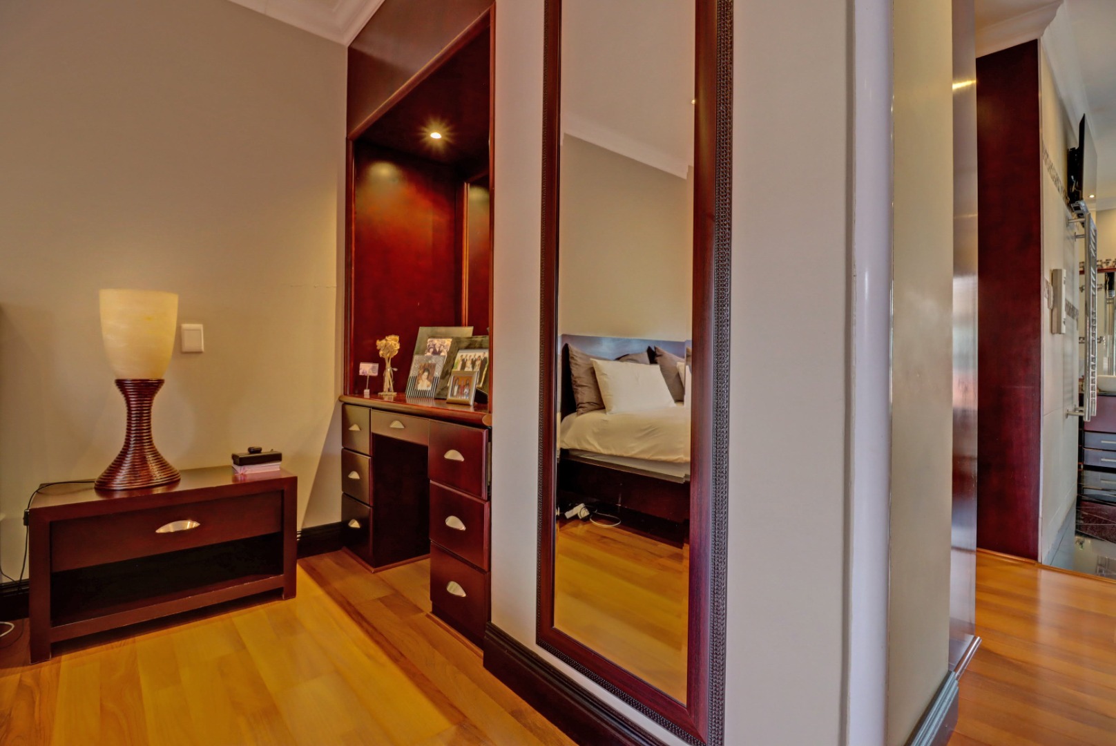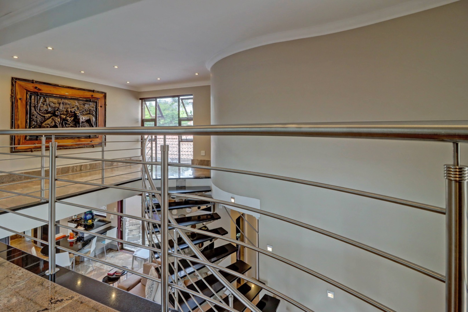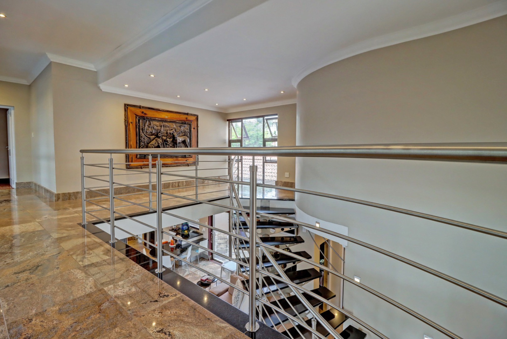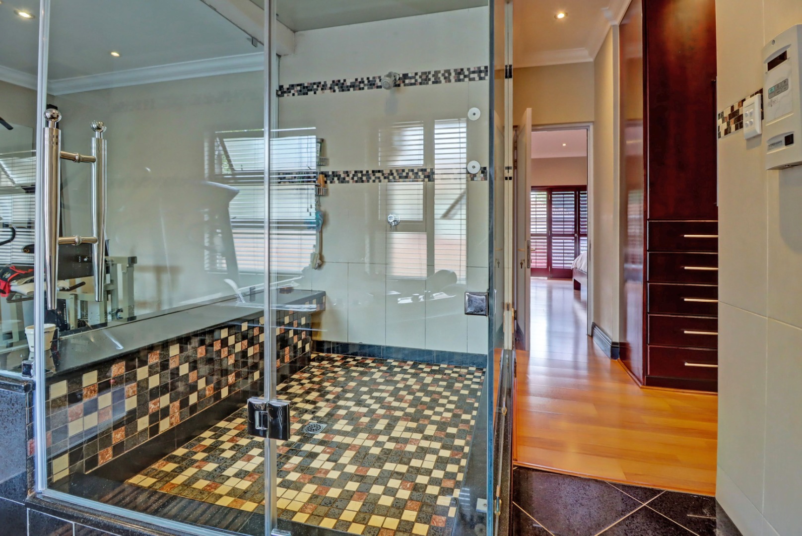 Spanning a generous 560 sqm under roof on a 760 sqm erf, the interior boasts rich hardwood floors and modern recessed lighting throughout, creating an elegant and inviting ambiance. The thoughtfully designed layout includes a well-appointed kitchen with a scullery, a dedicated dining room, a comfortable lounge, and an additional family TV room, ensuring ample space for both relaxation and entertaining. An inviting entrance hall welcomes residents and guests into this expansive home.