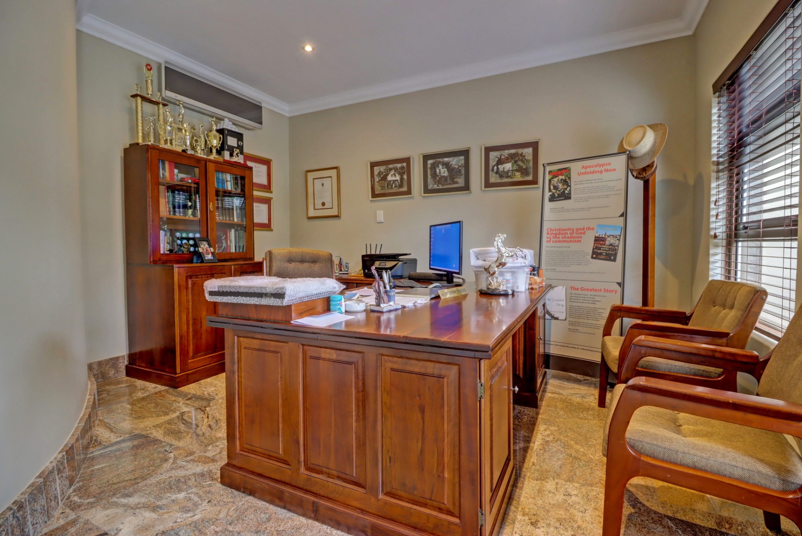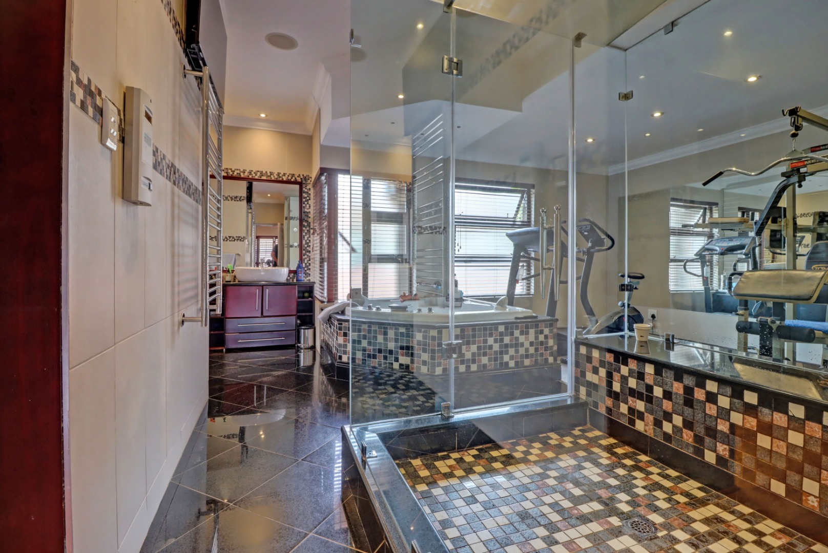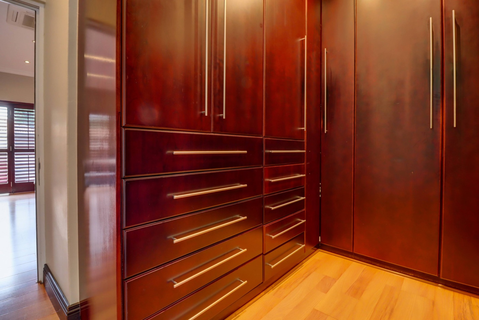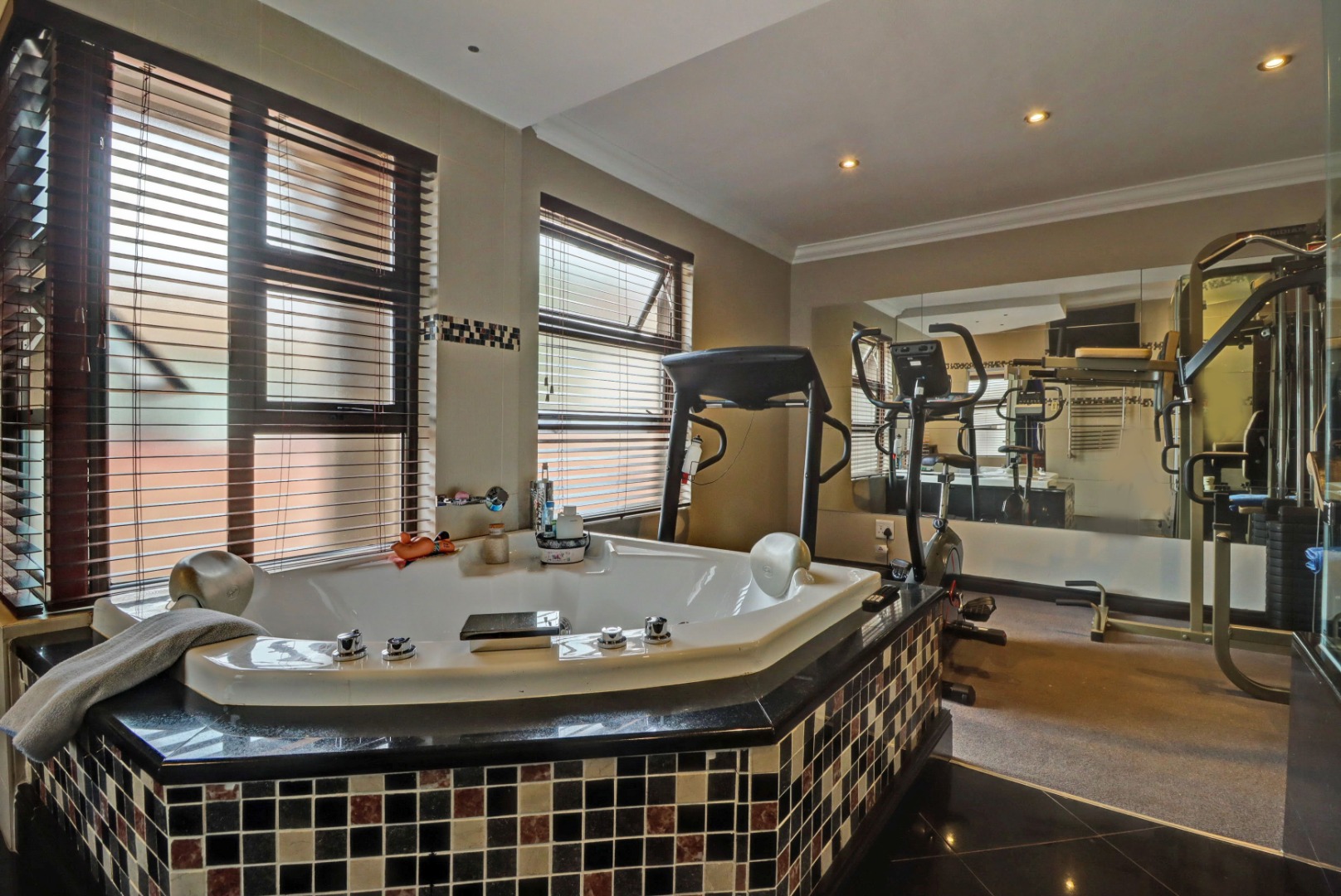 Spanning a generous 560 sqm under roof on a 760 sqm erf, the interior boasts rich hardwood floors and modern recessed lighting throughout, creating an elegant and inviting ambiance. The thoughtfully designed layout includes a well-appointed kitchen with a scullery, a dedicated dining room, a comfortable lounge, and an additional family TV room, ensuring ample space for both relaxation and entertaining. An inviting entrance hall welcomes residents and guests into this expansive home.