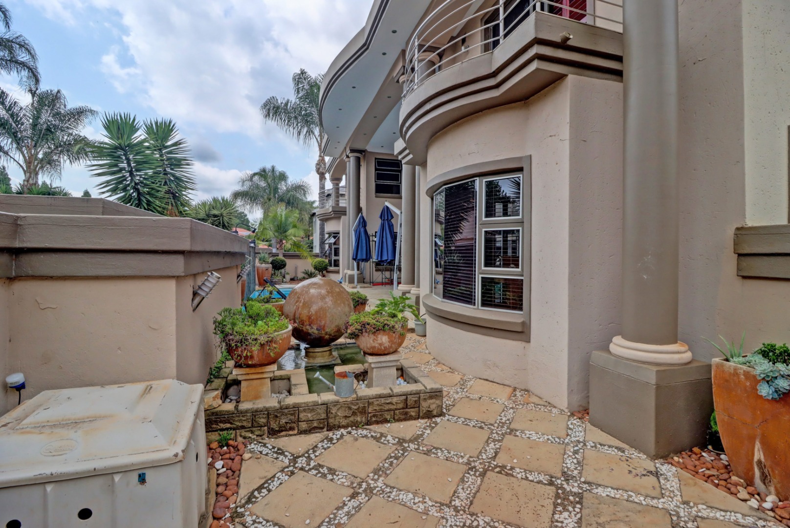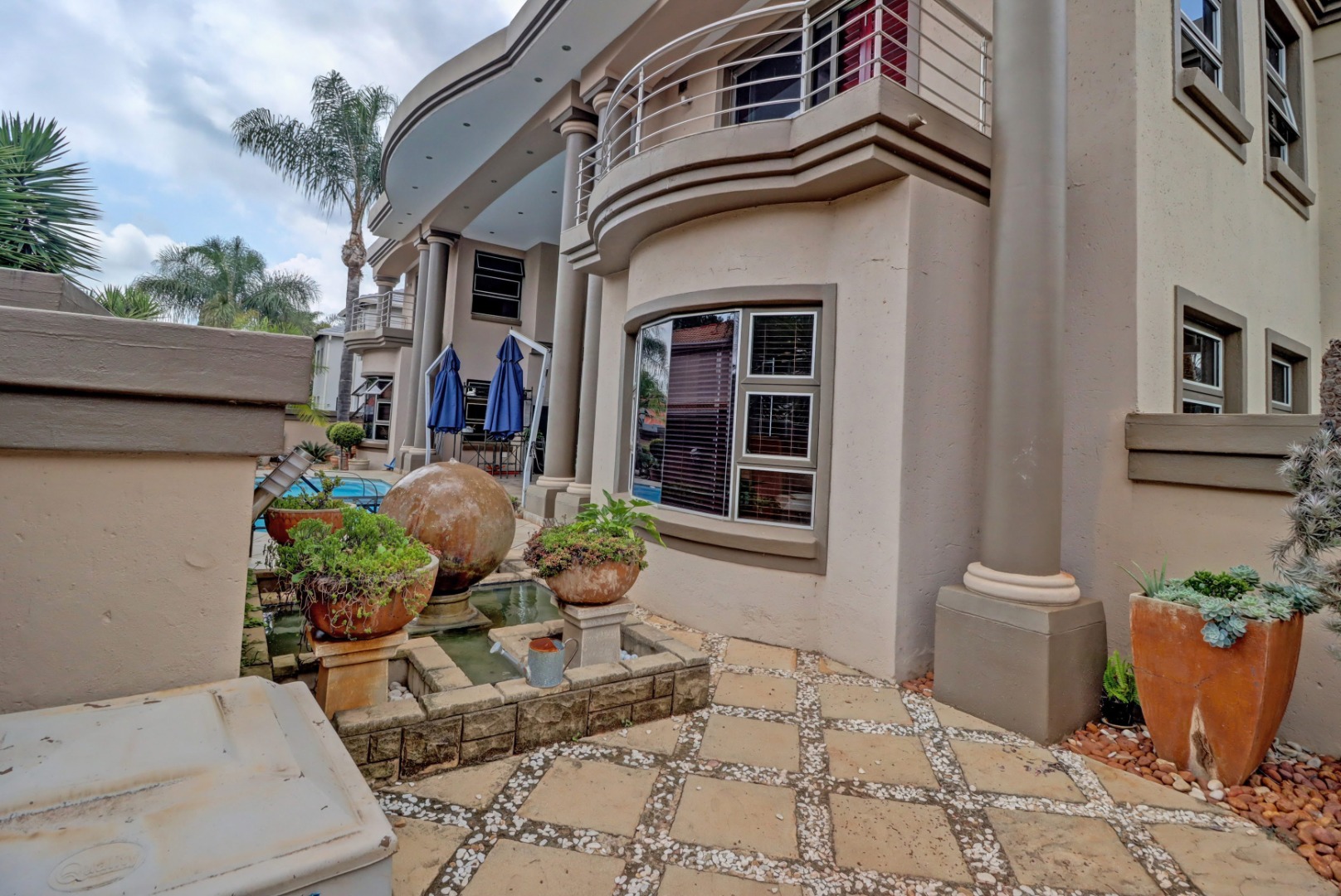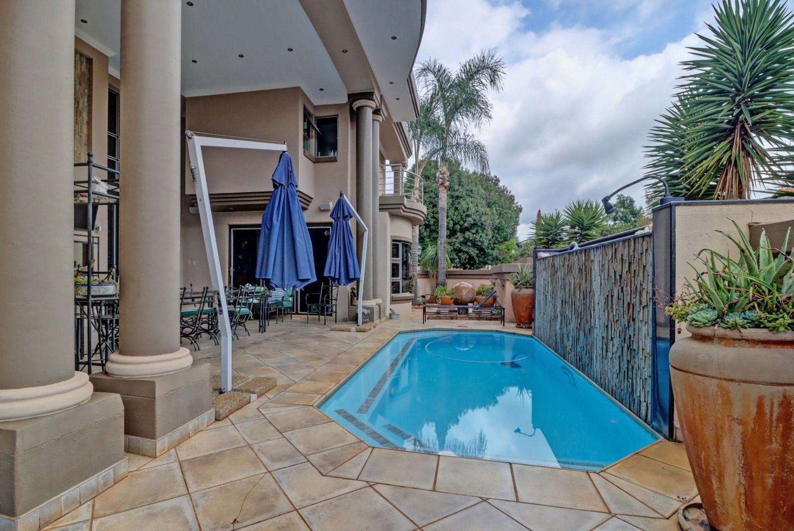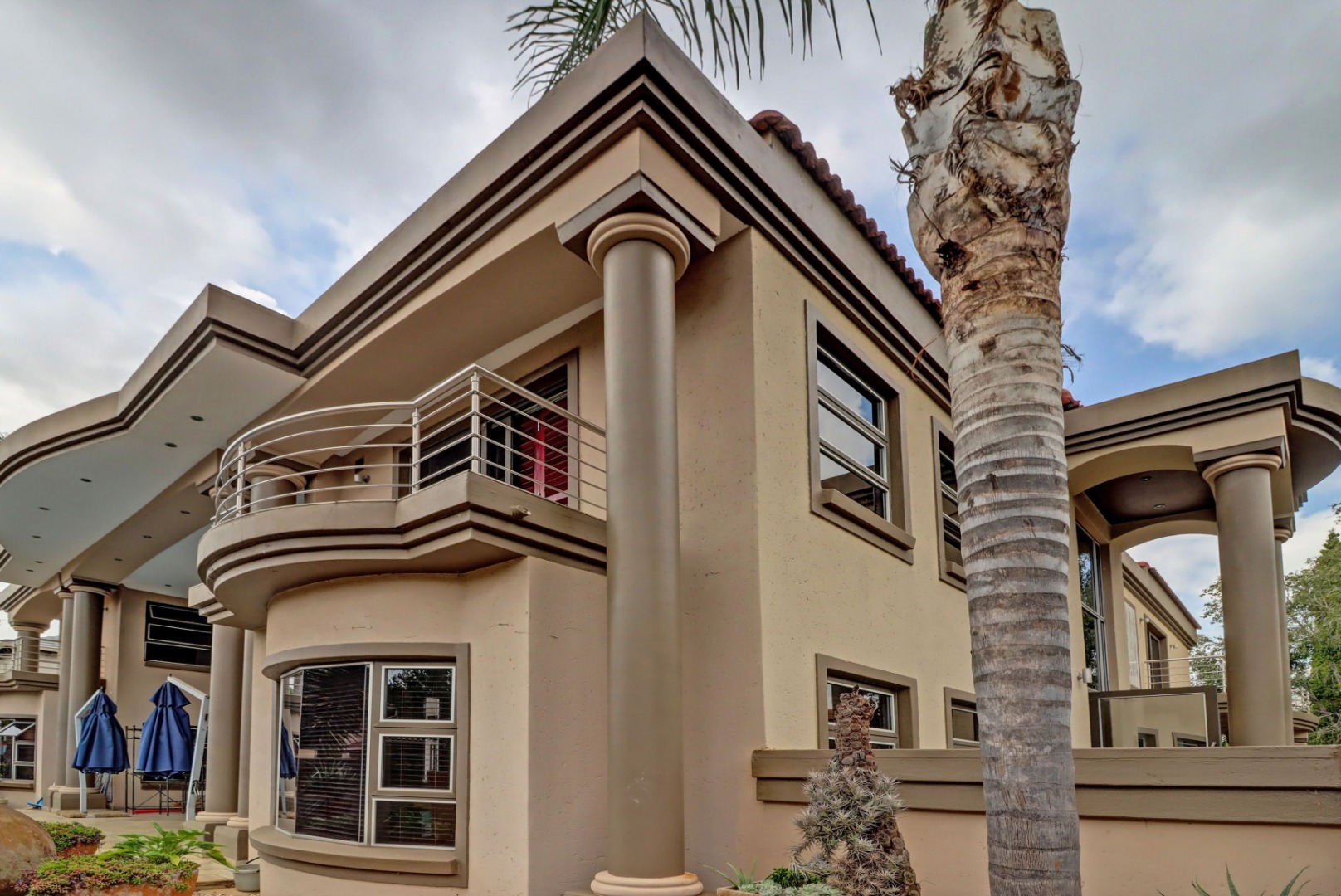 This magnificent residence in Moreleta Park, Pretoria, offers an exceptional blend of grand design and modern comfort, perfectly suited for discerning homeowners. The property immediately captivates with its striking facade, featuring prominent columns, a double-height glass entrance, and a contemporary glass-panel garage door. An extensive paved driveway and mature, decorative front landscaping enhance its impressive curb appeal, setting a sophisticated tone for this secure estate home.