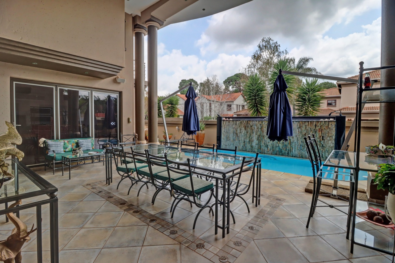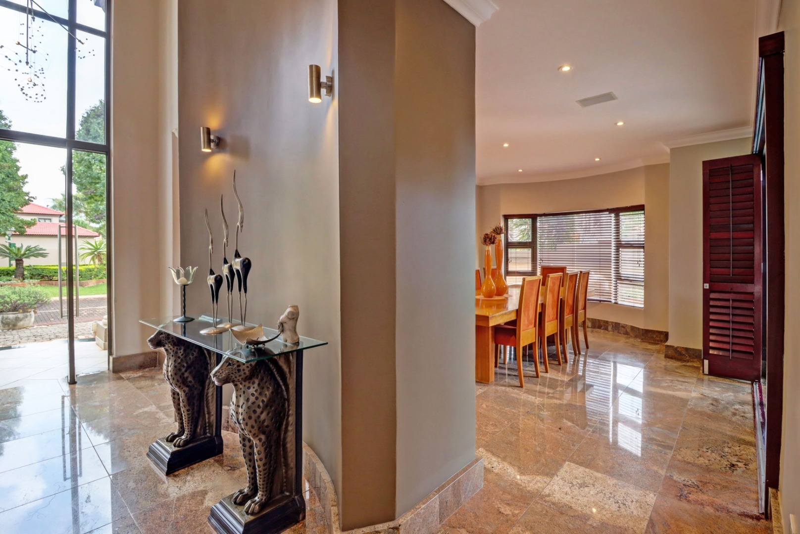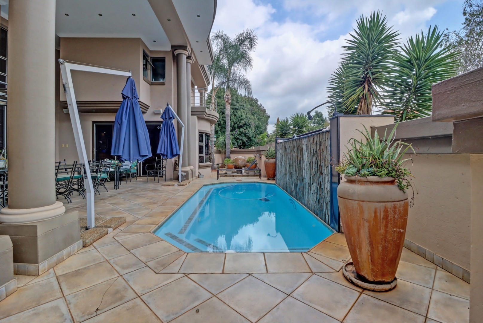 This magnificent residence in Moreleta Park, Pretoria, offers an exceptional blend of grand design and modern comfort, perfectly suited for discerning homeowners. The property immediately captivates with its striking facade, featuring prominent columns, a double-height glass entrance, and a contemporary glass-panel garage door. An extensive paved driveway and mature, decorative front landscaping enhance its impressive curb appeal, setting a sophisticated tone for this secure estate home.