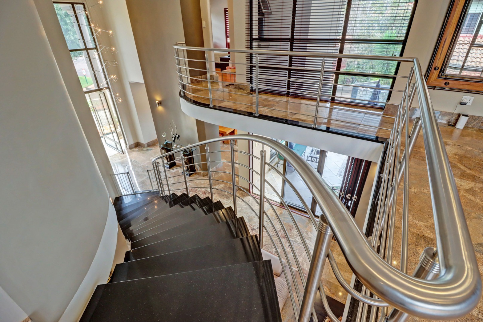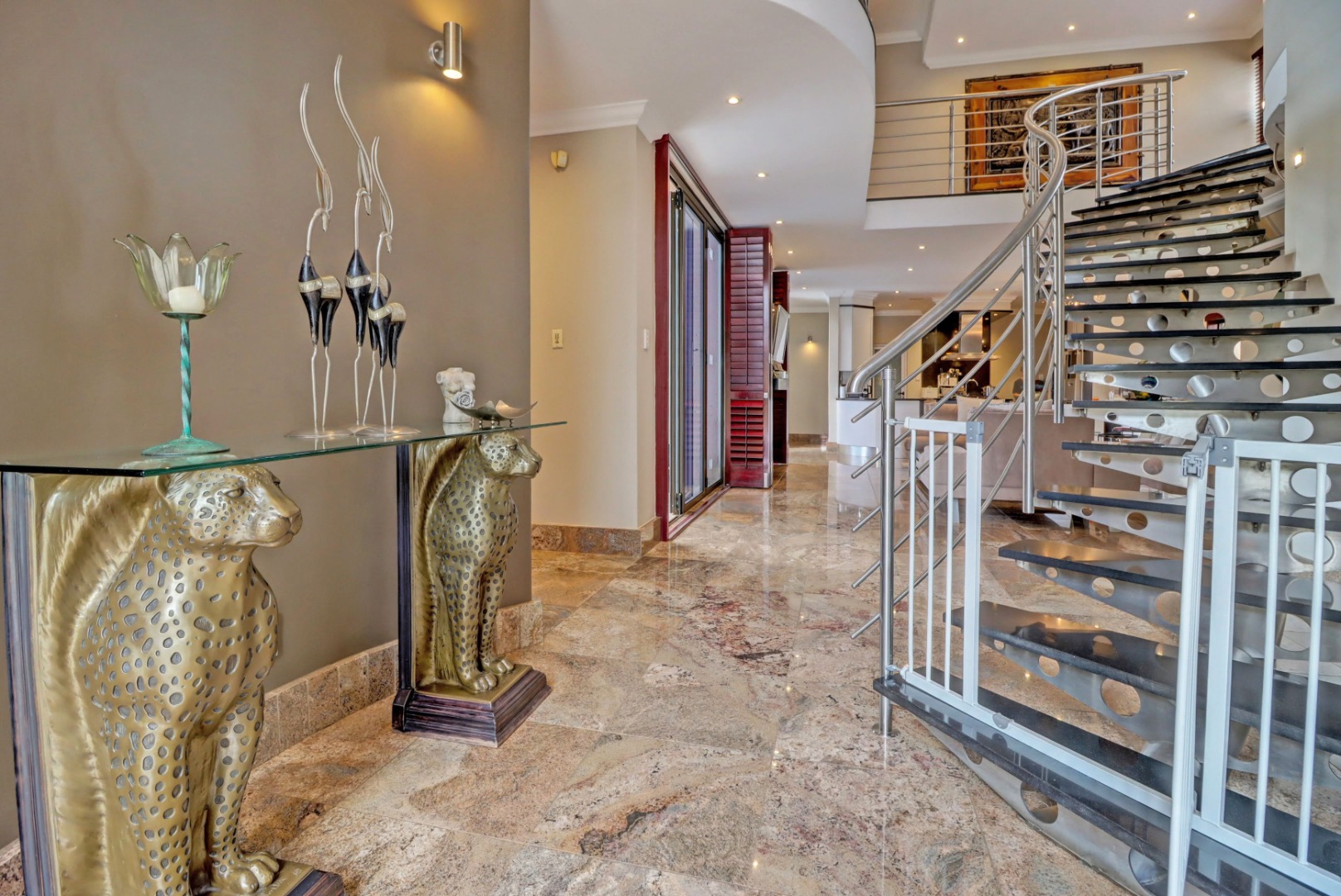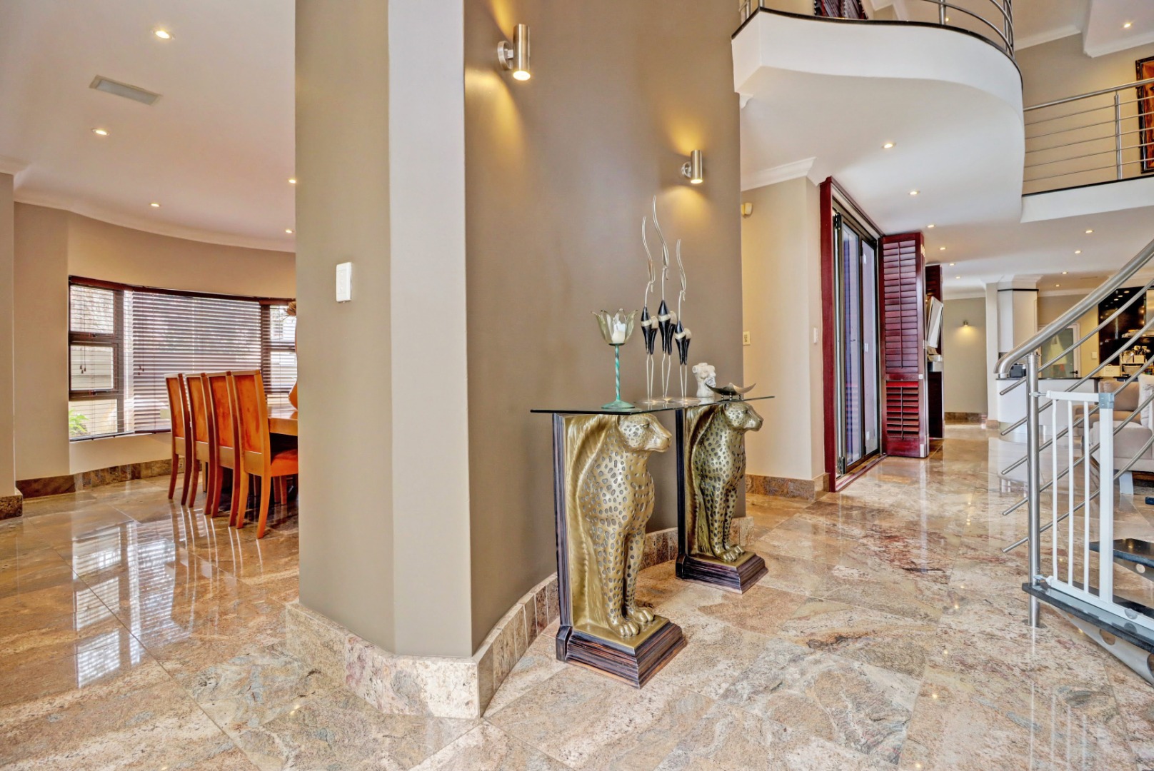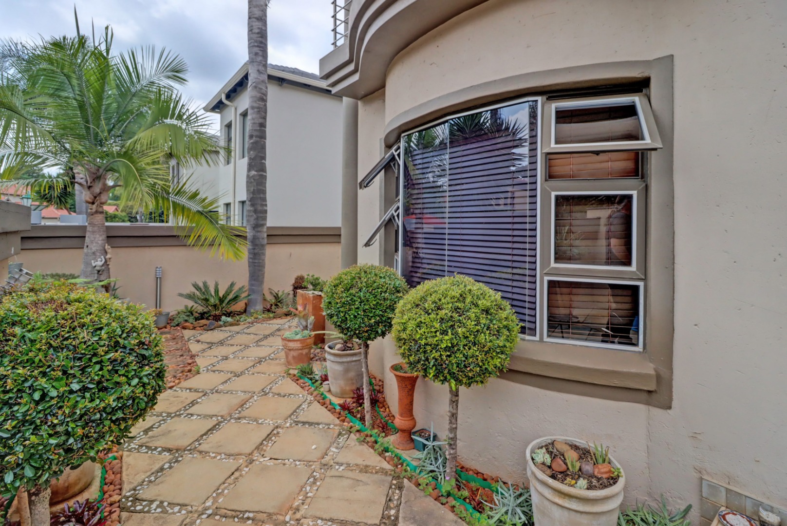 This magnificent residence in Moreleta Park, Pretoria, offers an exceptional blend of grand design and modern comfort, perfectly suited for discerning homeowners. The property immediately captivates with its striking facade, featuring prominent columns, a double-height glass entrance, and a contemporary glass-panel garage door. An extensive paved driveway and mature, decorative front landscaping enhance its impressive curb appeal, setting a sophisticated tone for this secure estate home.