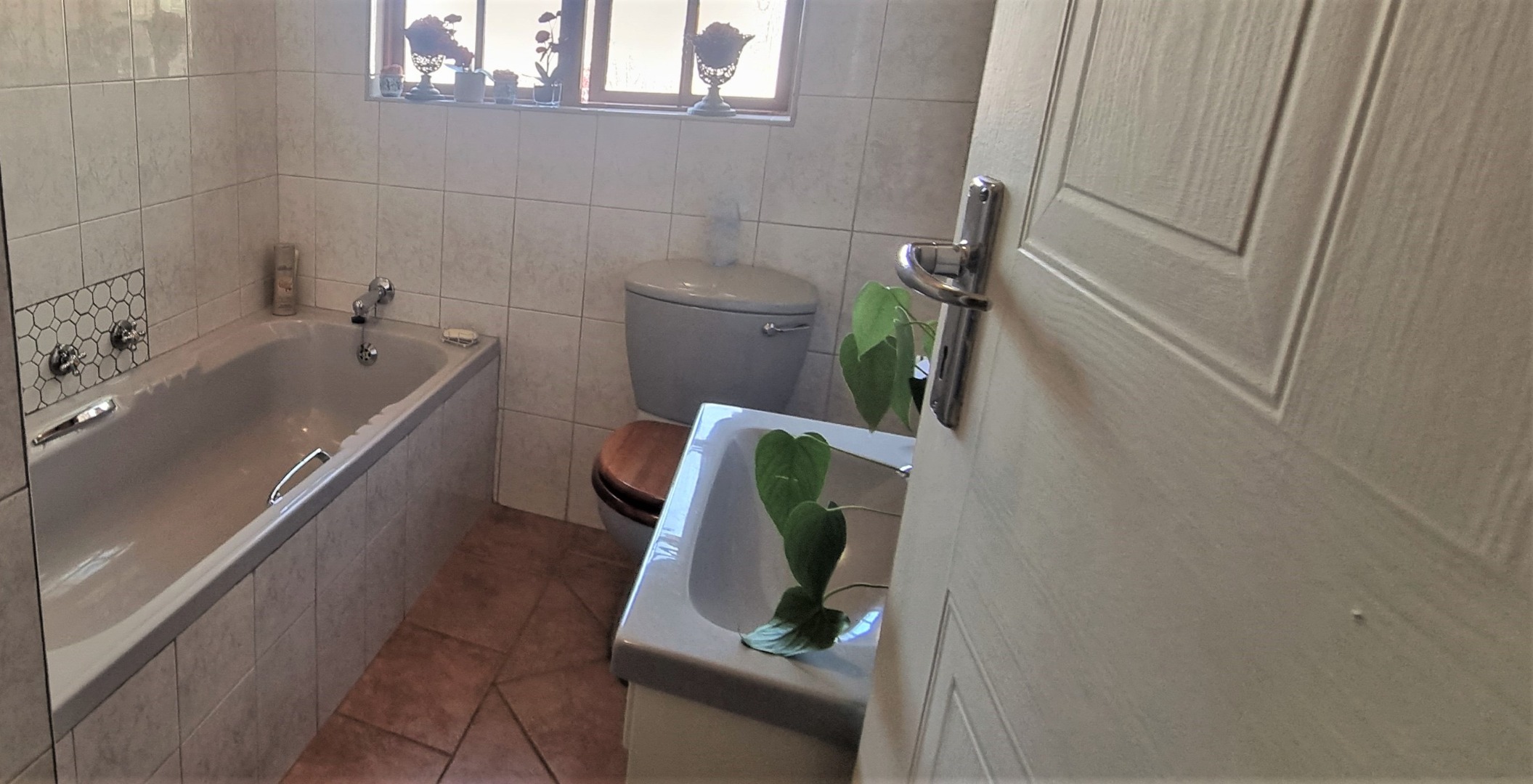 The spacious main bedroom is a tranquil retreat, complete with air-conditioning, carpeting, built-in cupboards, and a luxurious en-suite bathroom offering a shower, bath, toilet, and basin. The two additional bedrooms are also comfortably sized with built-in cupboards and door-to-door carpeting, sharing a second full bathroom with a bath, toilet, and basin. A linen cupboard in the hallway adds to the home’s smart storage solutions.