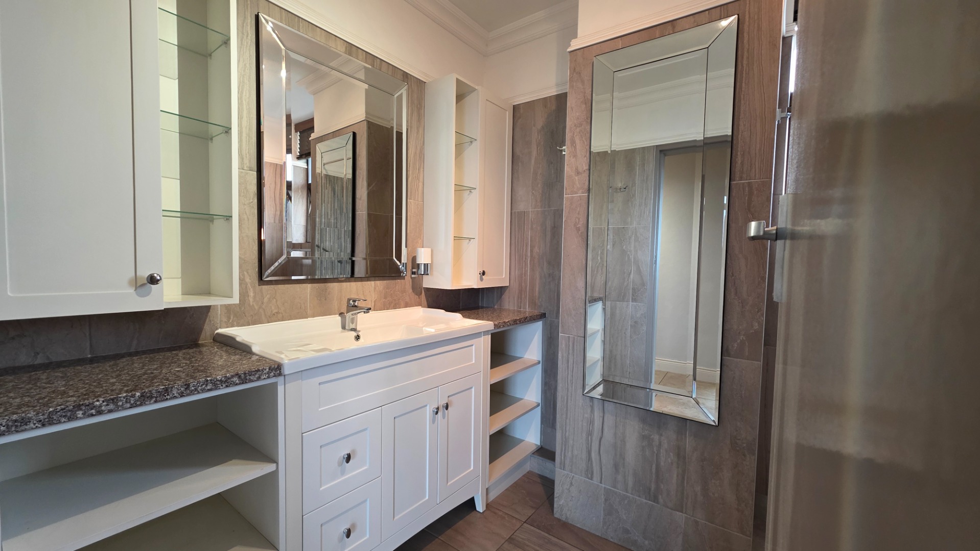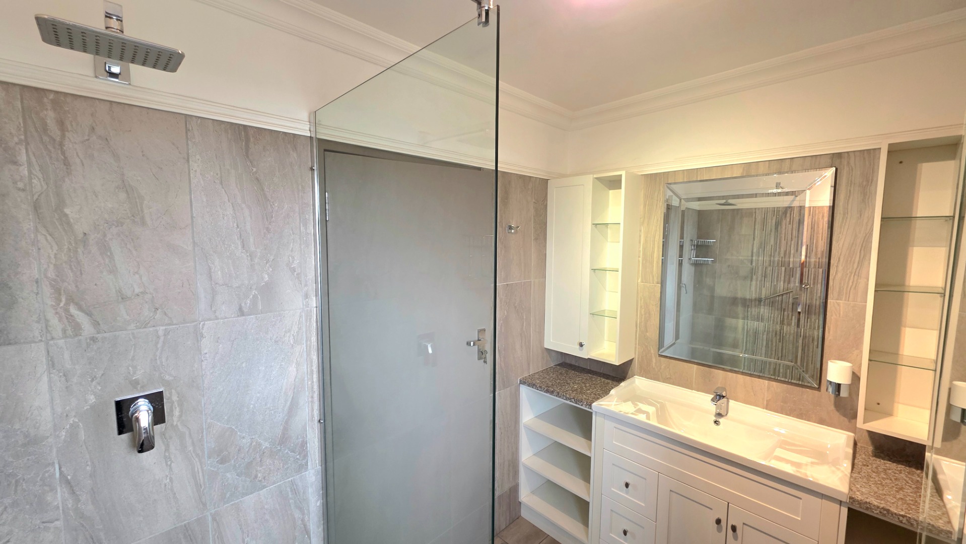 The first bathroom is fitted with a shower and basin with ample vanity storage.
