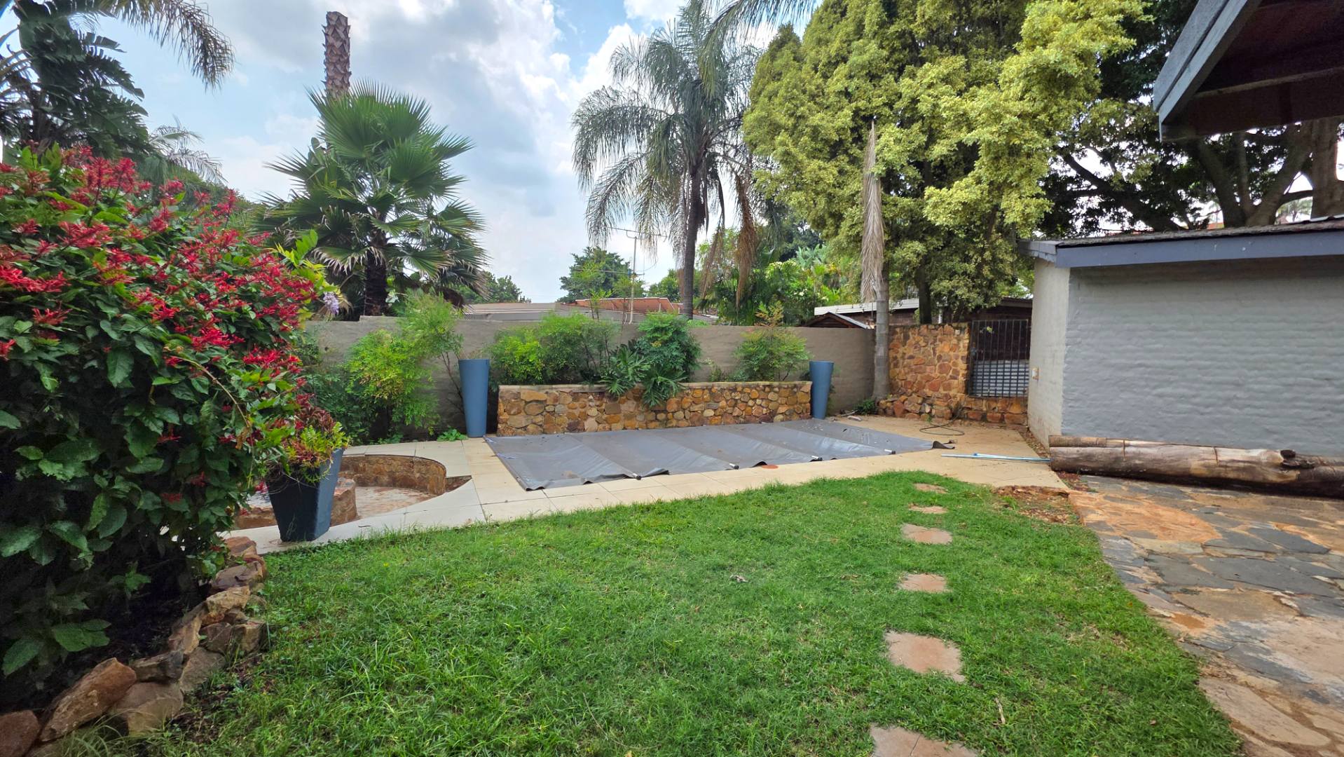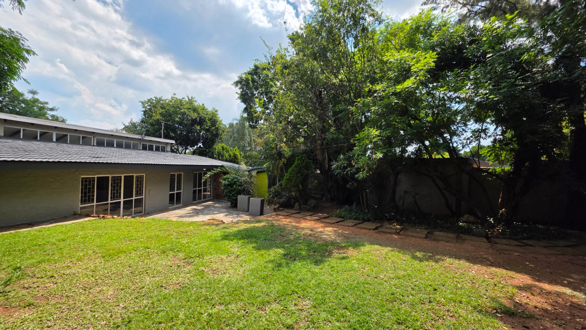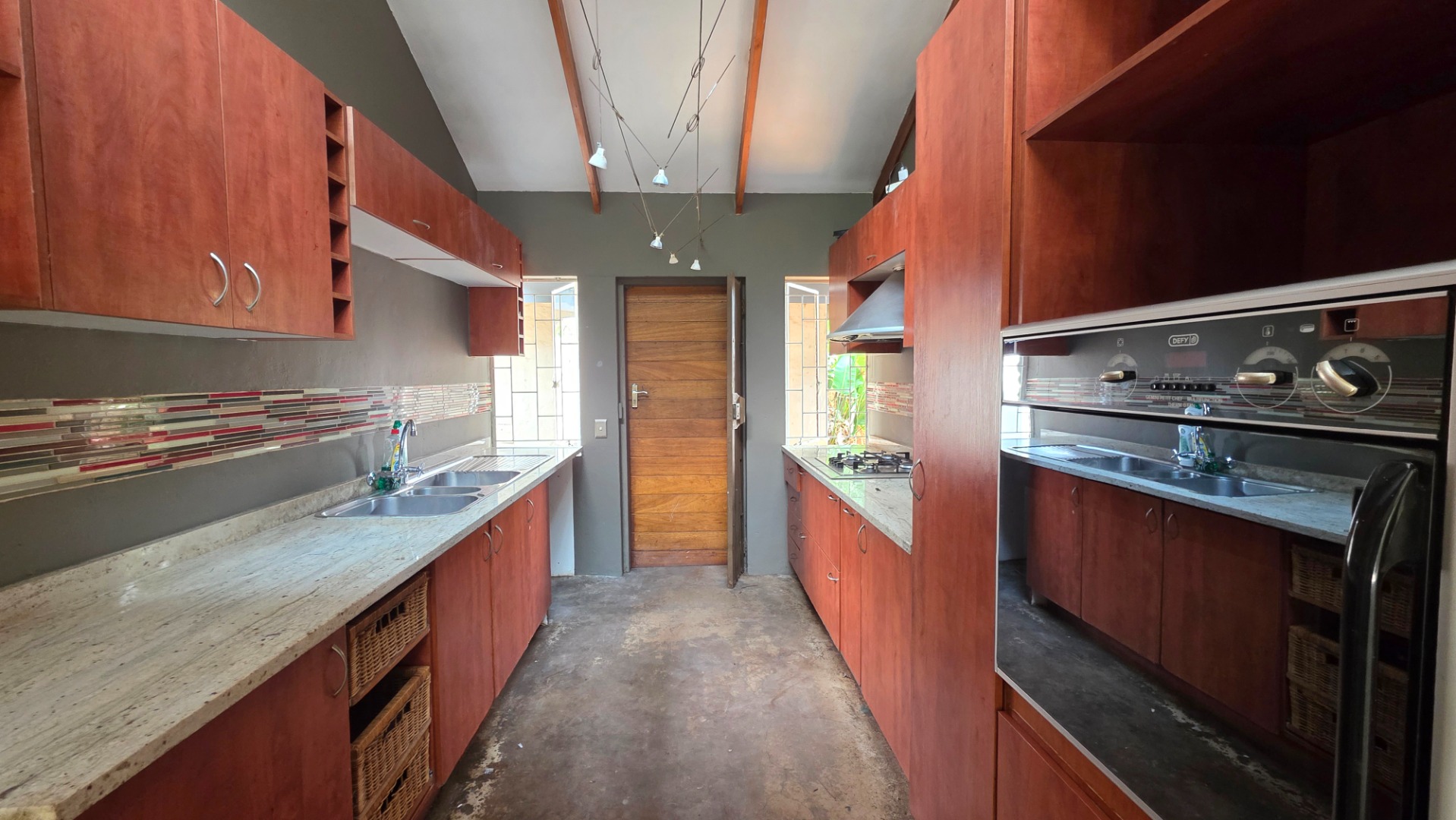 Situated in the desirable suburb Murrayfield, Pretoria, this expansive residence offers a tranquil living environment ideal for families seeking space and comfort. This substantial property, spanning 450 square metres, presents four bedrooms and three bathrooms, including two en-suites, providing ample accommodation. The interior boasts a distinctive character, featuring high vaulted wooden ceilings with exposed beams and a prominent stone fireplace, creating an inviting atmosphere within the lounge and family TV room. The functional galley-style kitchen is equipped with laminated cherrywood cabinetry, stone countertops, a built-in eye-level oven, gas hob, and extractor fan, complemented by a double sink. There is a large outside laundry & storage room across the kitchen courtyard.