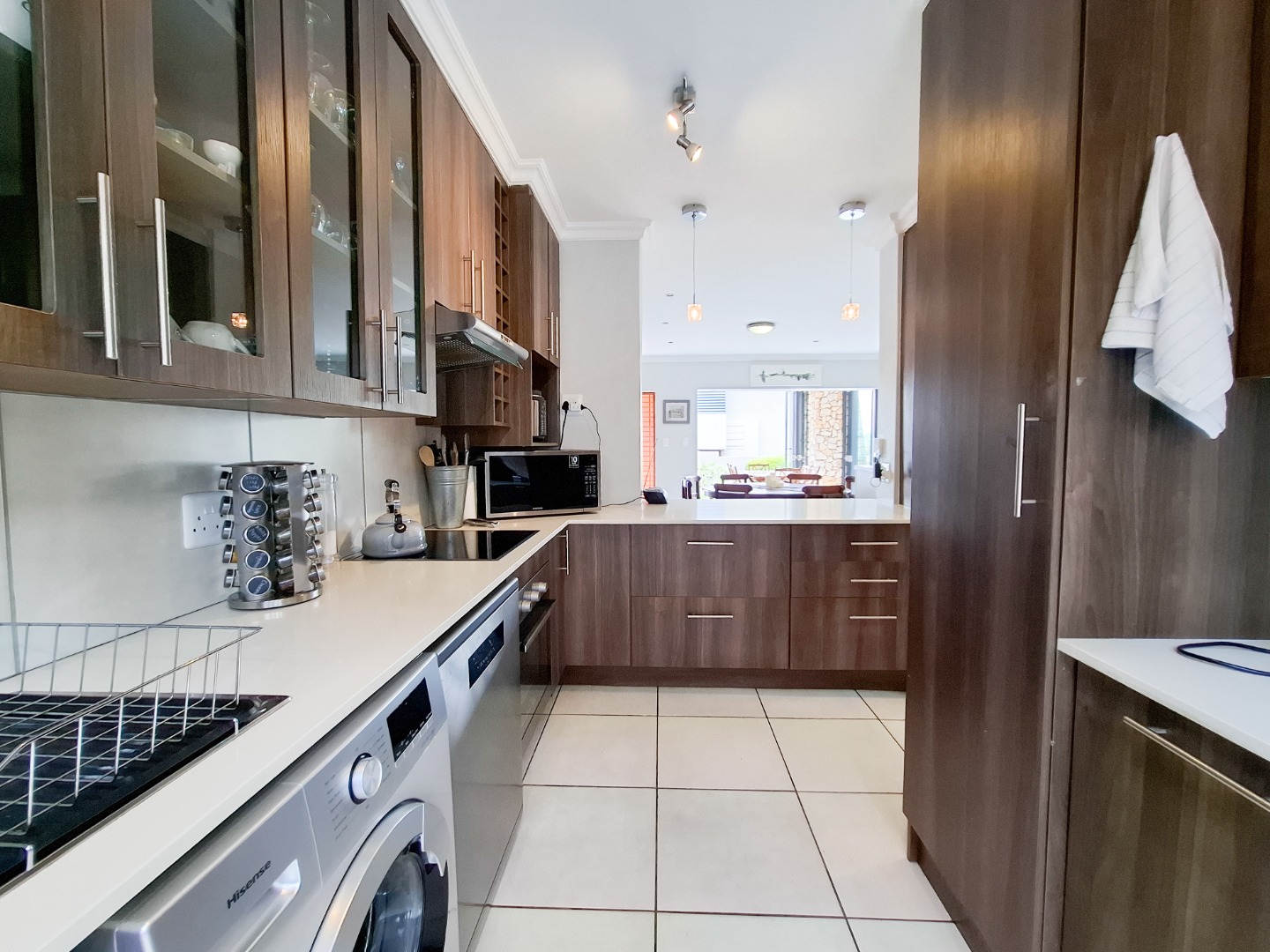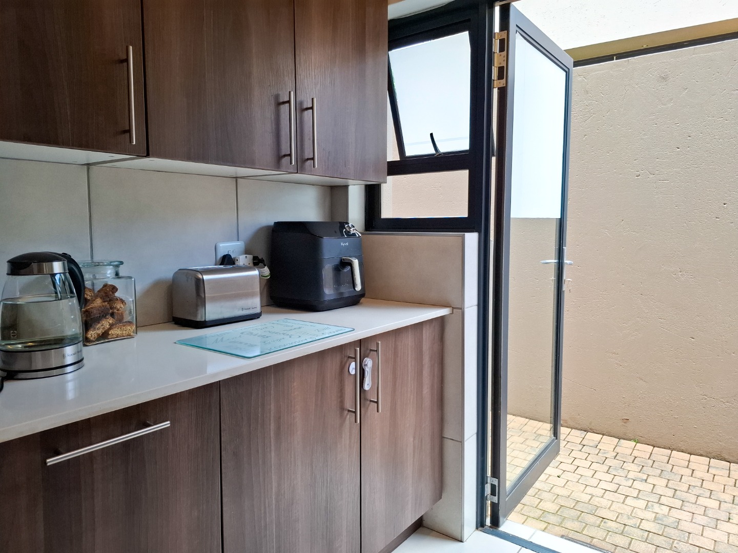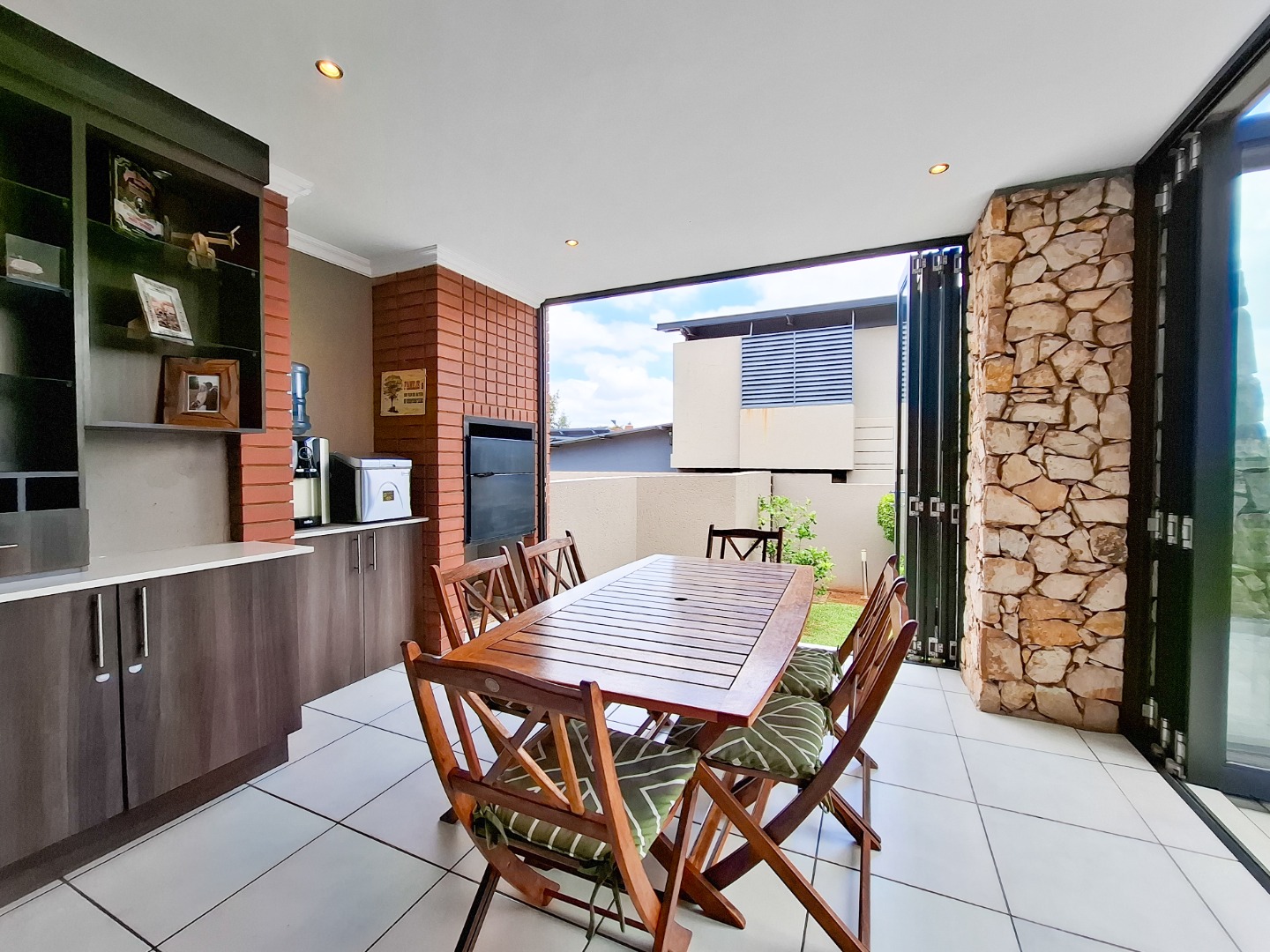 The indoor-outdoor flow is a highlight, with direct access to an inviting outdoor entertainment area. This covered space boasts a built-in braai and custom cabinetry, perfect for hosting gatherings. Large bi-fold doors connect this area to a small garden, while an open patio offers additional outdoor enjoyment. Pets are allowed, making it ideal for animal lovers.
