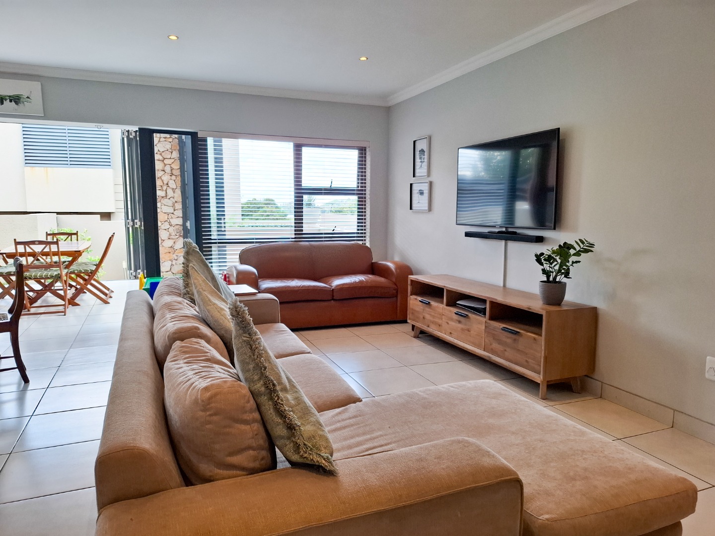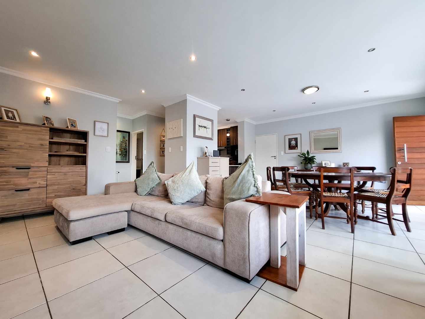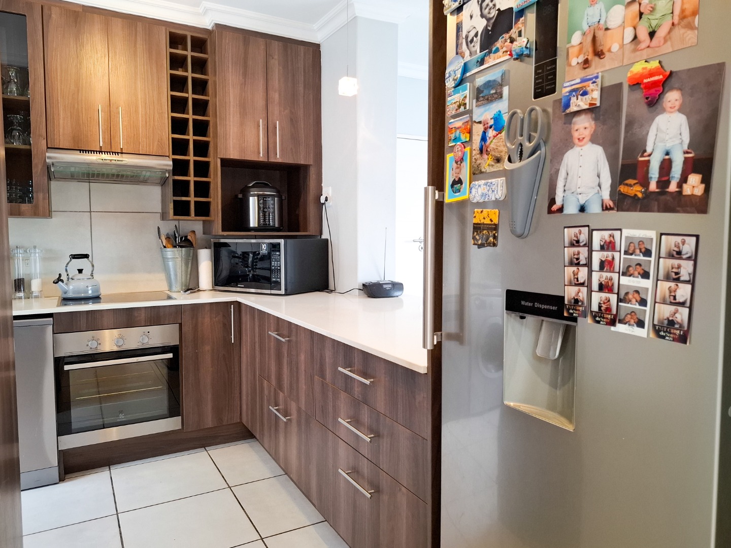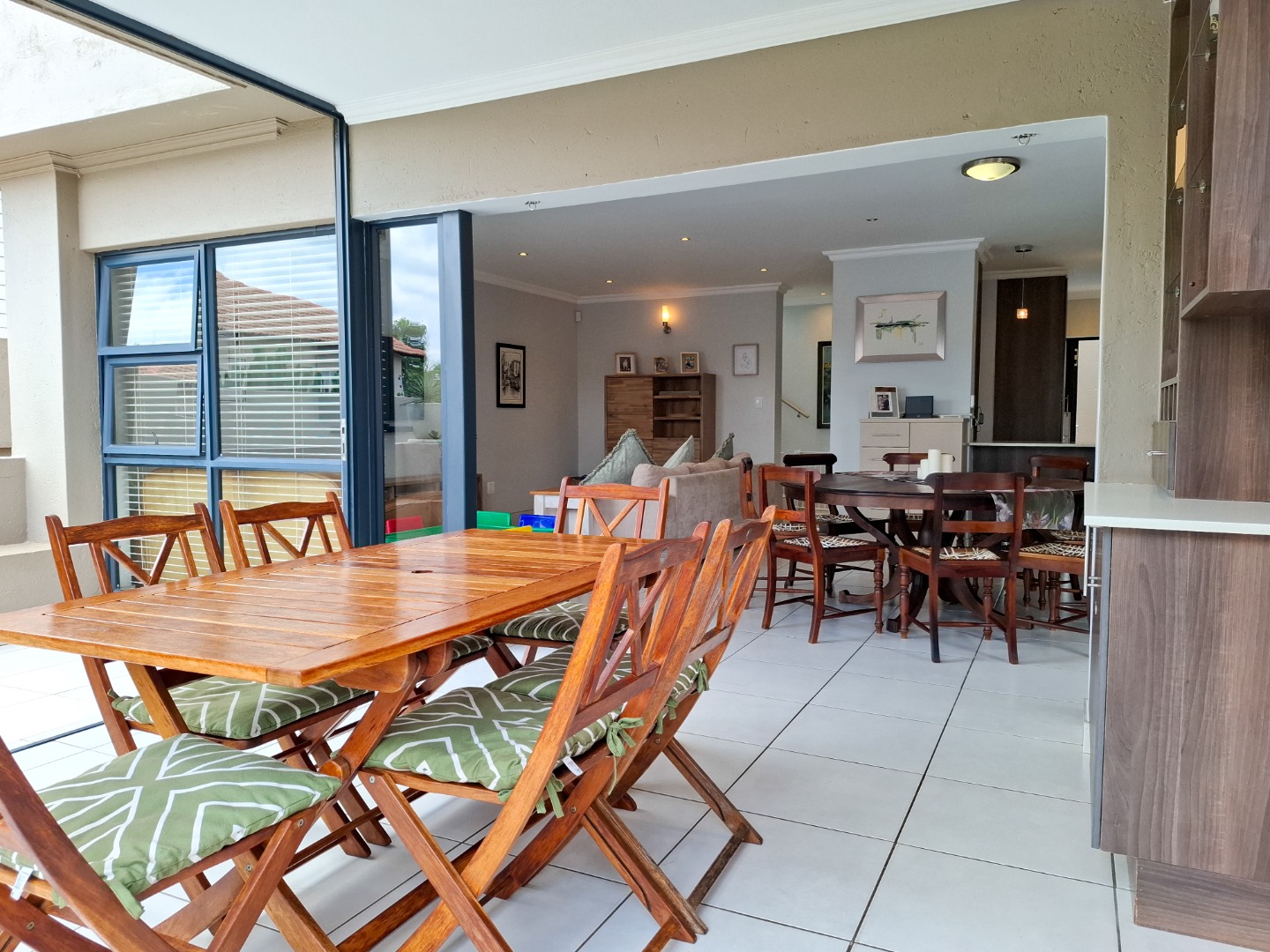The indoor-outdoor flow is a highlight, with direct access to an inviting outdoor entertainment area. This covered space boasts a built-in braai and custom cabinetry, perfect for hosting gatherings. Large bi-fold doors connect this area to a small garden, while an open patio offers additional outdoor enjoyment. Pets are allowed, making it ideal for animal lovers.