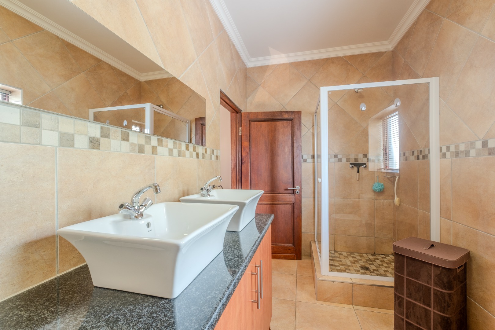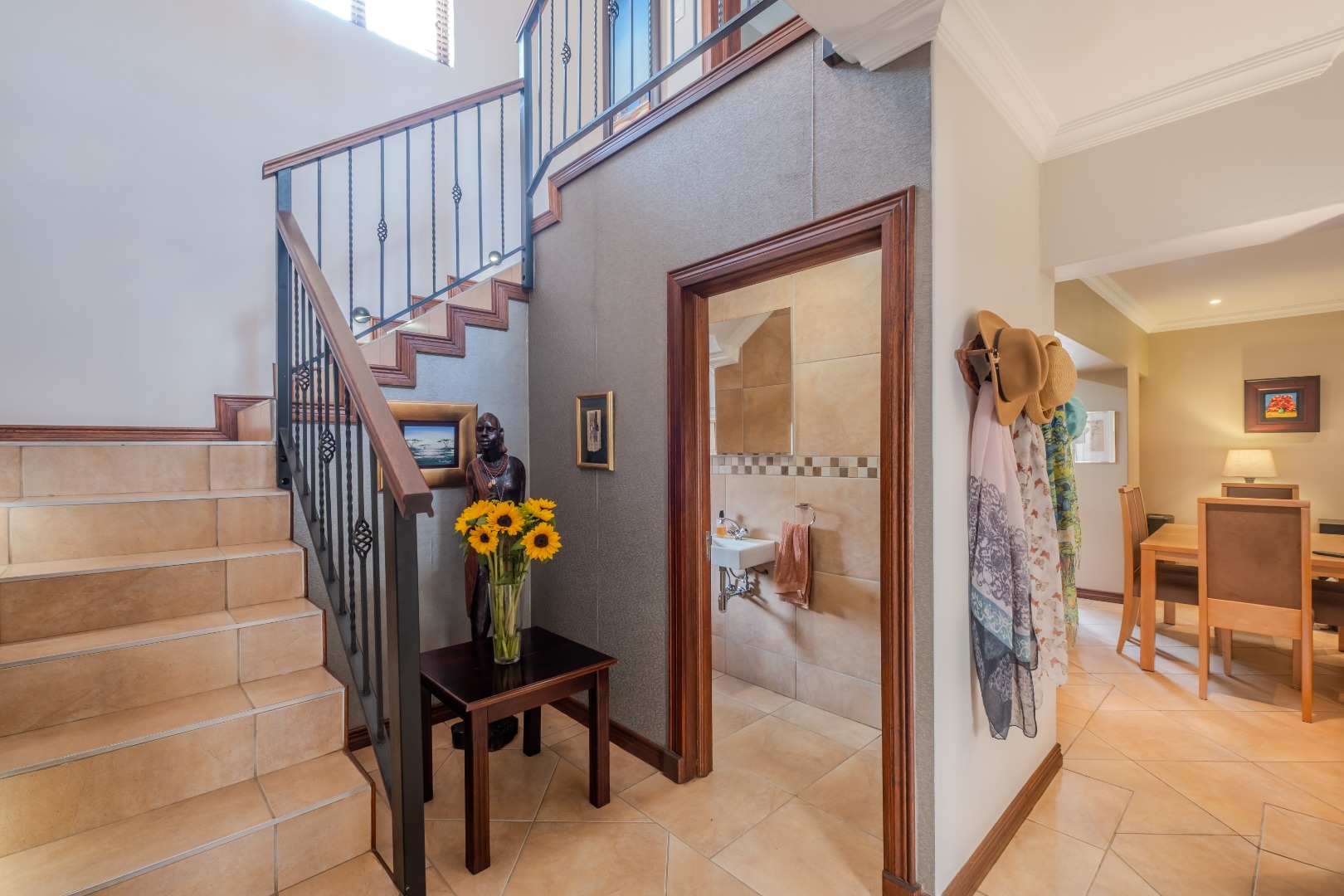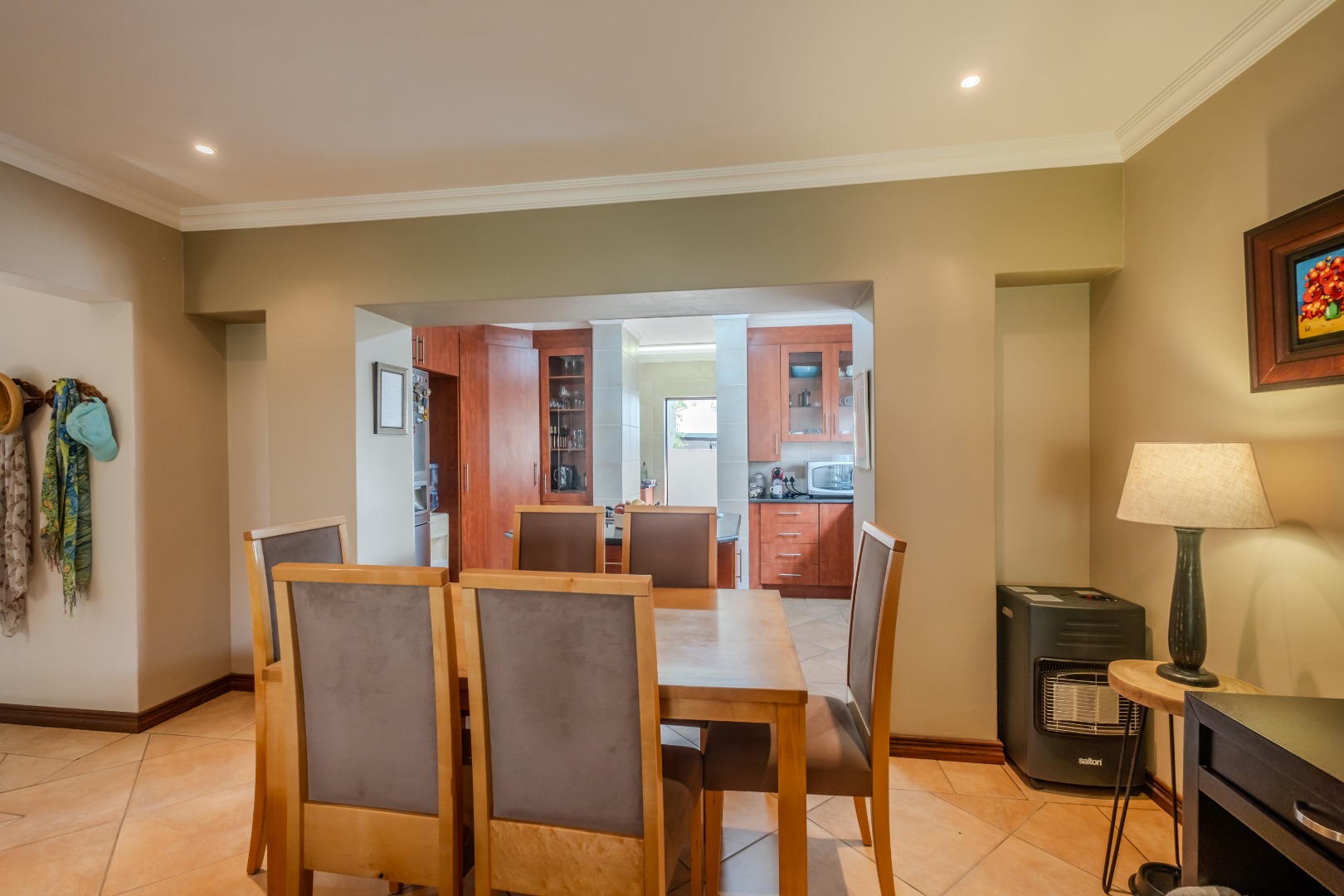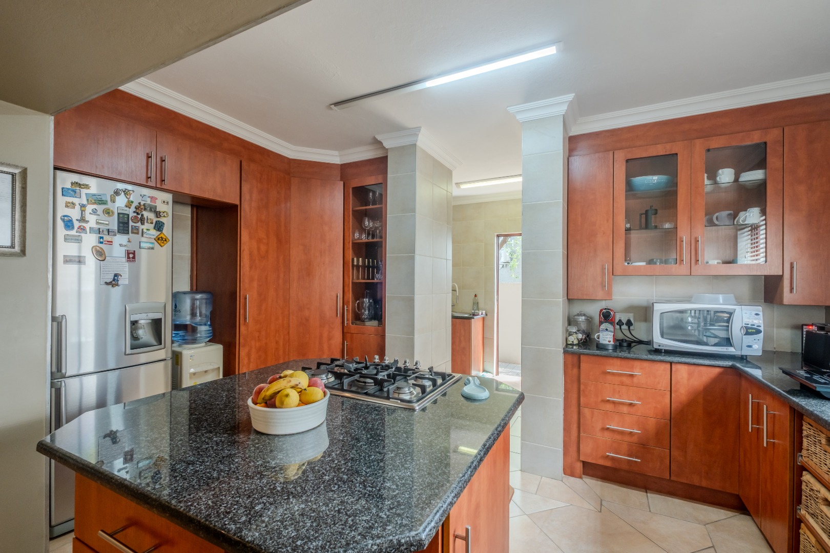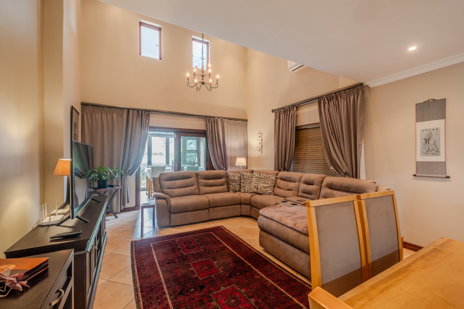 Step inside to an elegant entrance hall that leads into the heart of the home: an open-plan lounge and dining area. Characterized by high ceilings and abundant natural light, this space flows seamlessly into the kitchen and a dedicated area with a built-in braai , perfect for both relaxation and entertaining. A convenient guest ensuite bedroom and a study are also located on the ground floor. The kitchen boasts ample cupboards, a gas stove, granite counter tops and space for a double fridge. The separate scullery can accommodate all your appliances.