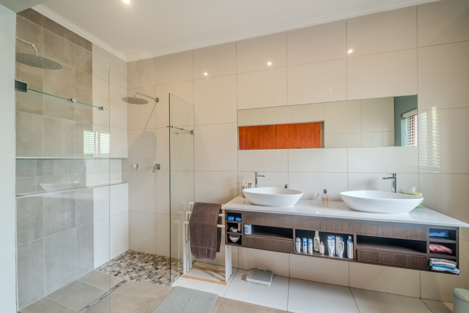 Ensuring peace of mind, the residence is situated within a security estate with 24-hour security and a security gate. Sustainability features include solar panels, a battery inverter, and water tank, contributing to reduced utility costs and enhanced self-sufficiency.