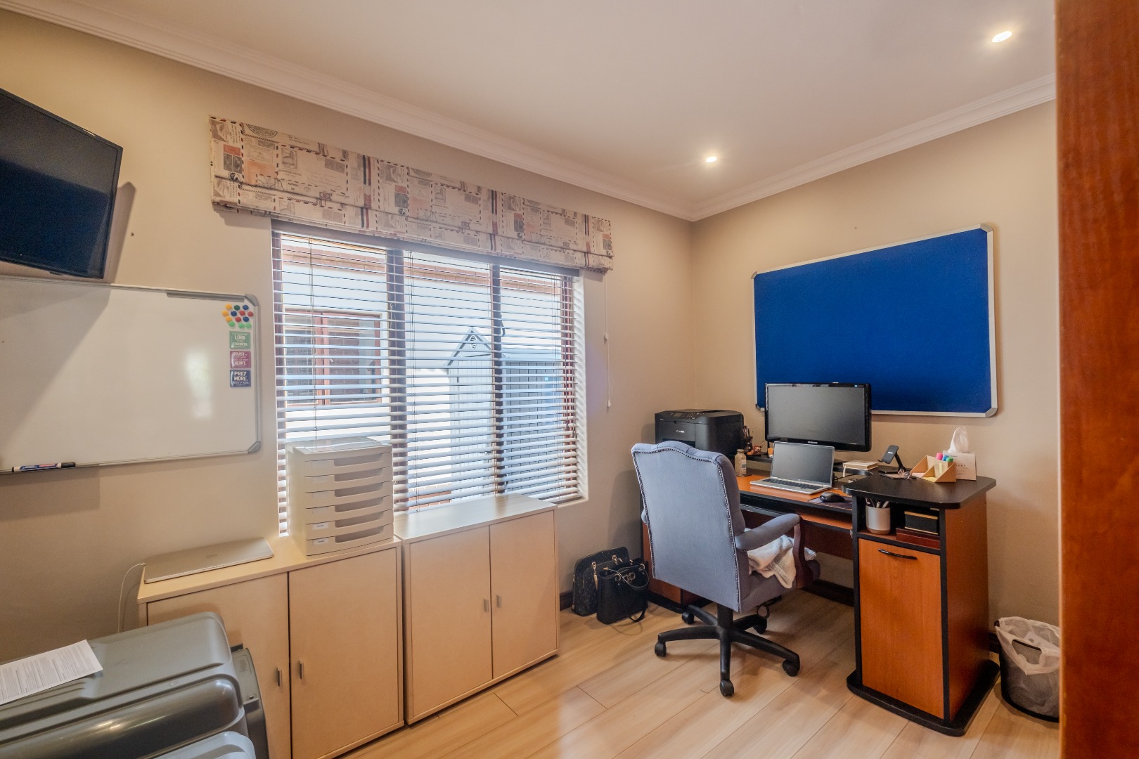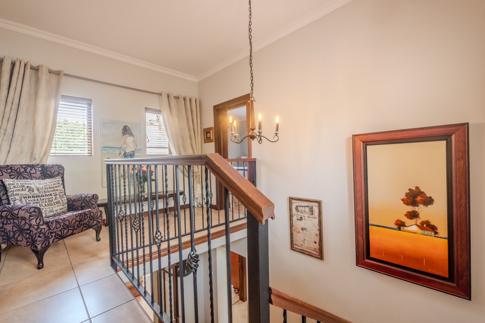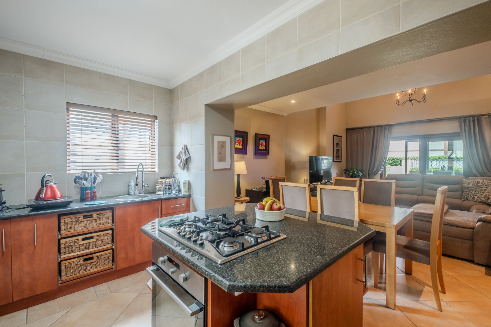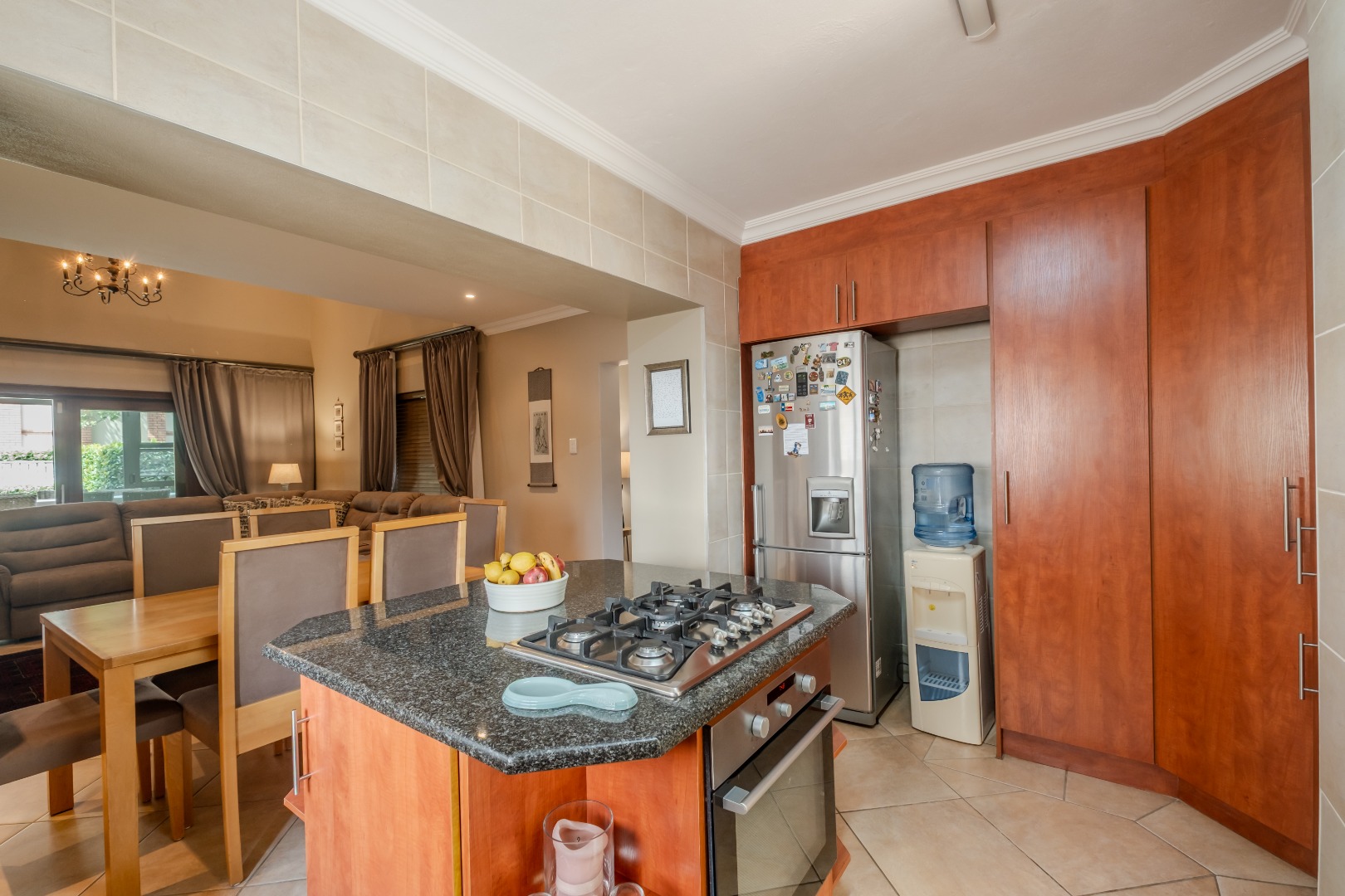 Step inside to an elegant entrance hall that leads into the heart of the home: an open-plan lounge and dining area. Characterized by high ceilings and abundant natural light, this space flows seamlessly into the kitchen and a dedicated area with a built-in braai , perfect for both relaxation and entertaining. A convenient guest ensuite bedroom and a study are also located on the ground floor. The kitchen boasts ample cupboards, a gas stove, granite counter tops and space for a double fridge. The separate scullery can accommodate all your appliances.