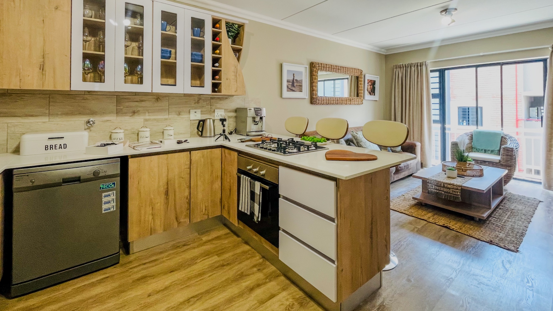 This 90 square meter apartment is meticulously designed, showcasing an open-plan living area that seamlessly integrates a state-of-the-art kitchen. The kitchen is a culinary delight, equipped with a gas hob, oven, and integrated dishwasher, all set against a backdrop of stylish two-tone cabinetry and elegant wood-look flooring. A functional breakfast bar enhances the space, while large sliding doors invite abundant natural light and provide direct access to a private balcony, perfect for alfresco moments.