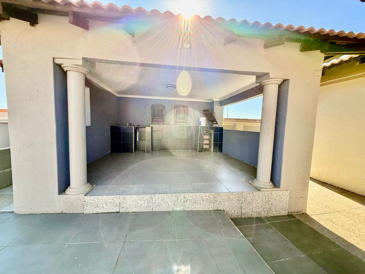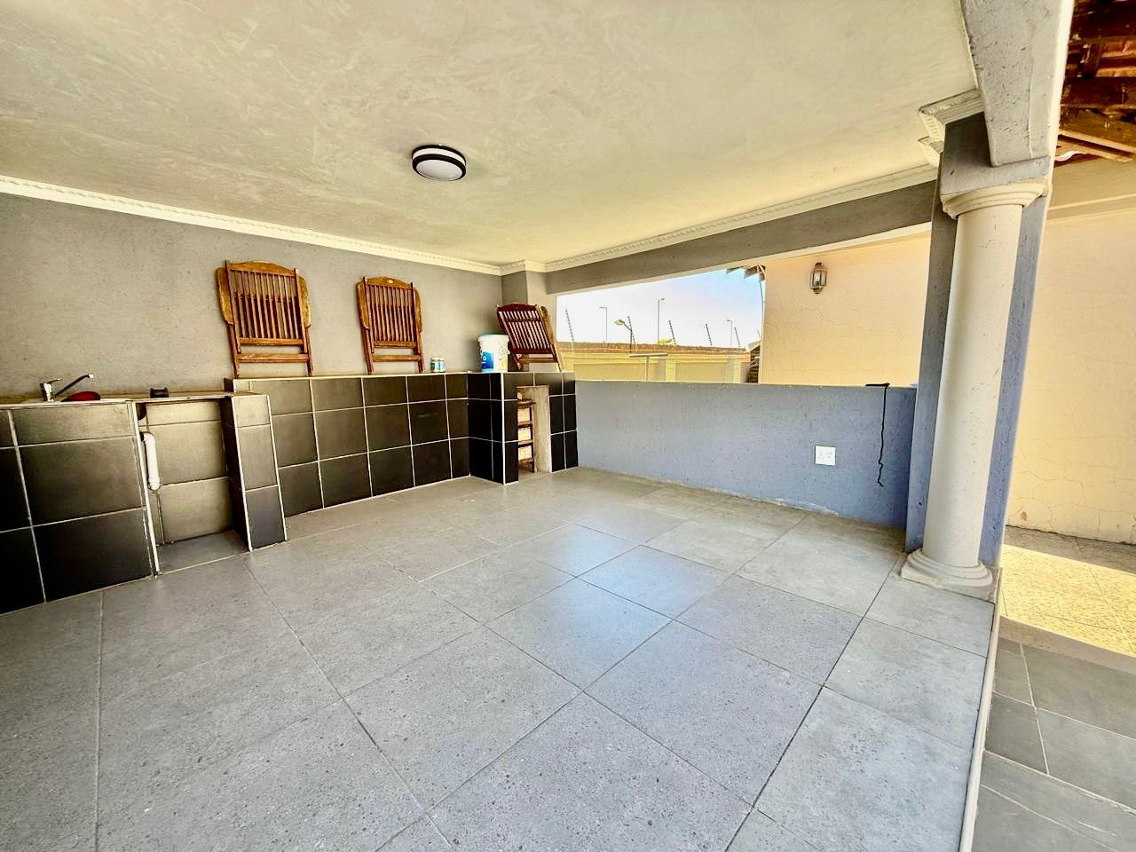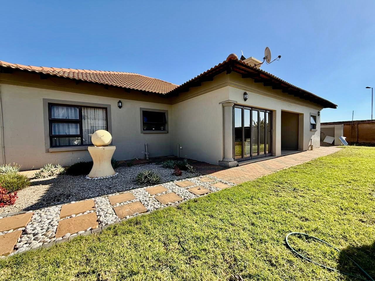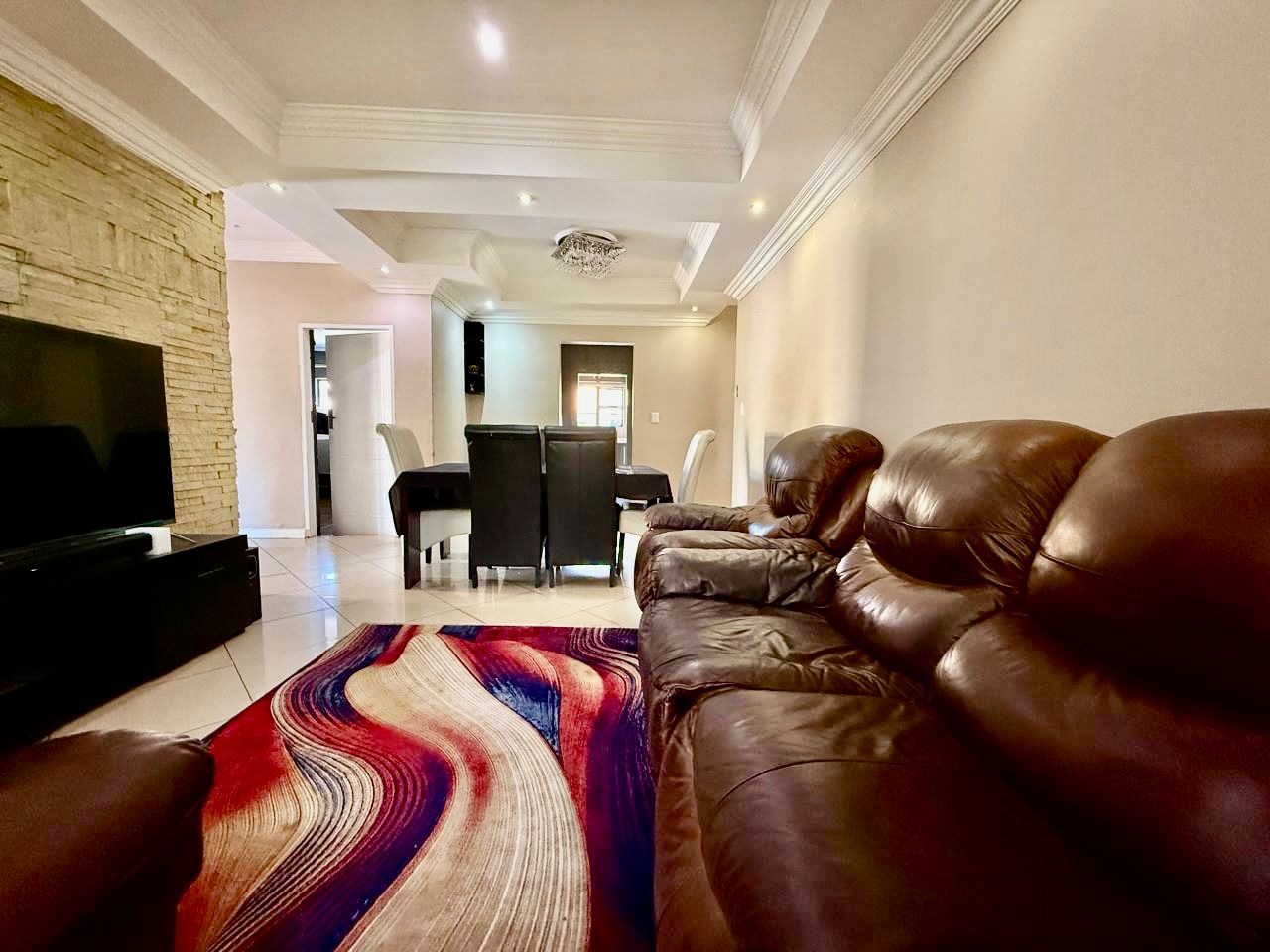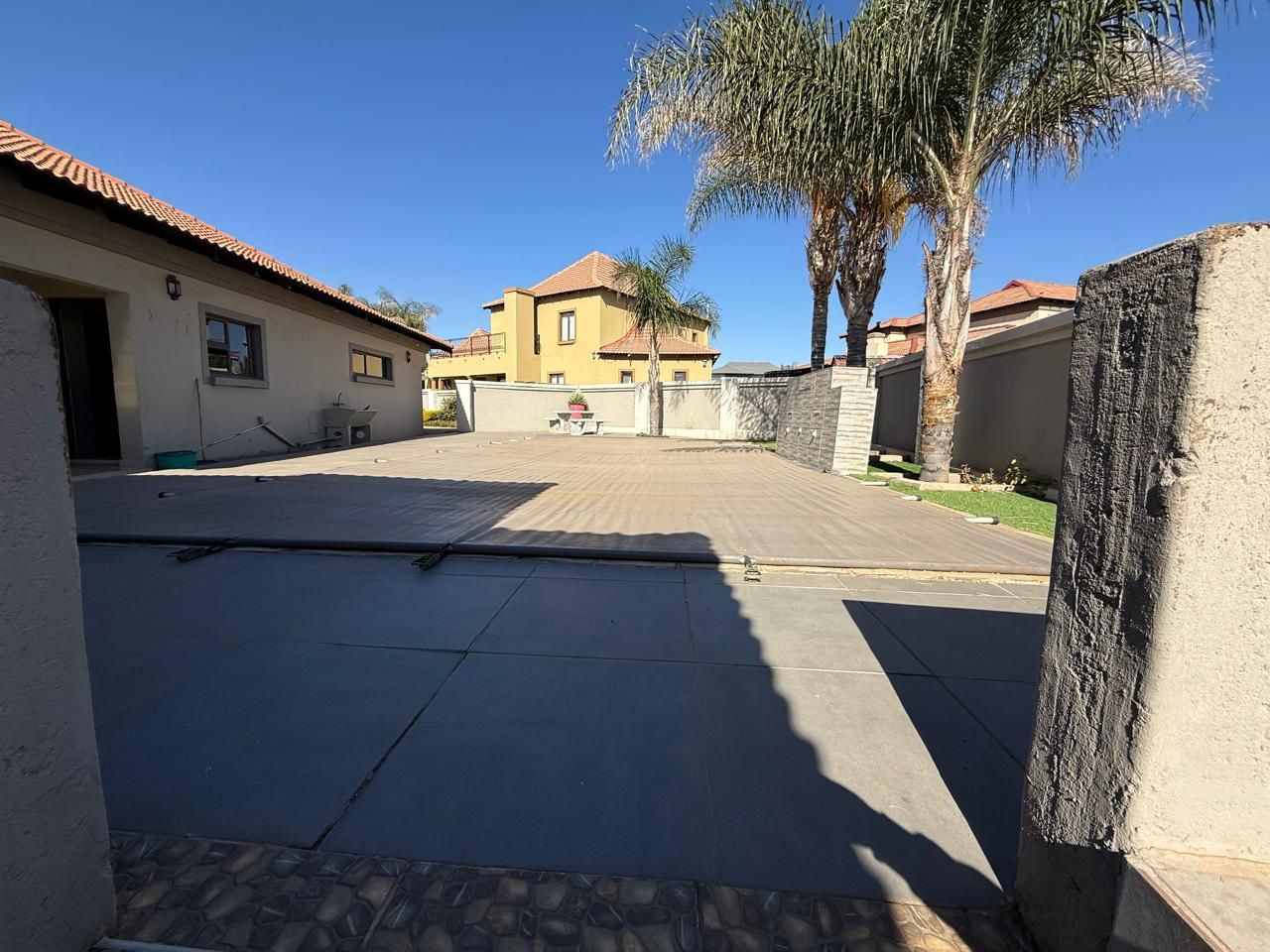 This modern single-story residence in Savannah Country Estate presents an impressive façade, characterised by a Mediterranean/Tuscan-inspired design with a clay tile roof and a light stucco exterior. A well-maintained paved driveway leads to a double garage featuring contemporary wooden-look doors, complemented by a welcoming covered entrance framed by architectural columns. The minimalist front garden ensures low maintenance, contributing to the property's refined curb appeal. Upon entry, the residence unfolds into a spacious open-plan living and dining area, distinguished by decorative tray ceilings, elegant crown moulding, and sophisticated recessed lighting, creating an inviting ambiance. The living room is further enhanced by a stylish stone accent wall, providing a focal point of contemporary design. Durable tiled flooring extends throughout these communal spaces, offering both aesthetic appeal and practical maintenance. The galley-style kitchen is a testament to modern design and functionality, equipped with contemporary wood-grain cabinetry that offers extensive storage, integrated stainless steel appliances including a built-in oven and microwave, and durable granite-style countertops. Clean tiled floors and a practical layout complete this culinary space, which seamlessly connects to the adjacent dining area, facilitating effortless entertaining. The property comprises four generously proportioned bedrooms and three well-appointed bathrooms, including a private en-suite, ensuring comfort and privacy for all occupants. Each space is designed to offer a serene retreat within the home. The exterior of the property is designed for both leisure and practicality. Outdoor living is facilitated by a private patio, ideal for relaxation and entertaining, which overlooks a meticulously maintained garden and a refreshing swimming pool, perfect for warm South African days. The property also benefits from a double garage, providing secure parking for two vehicles, complemented by additional paved parking on the driveway. Practical amenities include a dedicated laundry area and convenient outside toilets, enhancing the functionality of this family home. Situated within a secure estate, residents benefit from 24-hour security and controlled access, fostering a tranquil and protected living environment. The estate also offers the advantages of country living and access to a country club, enhancing the lifestyle appeal of this Pretoria address. Savannah Country Estate, located in Pretoria, South Africa, offers an idyllic setting for discerning homeowners seeking a blend of serene country living and convenient access to urban amenities. This esteemed security estate provides a secure and family-friendly environment. Key Features: * Four Bedrooms, Three Bathrooms (One En-suite) * Spacious Open-Plan Living and Dining Areas * Modern Galley Kitchen with Integrated Appliances * Double Garage and Paved Driveway * Private Patio, Garden, and Swimming Pool * Laundry Facilities and Outside Toilets * Located within a Secure Estate with 24-Hour Security * Access to Country Club Amenities