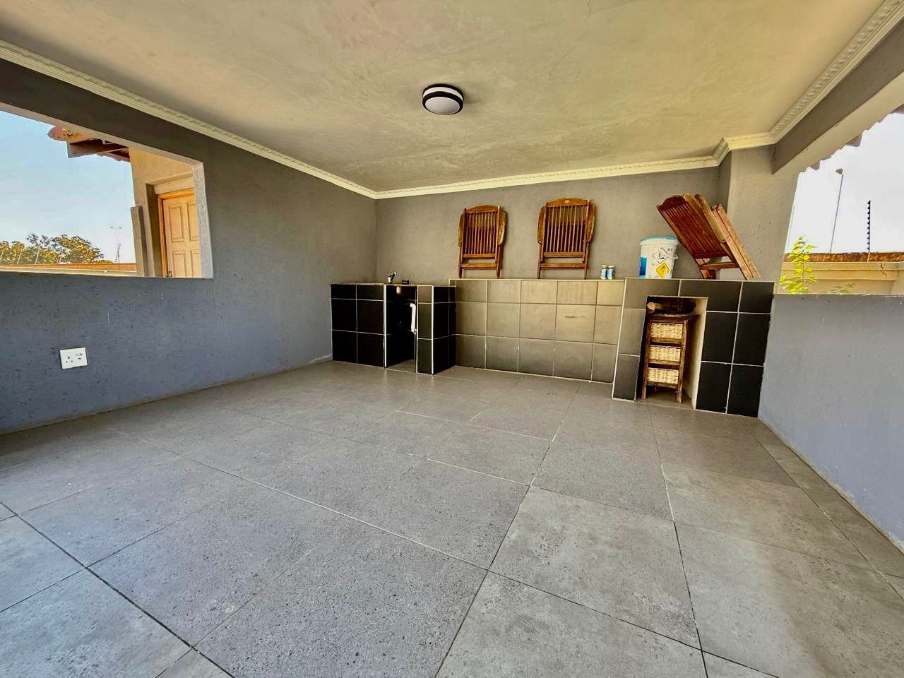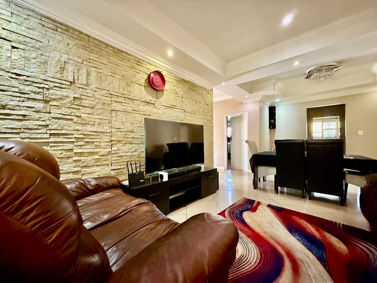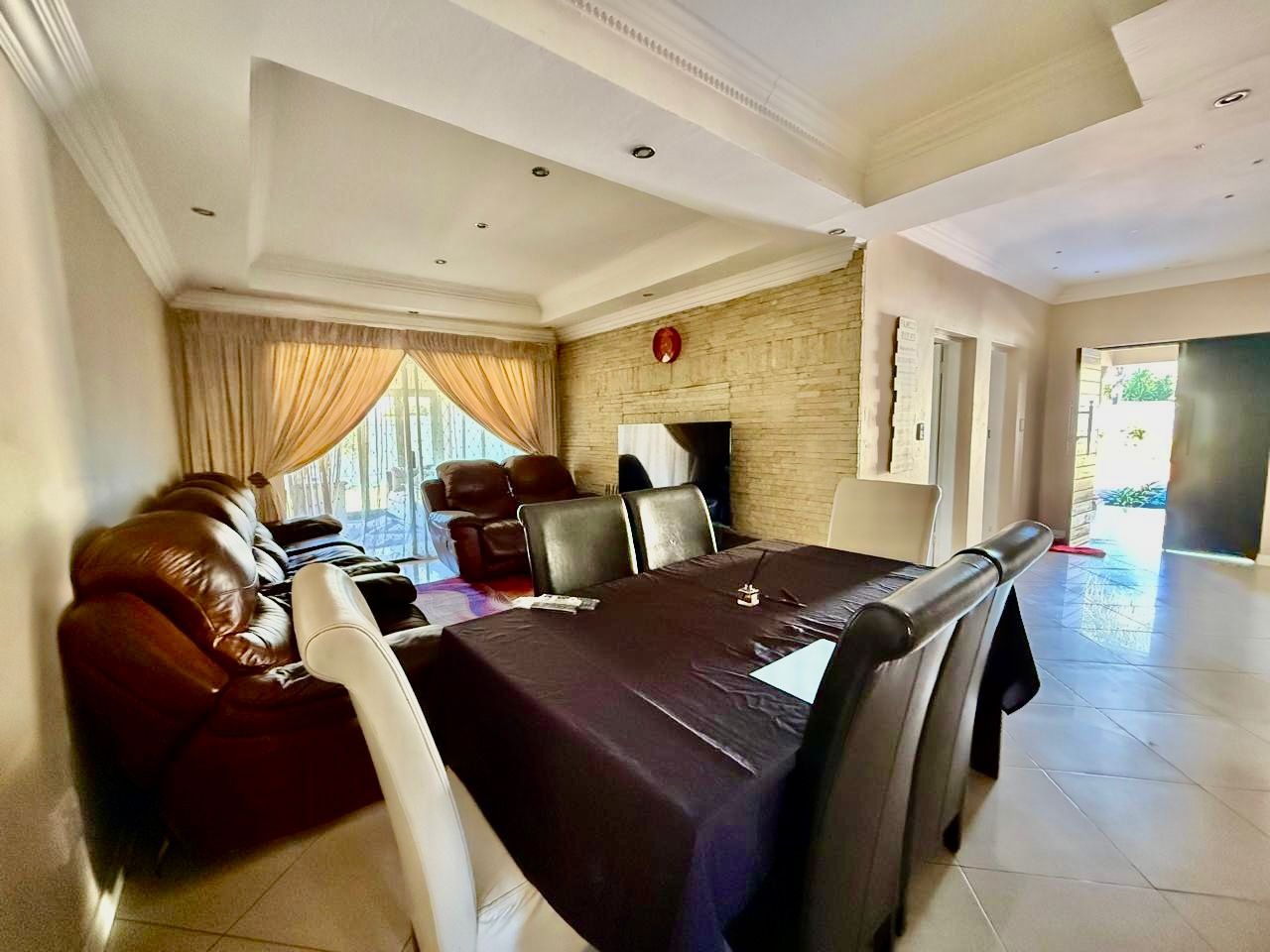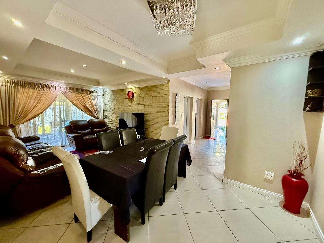This modern single-story residence in Savannah Country Estate presents an impressive façade, characterised by a Mediterranean/Tuscan-inspired design with a clay tile roof and a light stucco exterior. A well-maintained paved driveway leads to a double garage featuring contemporary wooden-look doors, complemented by a welcoming covered entrance framed by architectural columns. The minimalist front garden ensures low maintenance, contributing to the property's refined curb appeal. Upon entry, the residence unfolds into a spacious open-plan living and dining area, distinguished by decorative tray ceilings, elegant crown moulding, and sophisticated recessed lighting, creating an inviting ambiance. The living room is further enhanced by a stylish stone accent wall, providing a focal point of contemporary design. Durable tiled flooring extends throughout these communal spaces, offering both aesthetic appeal and practical maintenance. The galley-style kitchen is a testament to modern design and functionality, equipped with contemporary wood-grain cabinetry that offers extensive storage, integrated stainless steel appliances including a built-in oven and microwave, and durable granite-style countertops. Clean tiled floors and a practical layout complete this culinary space, which seamlessly connects to the adjacent dining area, facilitating effortless entertaining. The property comprises four generously proportioned bedrooms and three well-appointed bathrooms, including a private en-suite, ensuring comfort and privacy for all occupants. Each space is designed to offer a serene retreat within the home. The exterior of the property is designed for both leisure and practicality. Outdoor living is facilitated by a private patio, ideal for relaxation and entertaining, which overlooks a meticulously maintained garden and a refreshing swimming pool, perfect for warm South African days. The property also benefits from a double garage, providing secure parking for two vehicles, complemented by additional paved parking on the driveway. Practical amenities include a dedicated laundry area and convenient outside toilets, enhancing the functionality of this family home. Situated within a secure estate, residents benefit from 24-hour security and controlled access, fostering a tranquil and protected living environment. The estate also offers the advantages of country living and access to a country club, enhancing the lifestyle appeal of this Pretoria address. Savannah Country Estate, located in Pretoria, South Africa, offers an idyllic setting for discerning homeowners seeking a blend of serene country living and convenient access to urban amenities. This esteemed security estate provides a secure and family-friendly environment. Key Features: * Four Bedrooms, Three Bathrooms (One En-suite) * Spacious Open-Plan Living and Dining Areas * Modern Galley Kitchen with Integrated Appliances * Double Garage and Paved Driveway * Private Patio, Garden, and Swimming Pool * Laundry Facilities and Outside Toilets * Located within a Secure Estate with 24-Hour Security * Access to Country Club Amenities