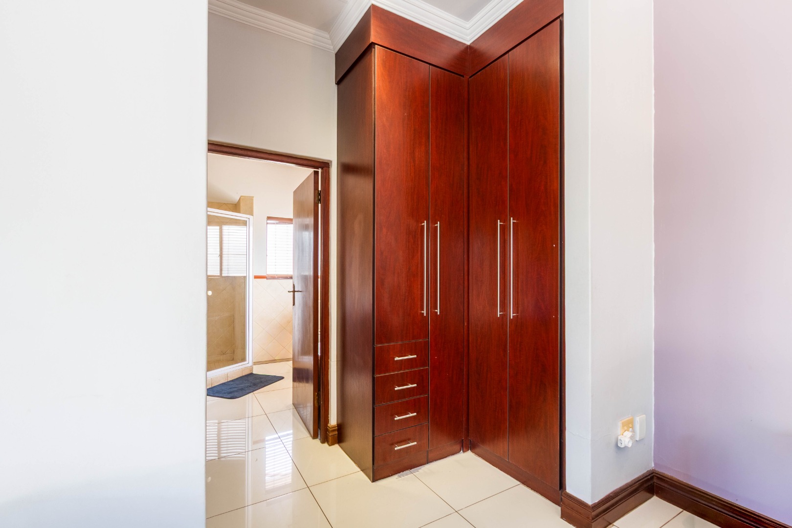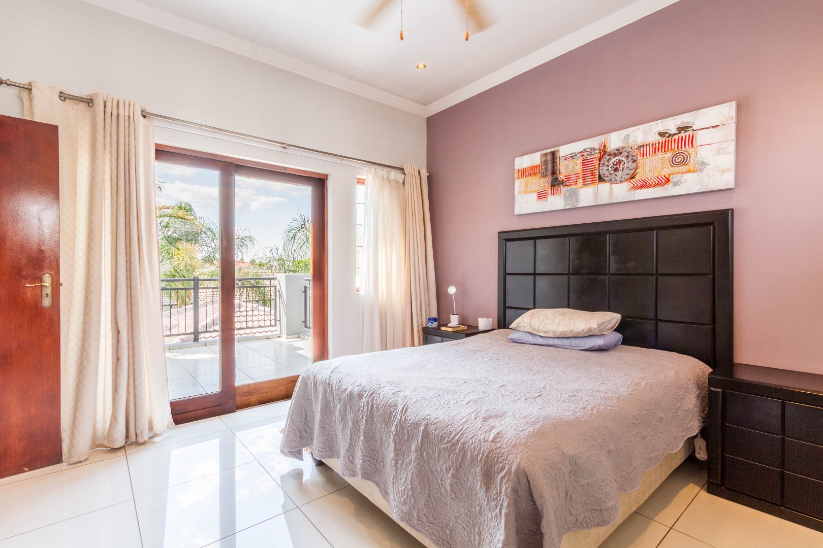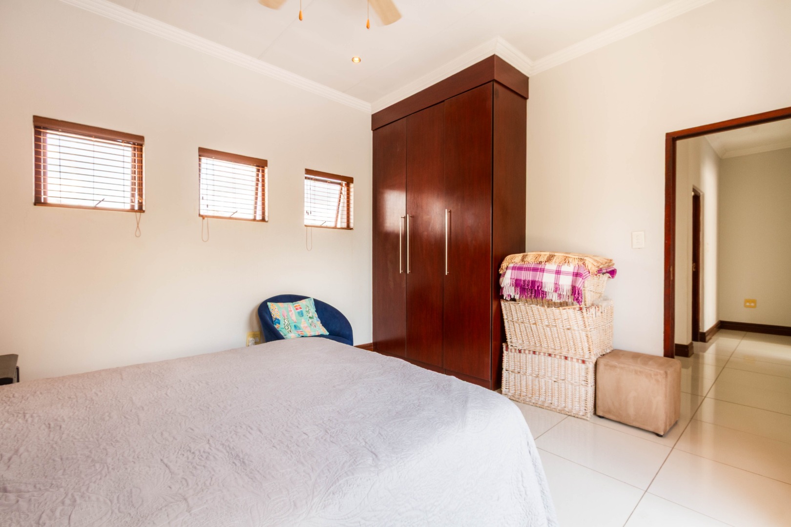 Downstairs, the spacious main bedroom is en-suite with ample cupboard space and opens onto the outside area.